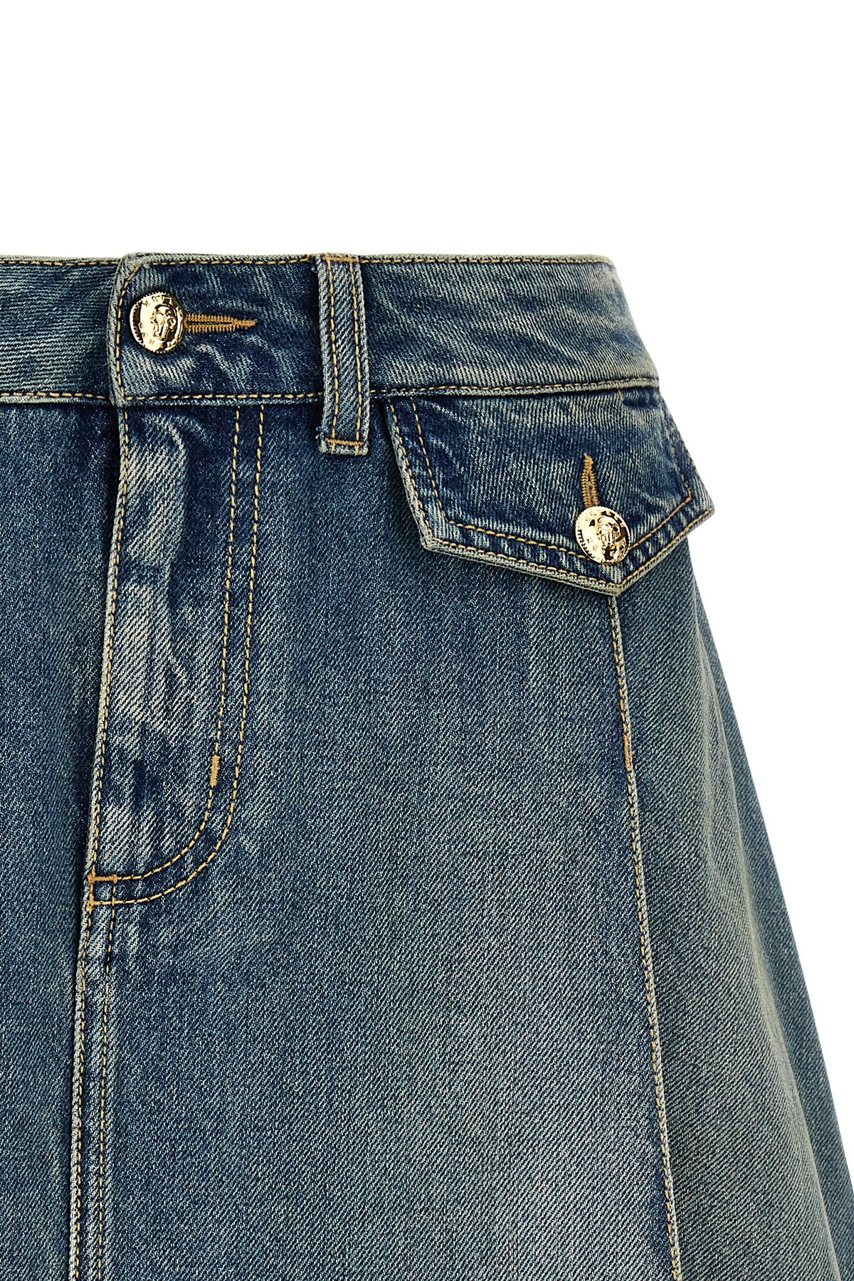 Flounced mini skirt in delave cotton denim with zip and button closure, pockets, and back leather logo tag.