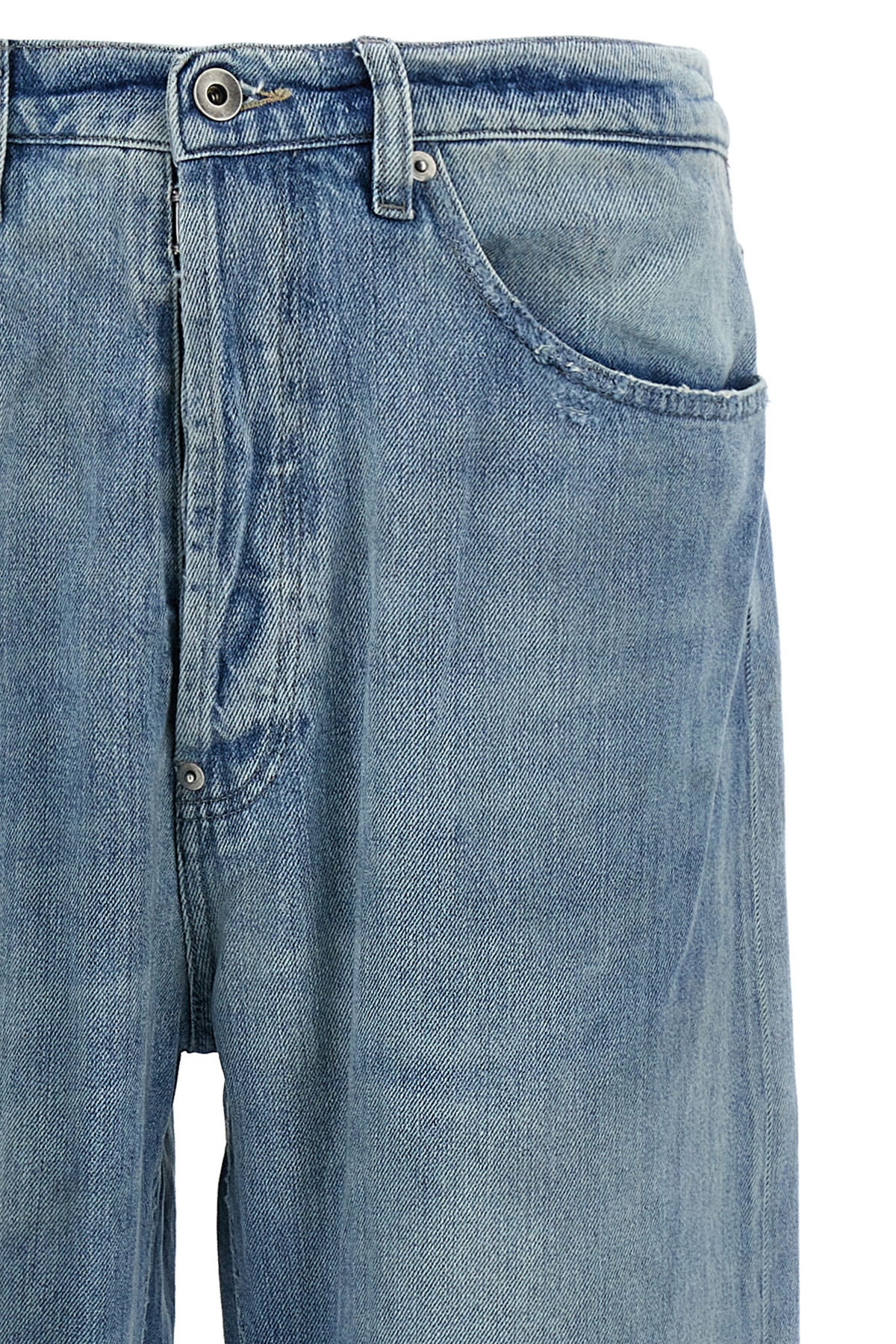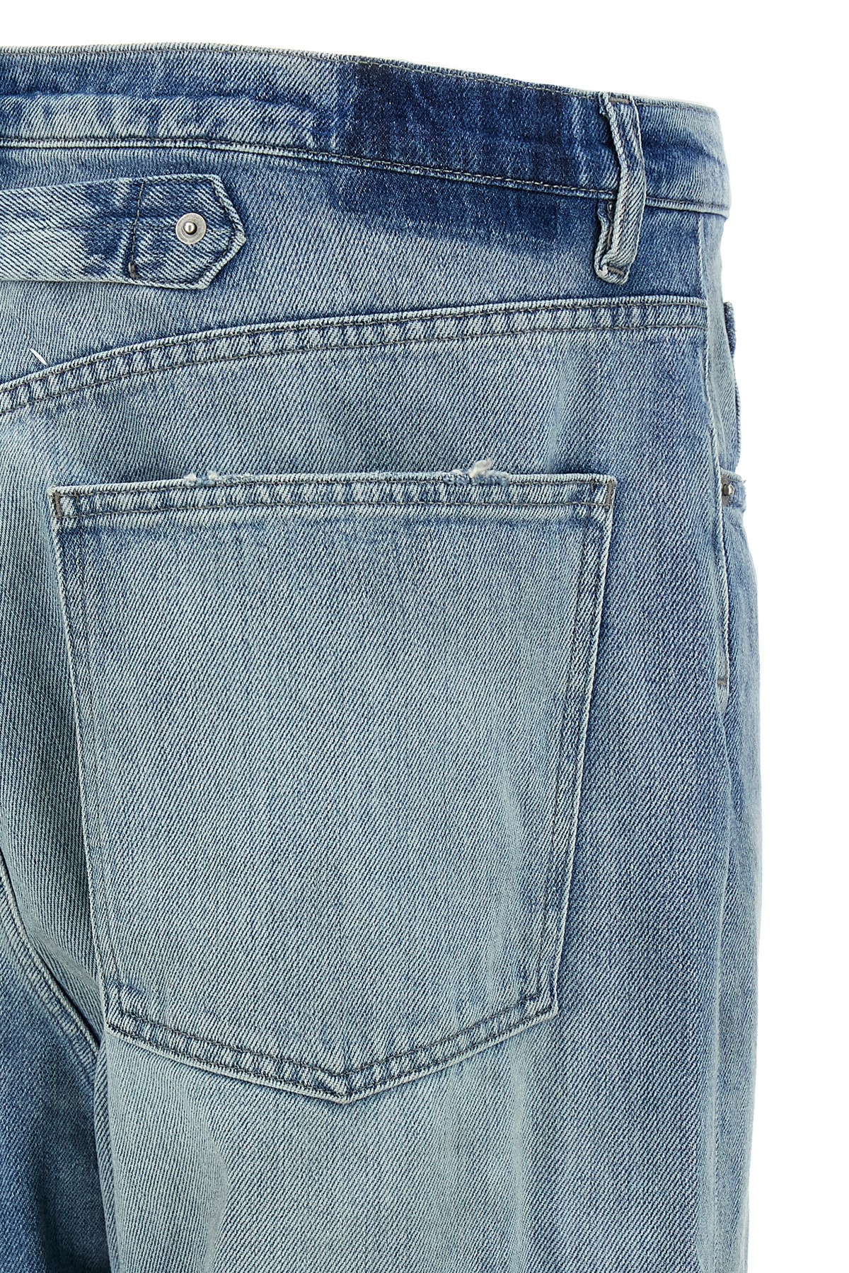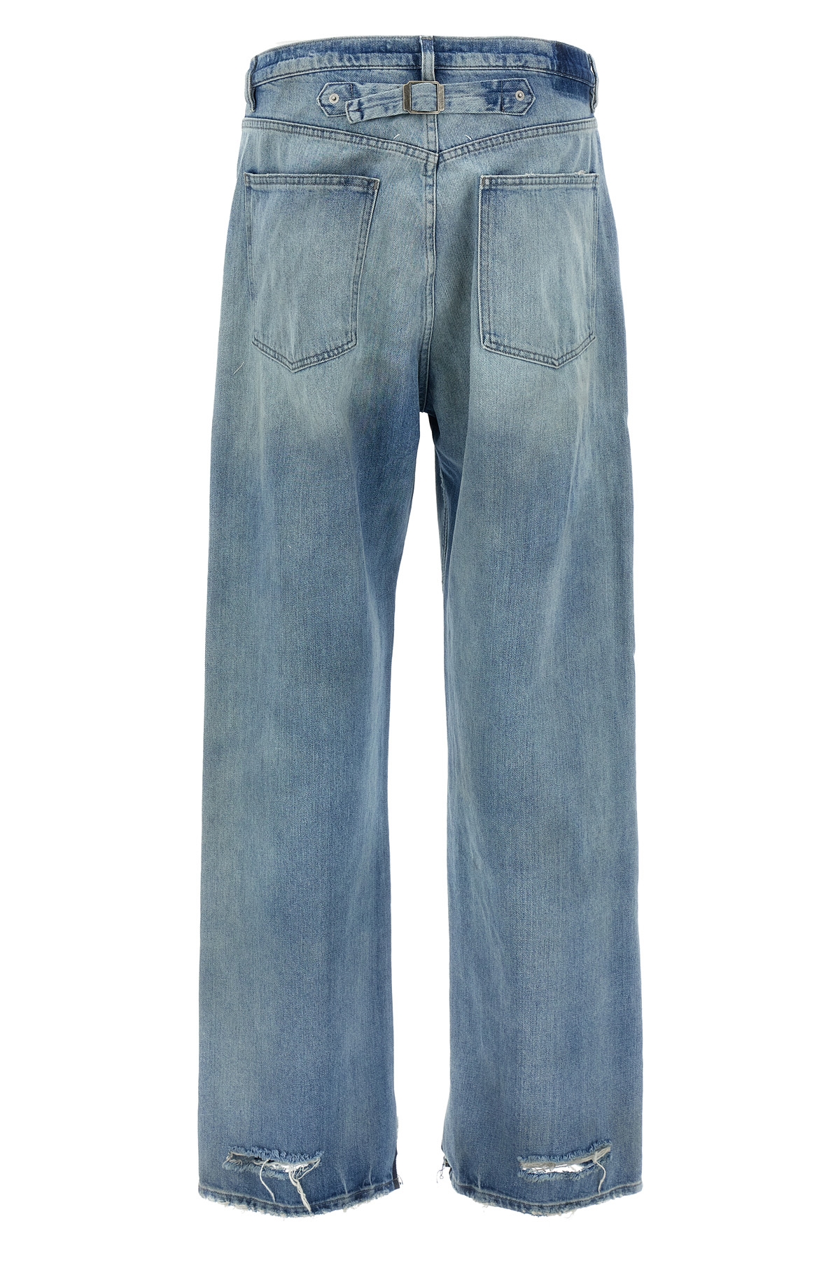 Stonewashed cotton denim jeans with five pockets, button closure, adjustable buckle strap on the back, splits and used fabric on the leg bottoms.
