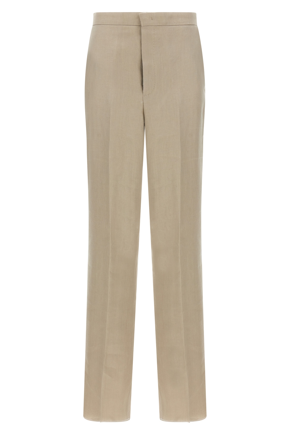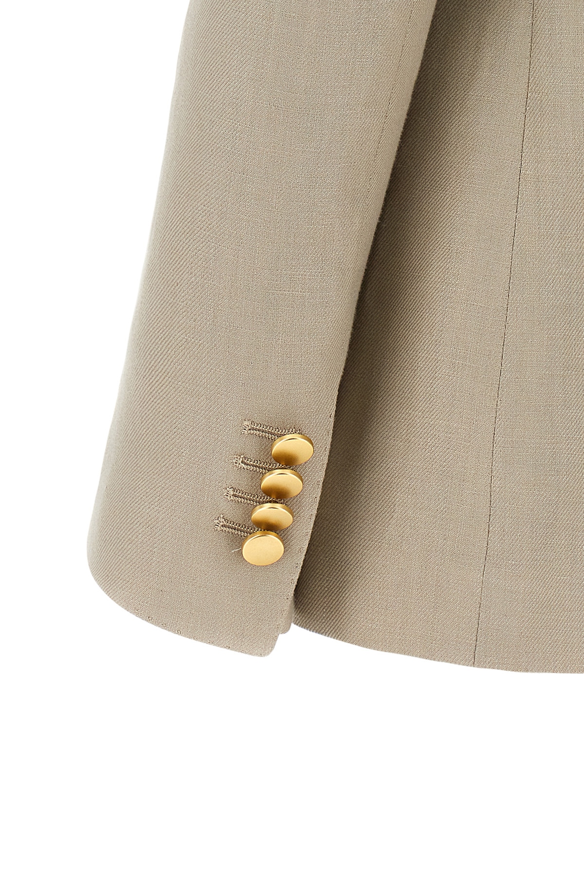'Parigi' linen dress consisting of double-breasted blazer with button closure, slightly padded shoulders, long sleeves, back slit, pants with stretched pleat, zip and hook closure, pockets.