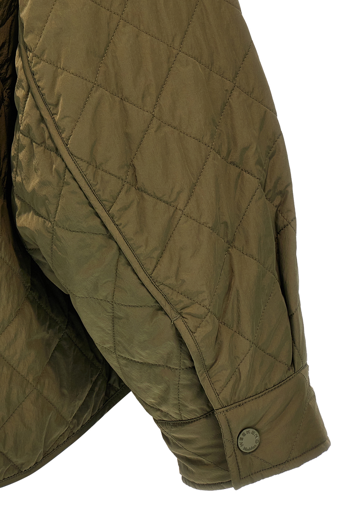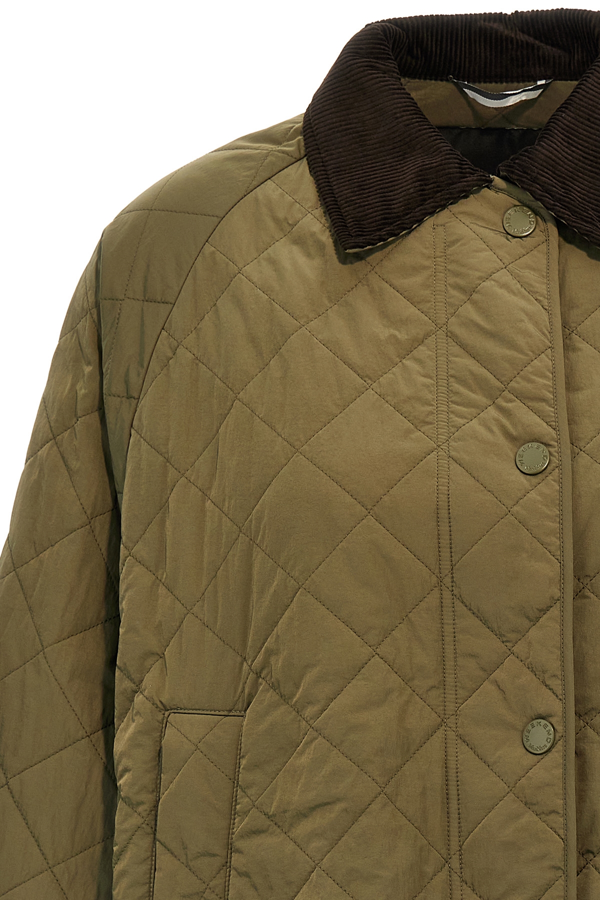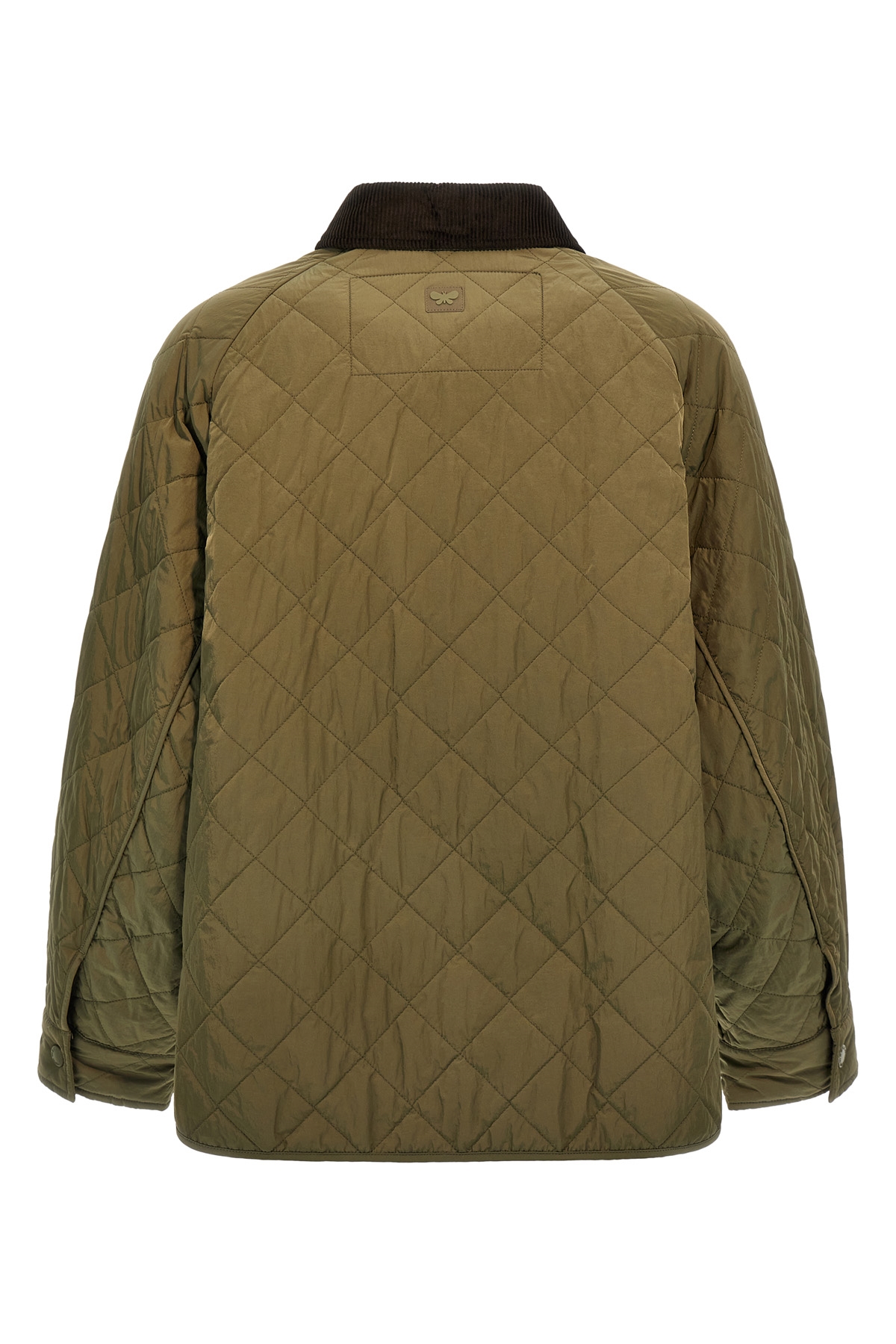 'Beber' waterproof nylon taffeta jacket with all-over diamond-shaped quilted pattern, Luxepad Ultra Fine Insulating Technology Camel-Silk Blend Edition padding, A-line silhouette with corduroy shirt collar, zip and snap button closure, long cuffed sleeves and dropped shoulder.