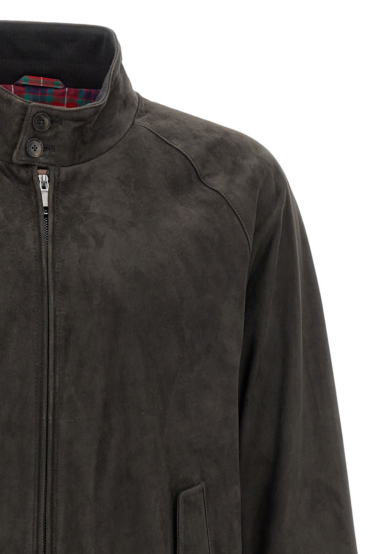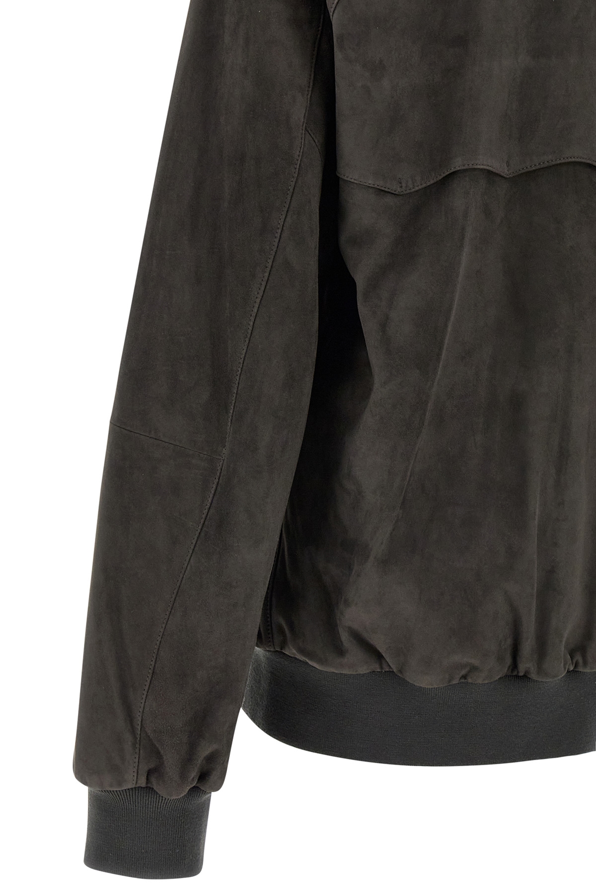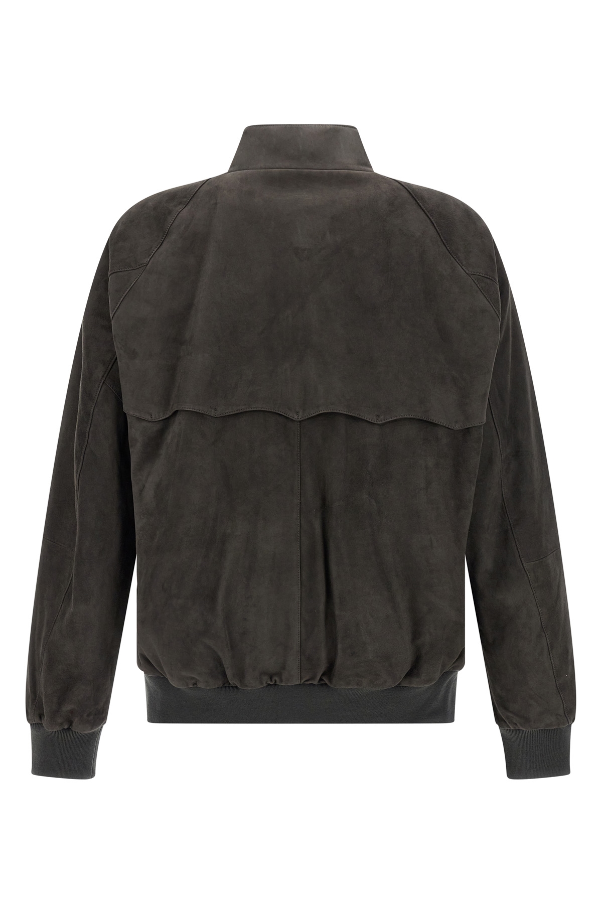 'G9' suede bomber jacket with knit details, zip closure, high neck with double button closure, pockets, long cuffed sleeves.