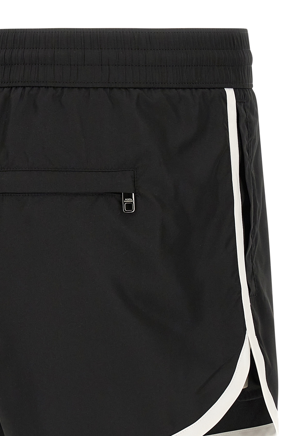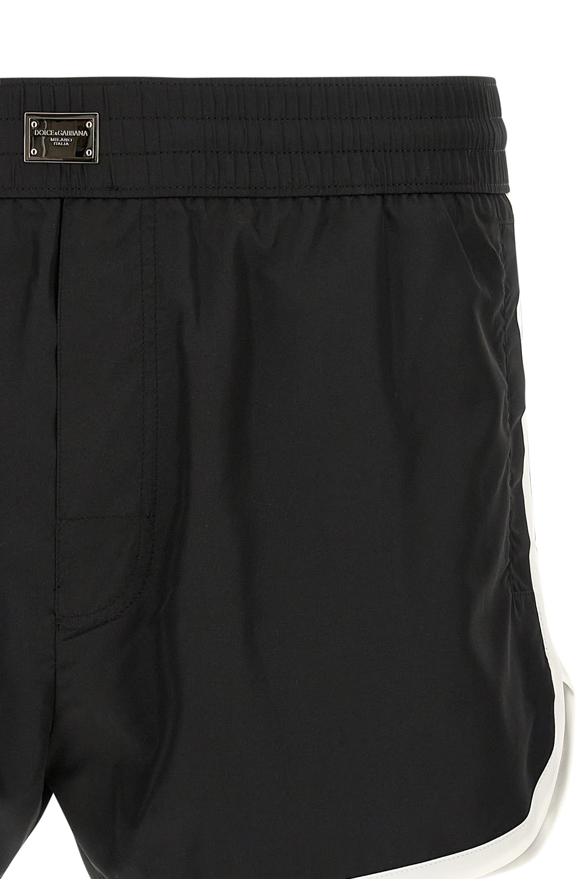 Swimsuit in technical fabric with contrasting piping, short model with side slits, front metal logo, elastic with adjustable drawstring at the waist, pockets, inner briefs.