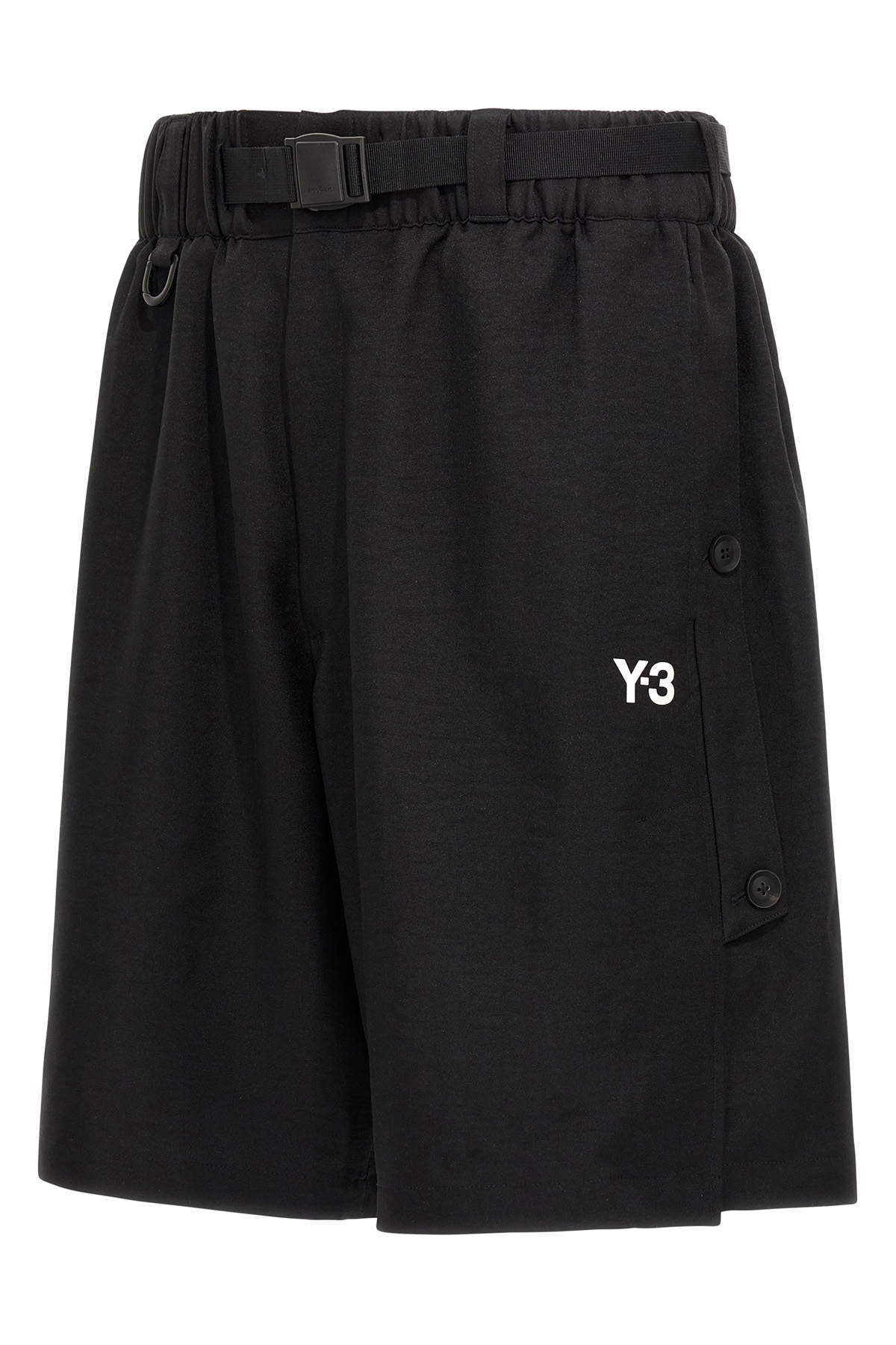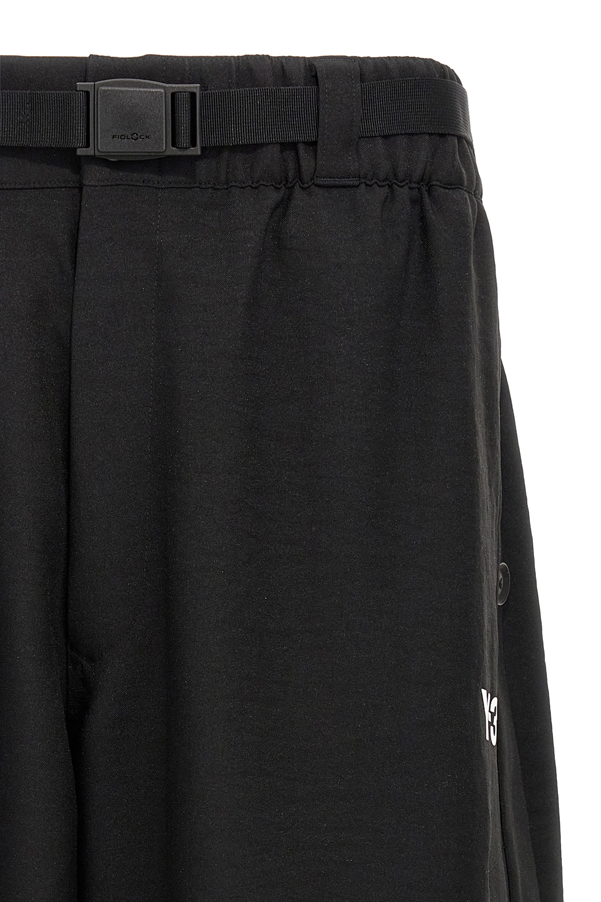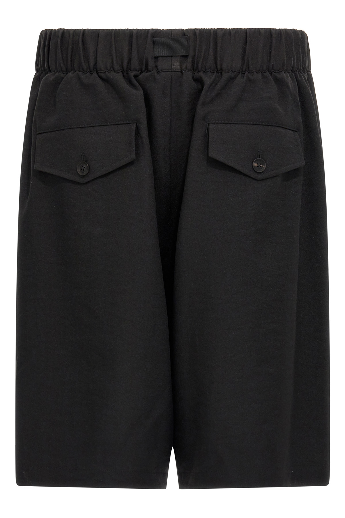 Bermuda shorts in technical fabric, front logo print, side opening with adjustable strip details with buttons, elastic with adjustable belt at the waist, zip and snap button closure, pockets, wide leg.