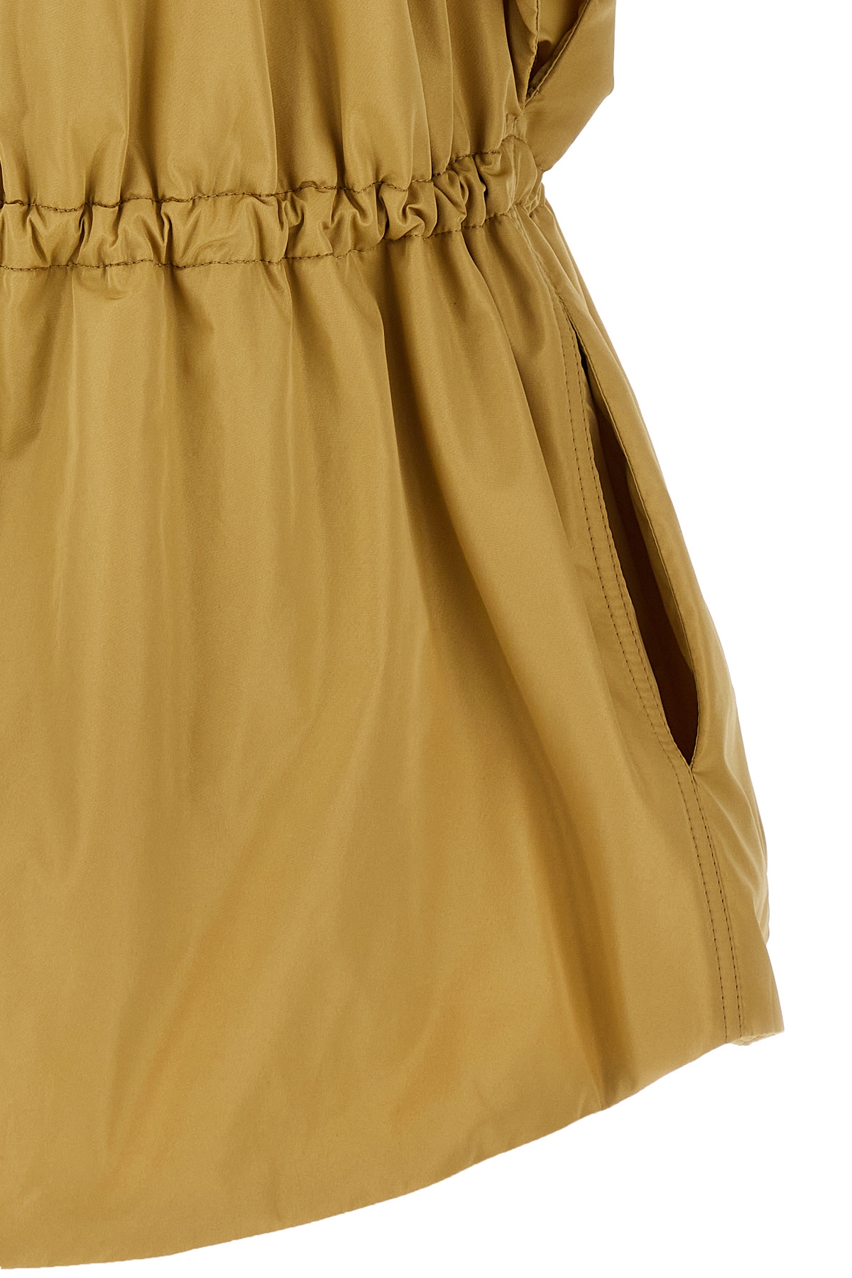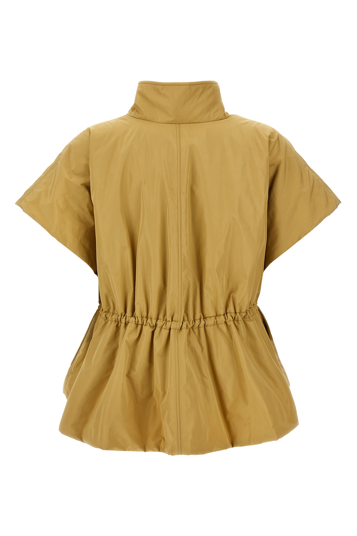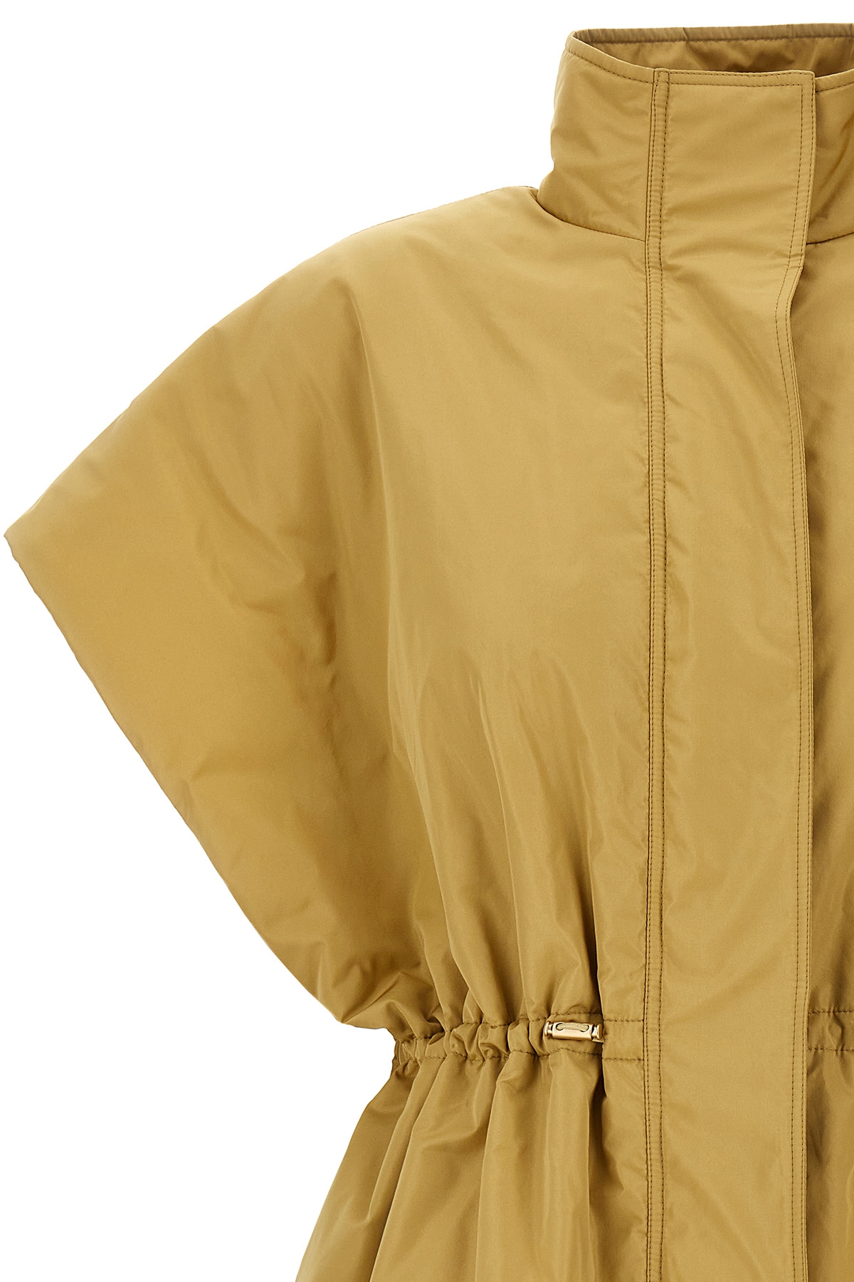 Lightly padded cotton taffeta cape, adjustable drawstring at the waist, zip closure, side pockets.