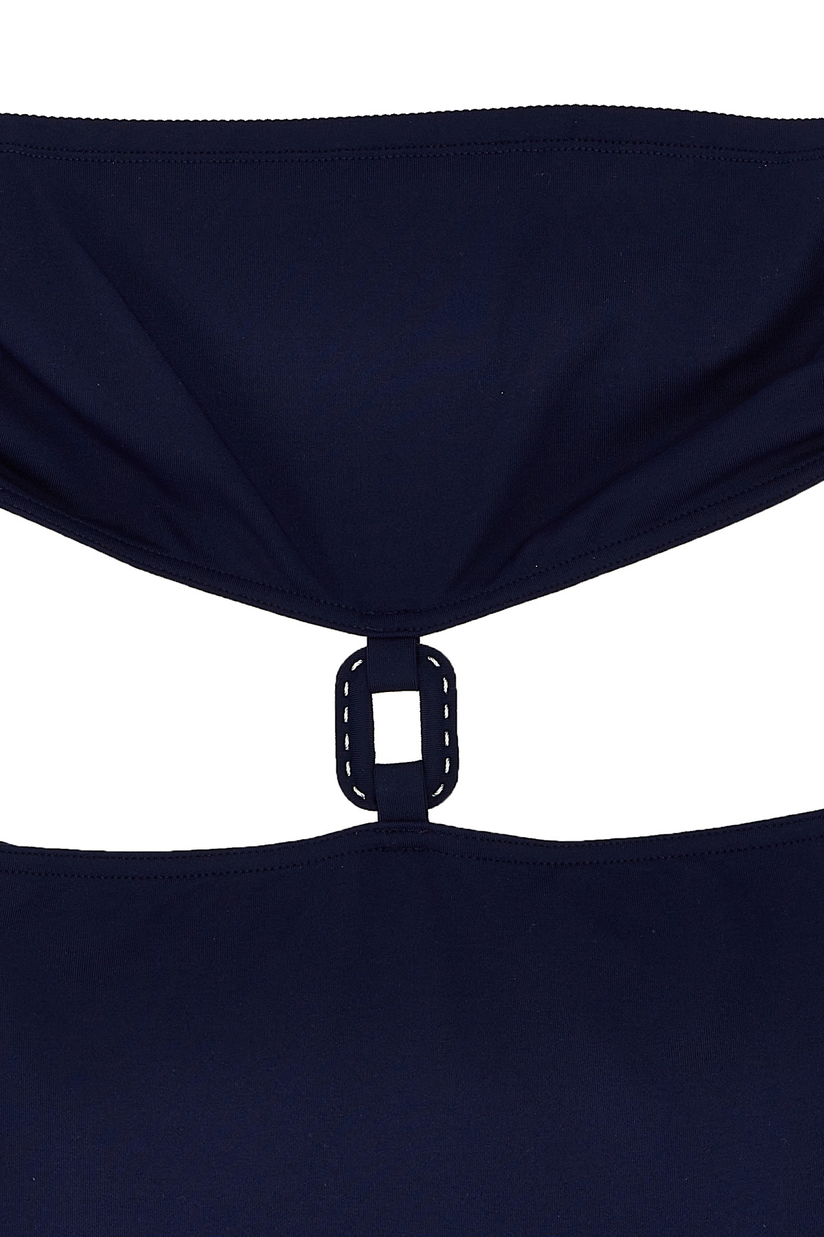 'Marina' one-piece swimsuit in Peau Douce* fabric with trikini style with non-slip band bustier, pleats and side underwires, back hook closure, front central decorative buckle and high waist briefs.