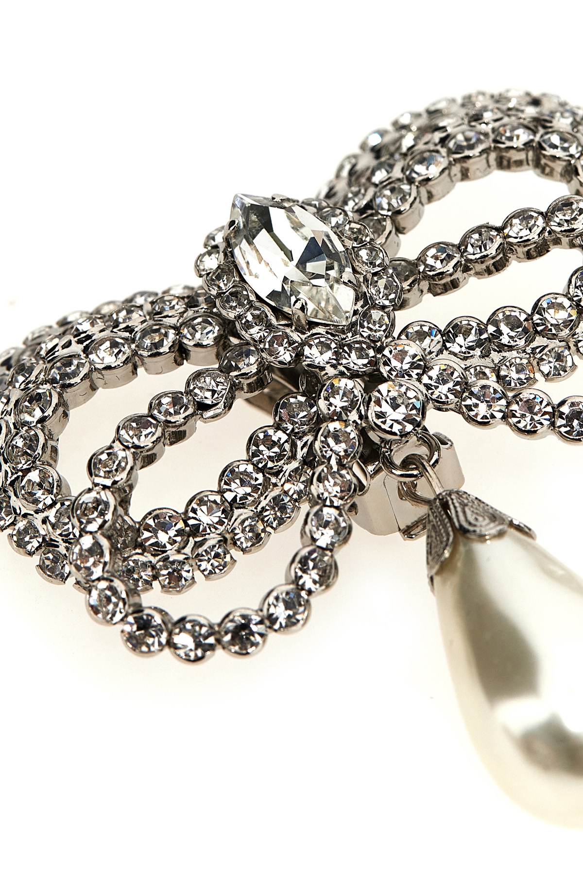 Bow earrings embellished with rhinestones and crystals, pearl pendant, clip closure. ITEM CANNOT BE RETURNED
