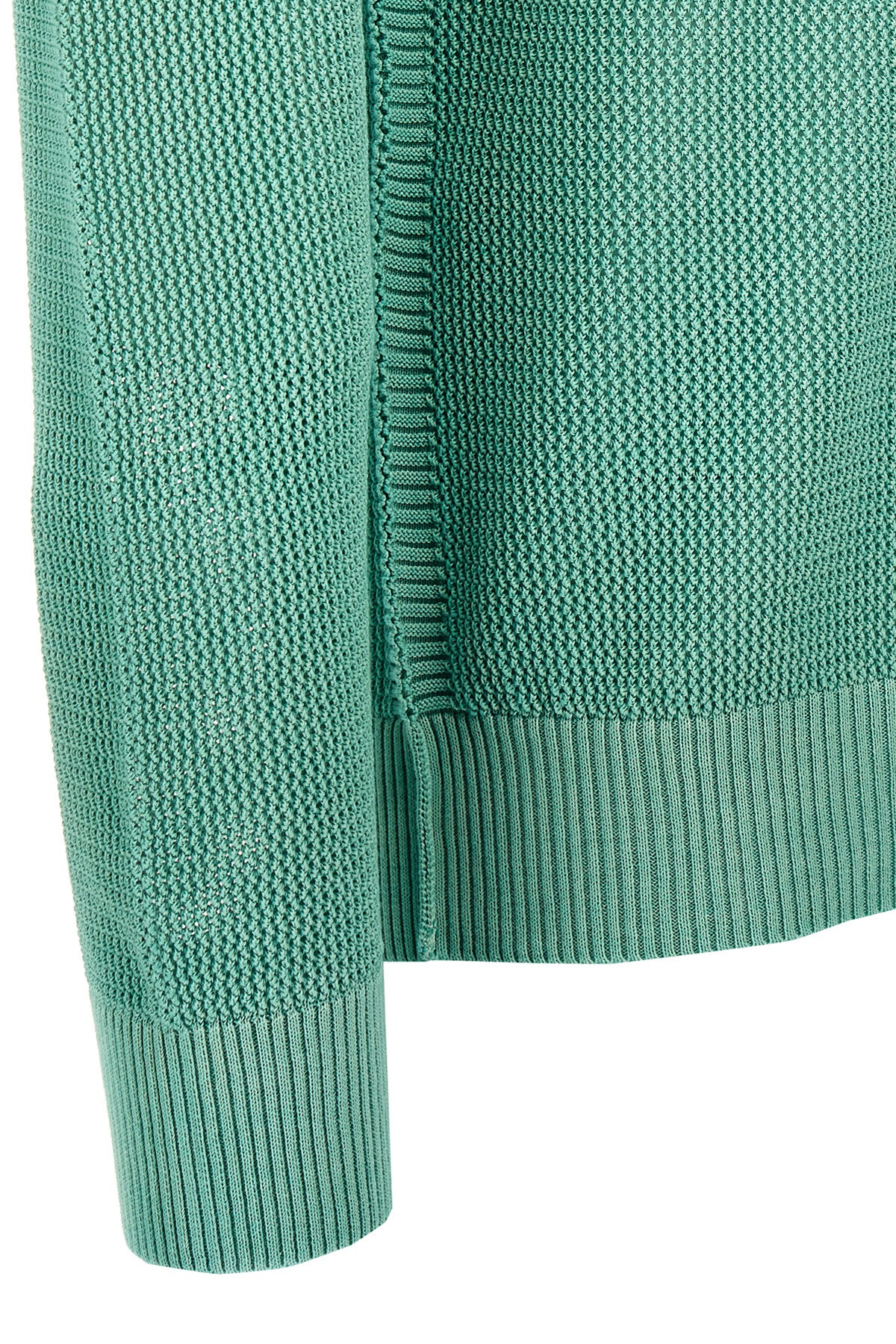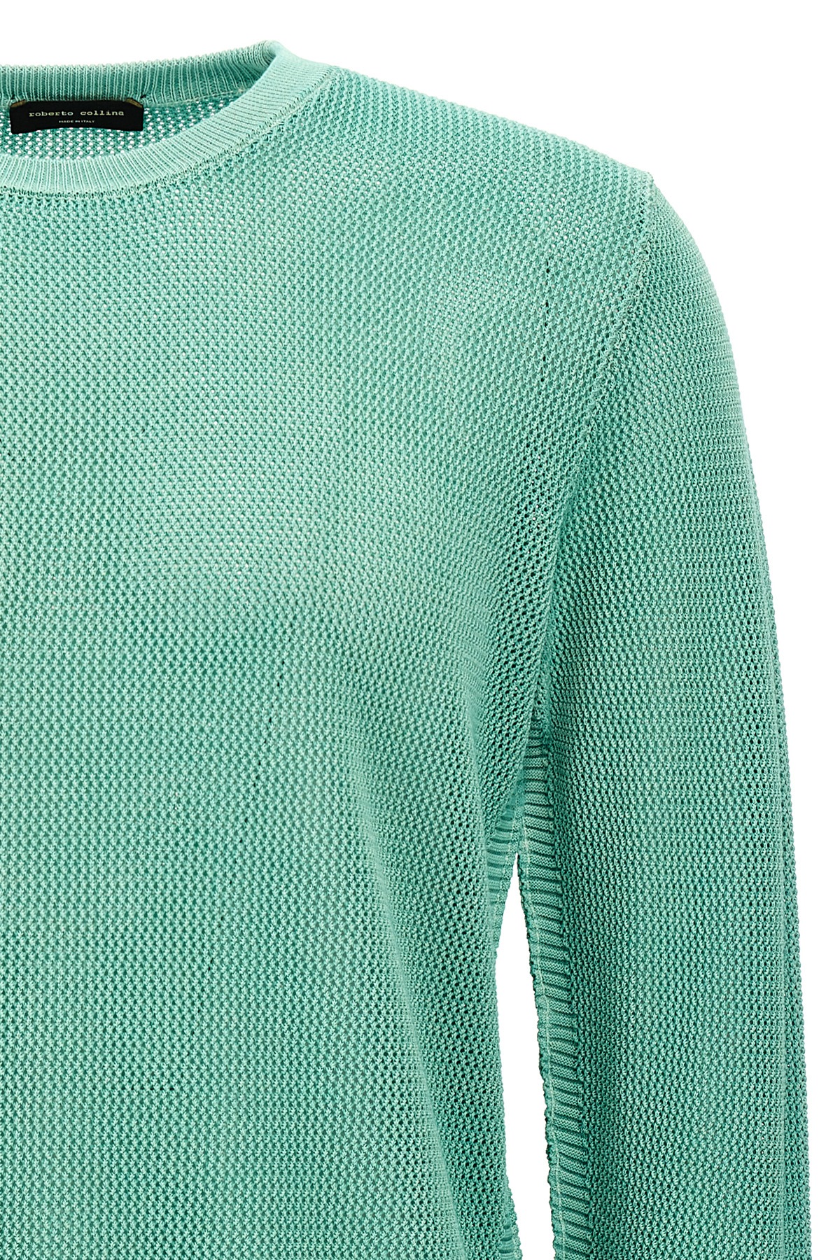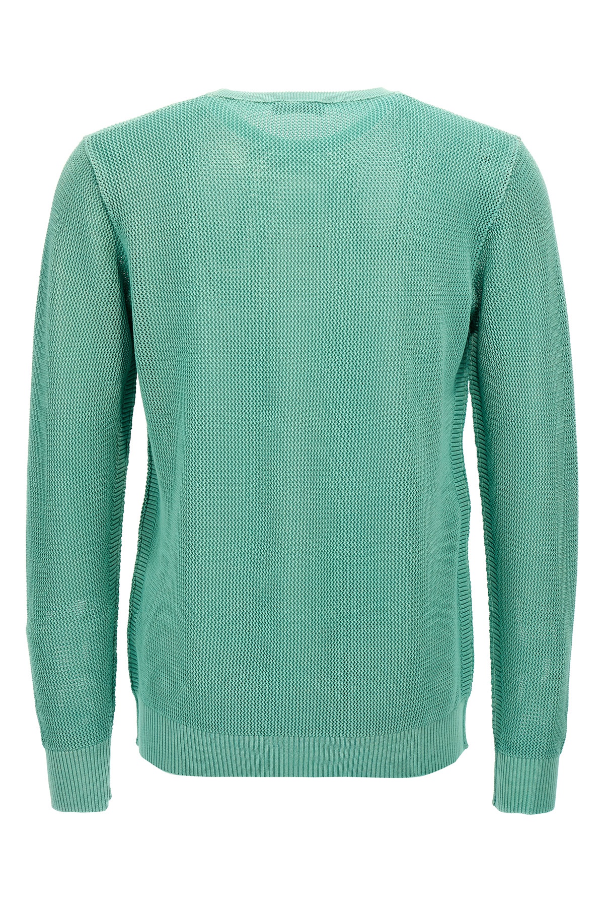 Mesh effect knitted cotton sweater with crew neck, long cuffed sleeves. Any color irregularities are not to be considered a defect but a characteristic of the yarn.