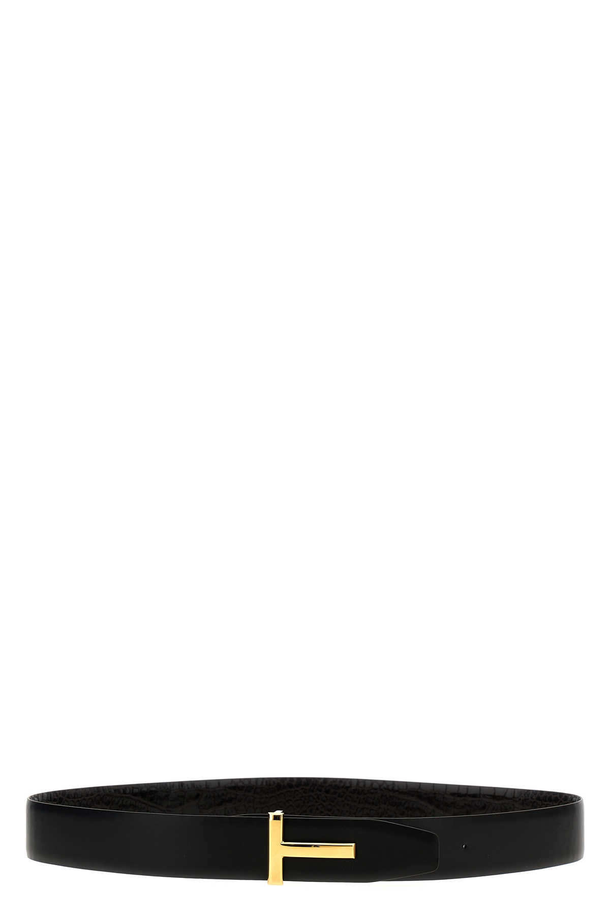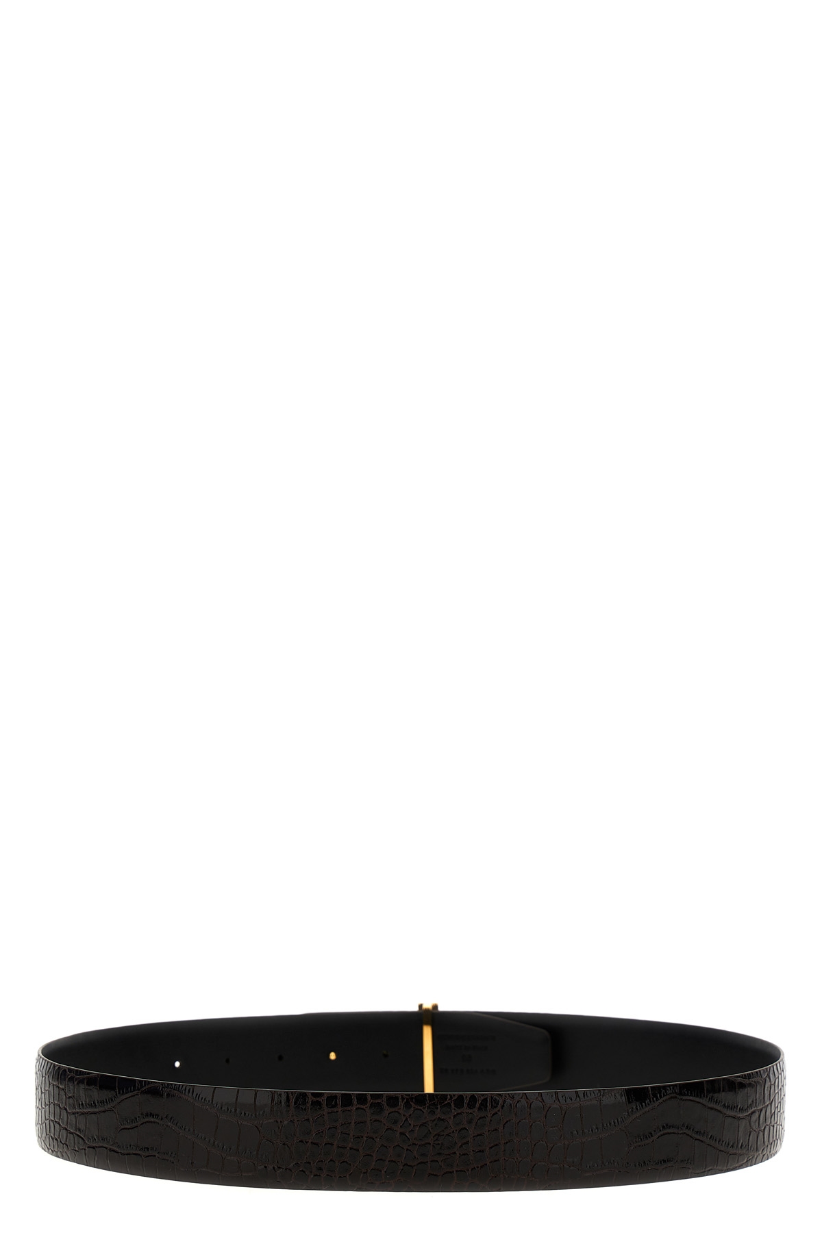 Reversible leather belt with glossy patent leather crocodile print side, metal logo buckle.
