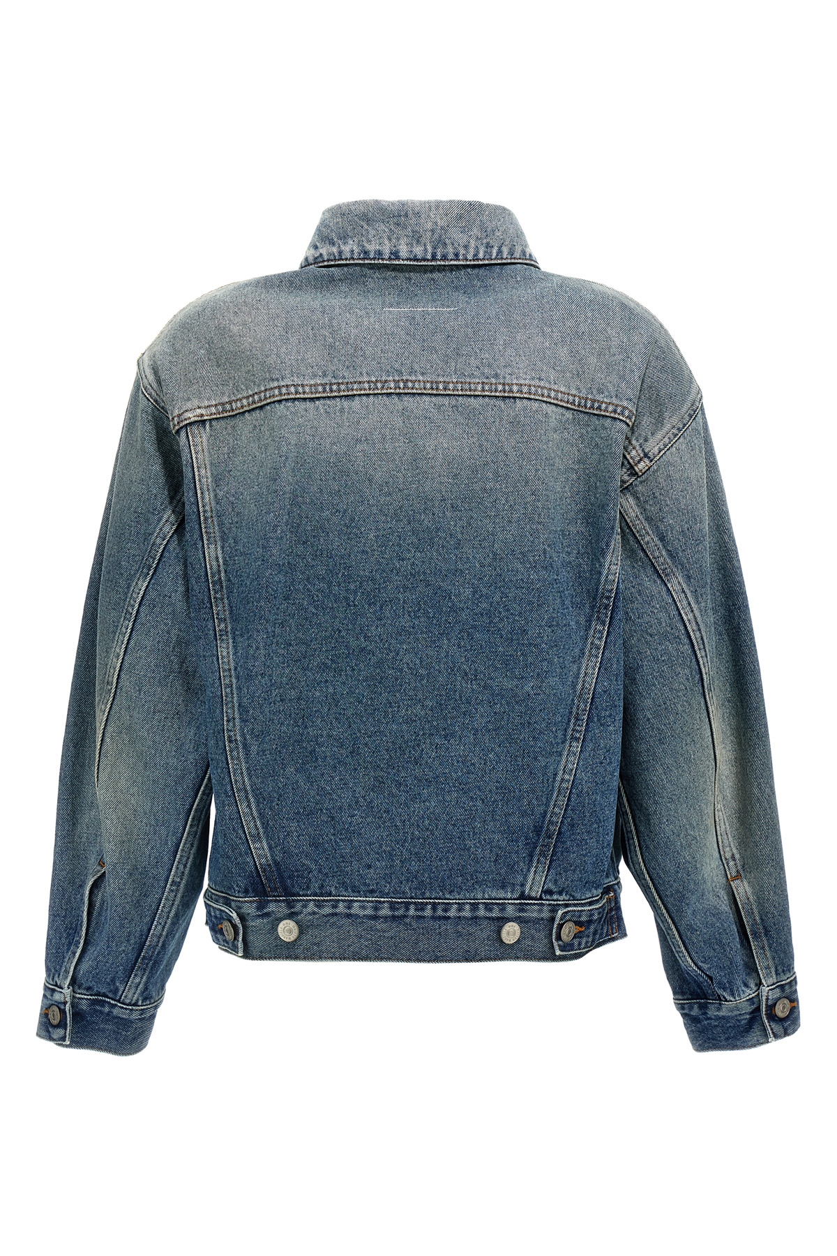 Cotton denim jacket with cut-out details around the sleeve, button closure, pockets, long cuffed sleeves, 'White stitch line' at the back.