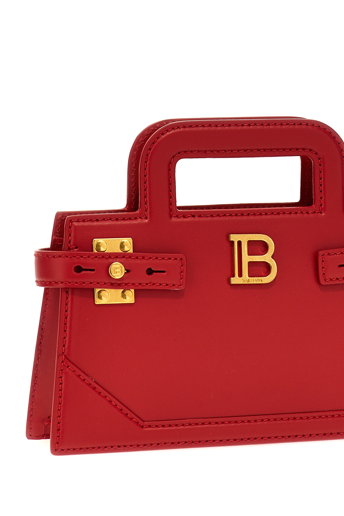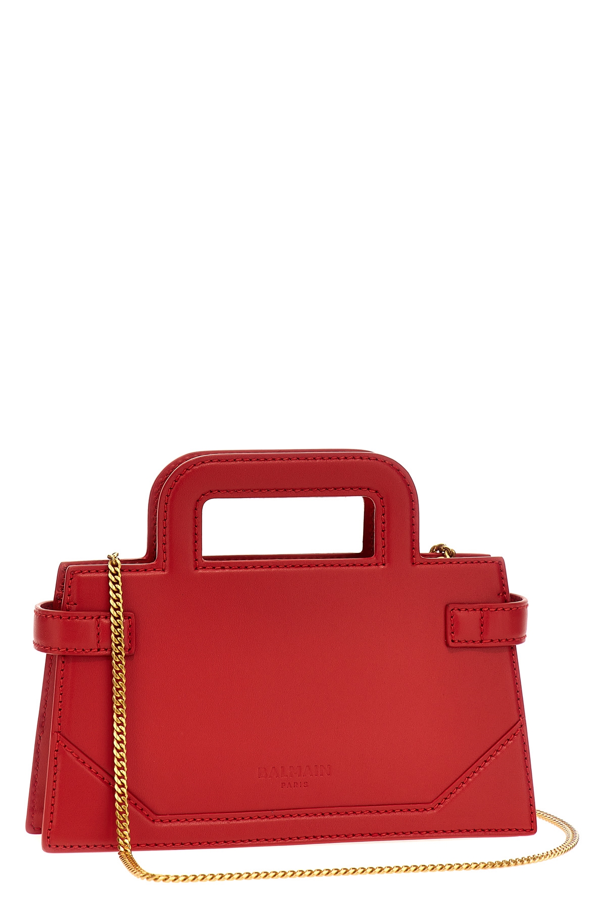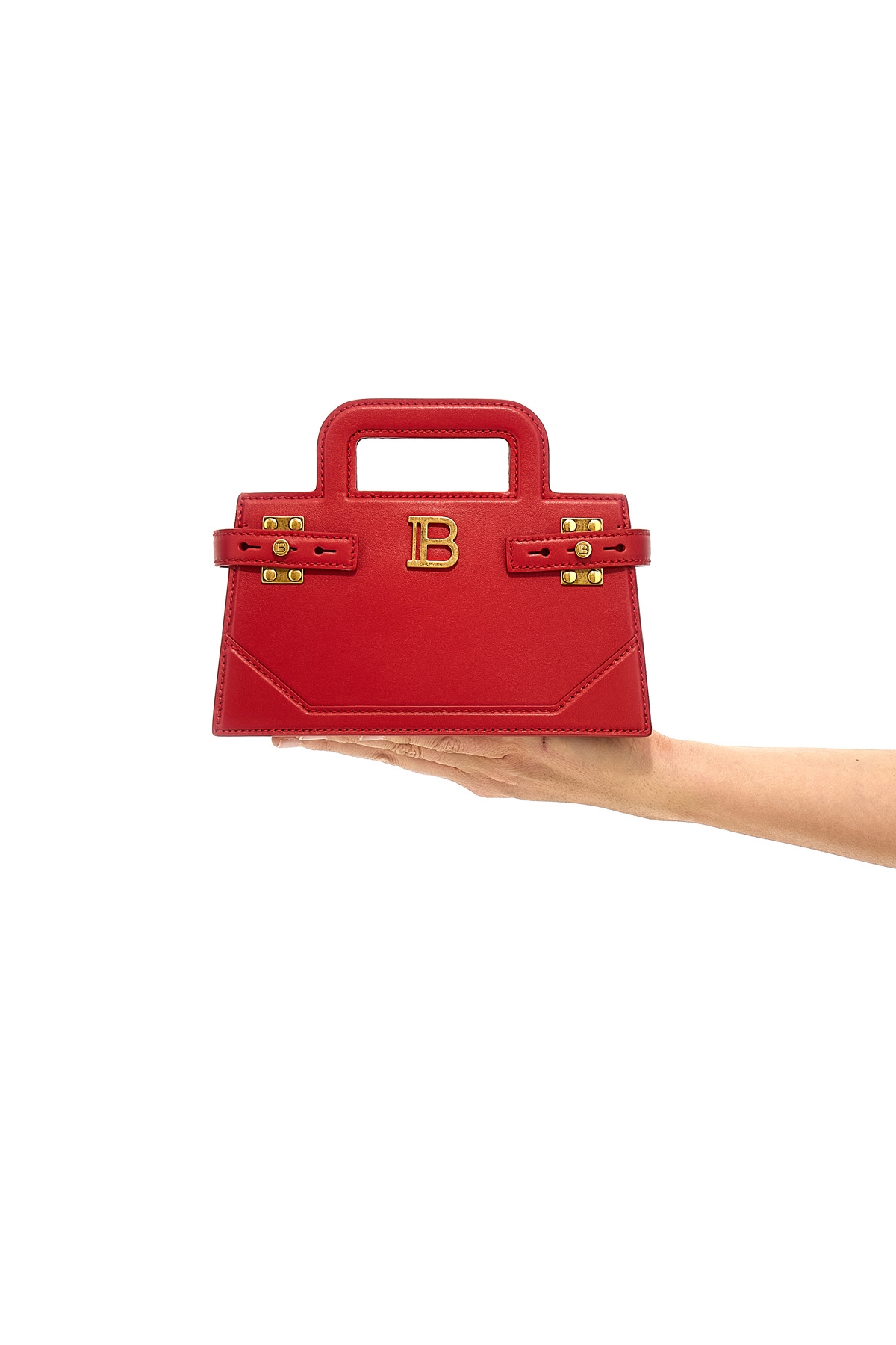 'B-Buzz Small' leather handbag with front vintage metal logo, double handle, chain shoulder strap, vintage metal details, adjustable side straps, magnetic closure.