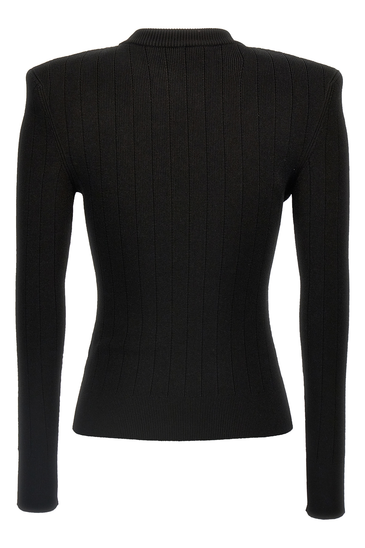 Stretch viscose blend sweater with 'Chiocciola' logo buttons on the shoulders, padded shoulders, crew neck, long sleeves.
