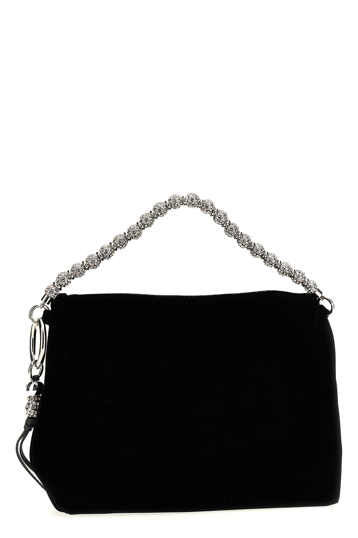 'Callie' handbag in pique retourne velvet, chain with crystal pave, removable chain shoulder strap, tassel ring, zip closure.