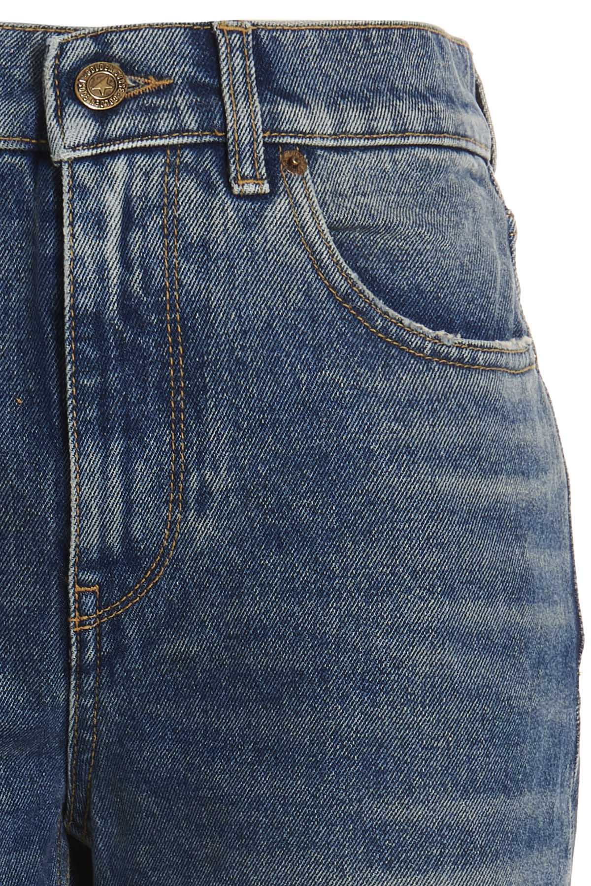 Cotton denim jeans with a high waist, used-effect hem detail, a zip and button closure and five pockets.