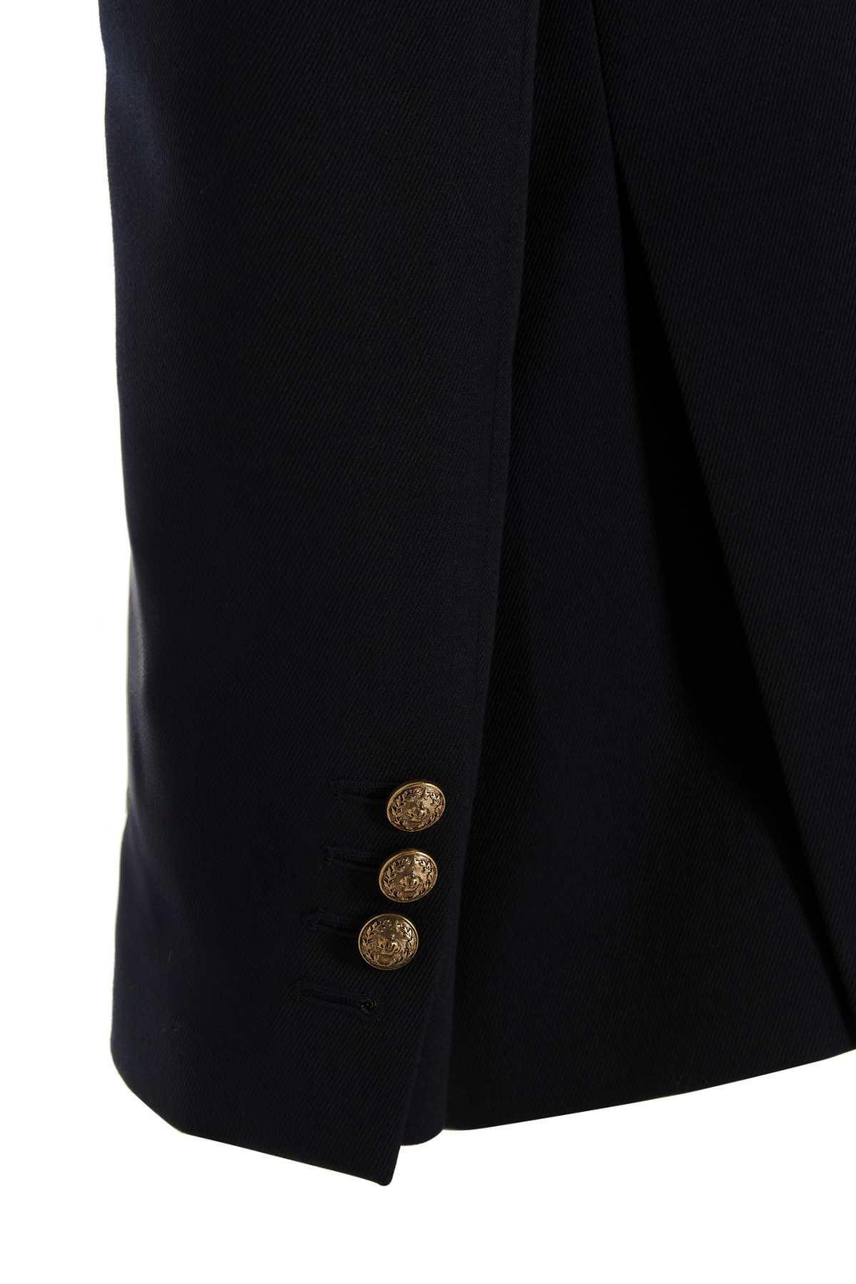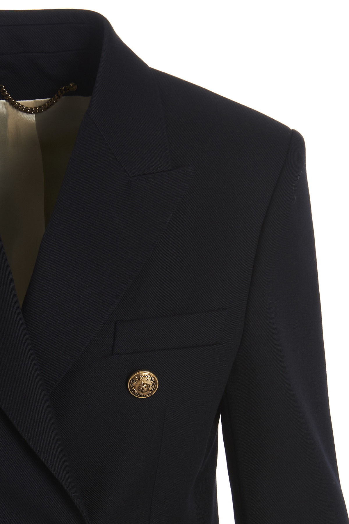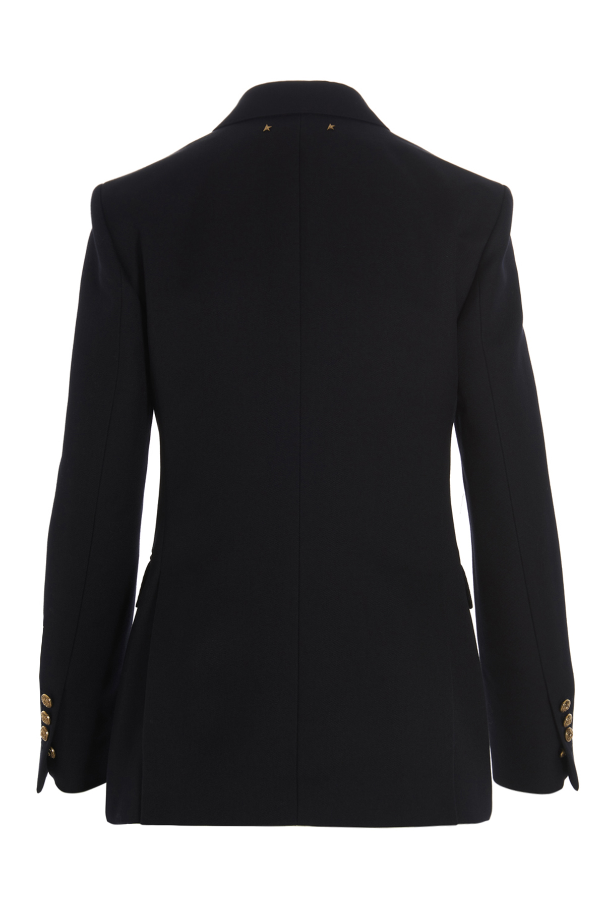 Double breast wool blend blazer jacket featuring gold color buttons, shoulder pads, an inner lining and a V-neck.