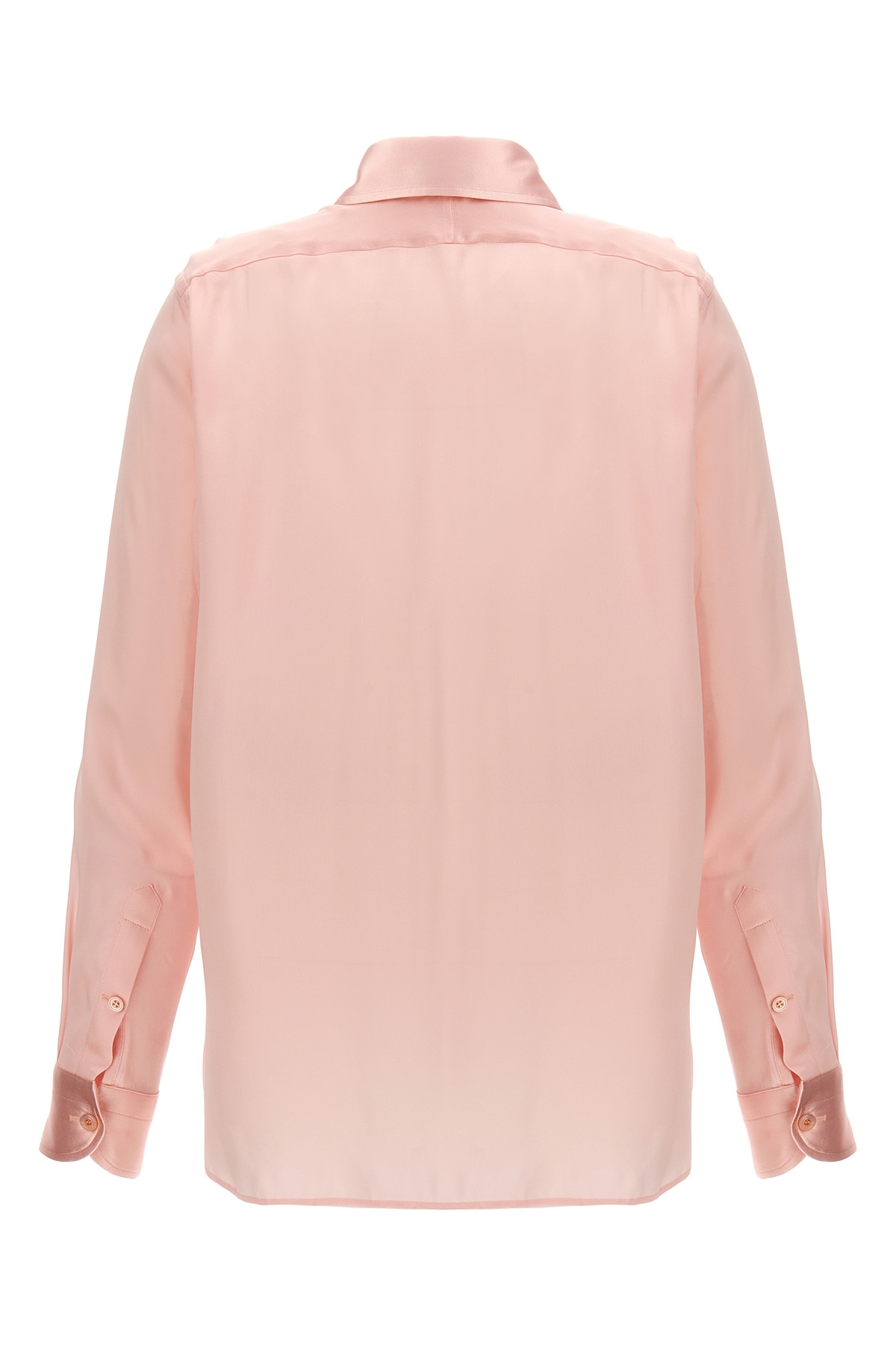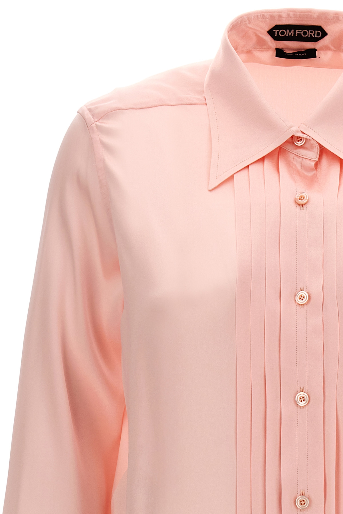Charmeuse silk shirt with pleated plastron, button closure, long cuffed sleeves.