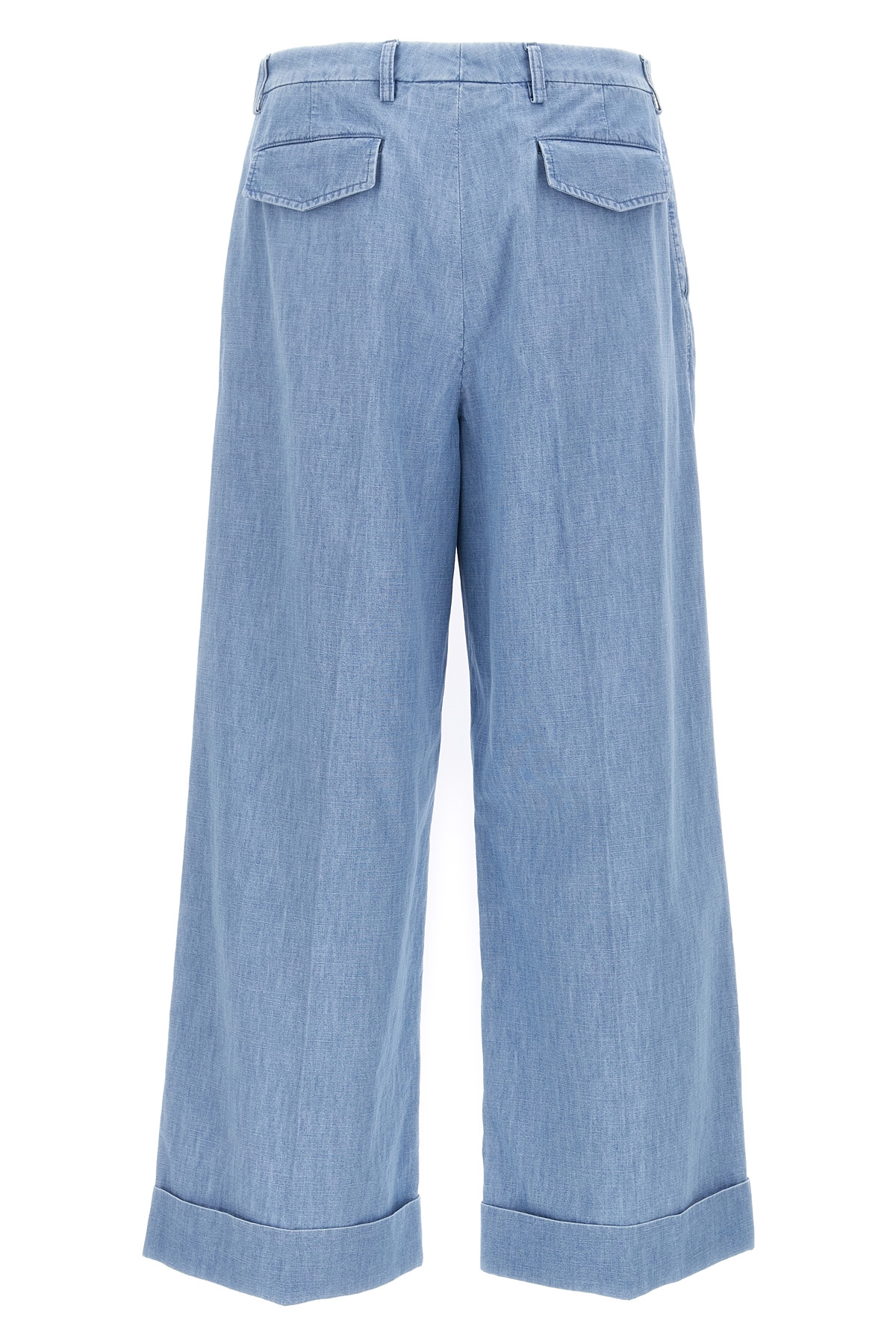 High-waisted cotton denim jeans with hook and button zip closure, pockets, wide leg with stretched pleat and turn-up.