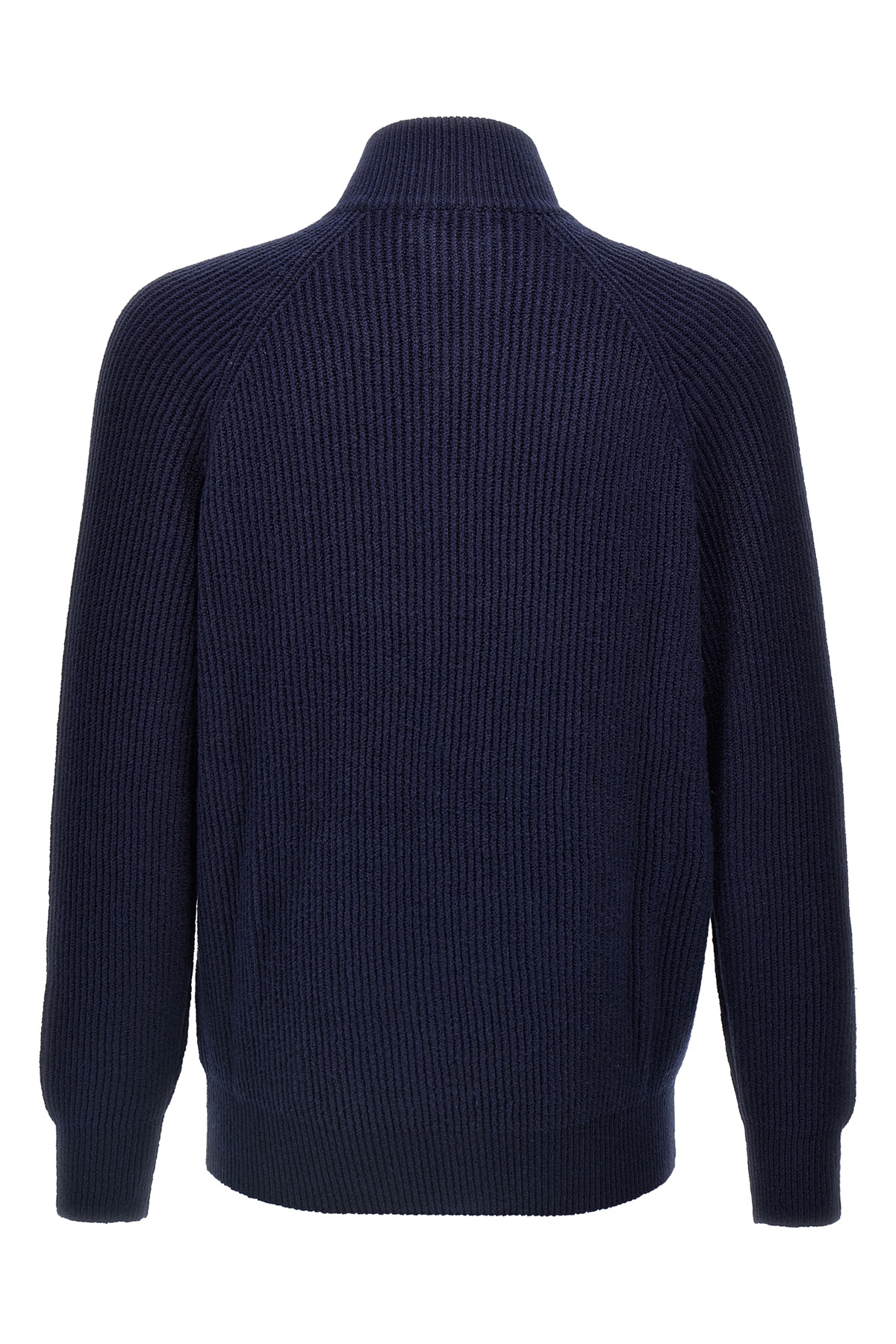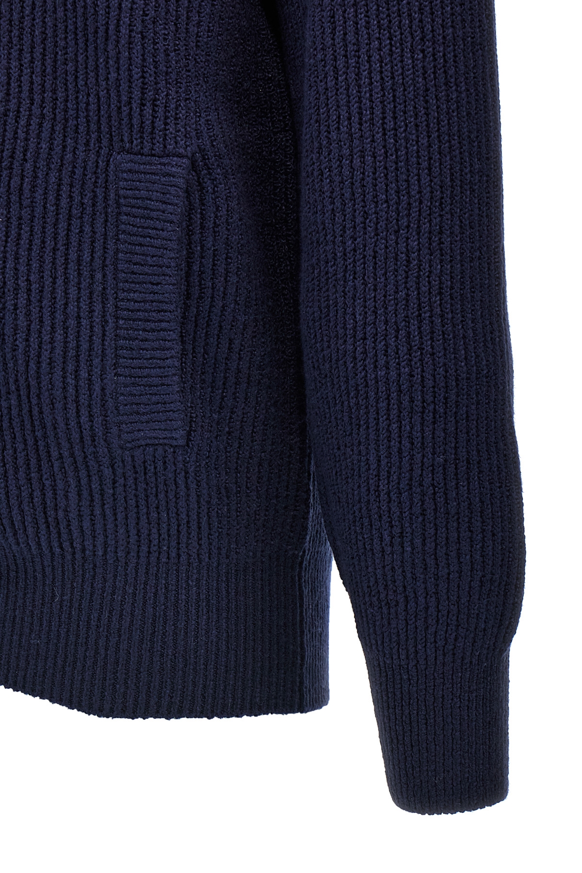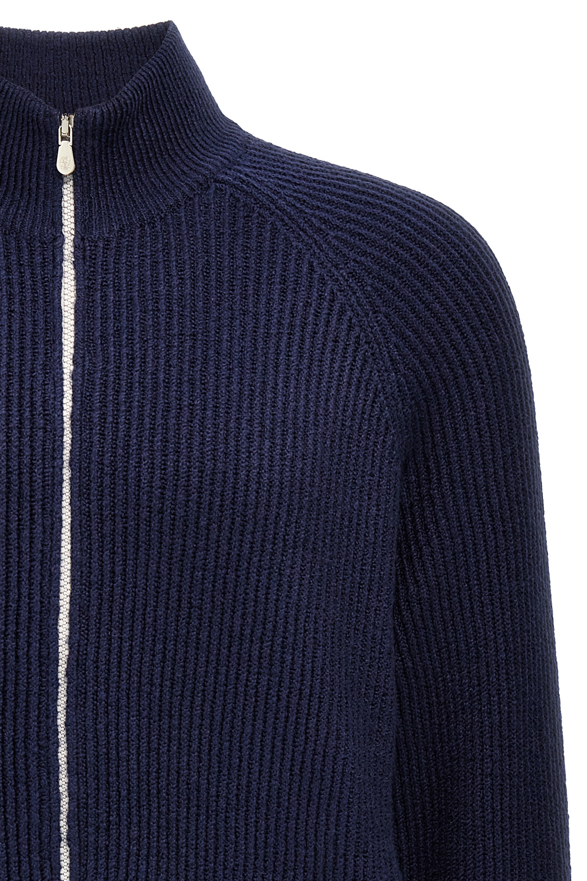 English half-ribbed cotton gauze cardigan, high neck, zip closure, pockets, long cuffed sleeves.
