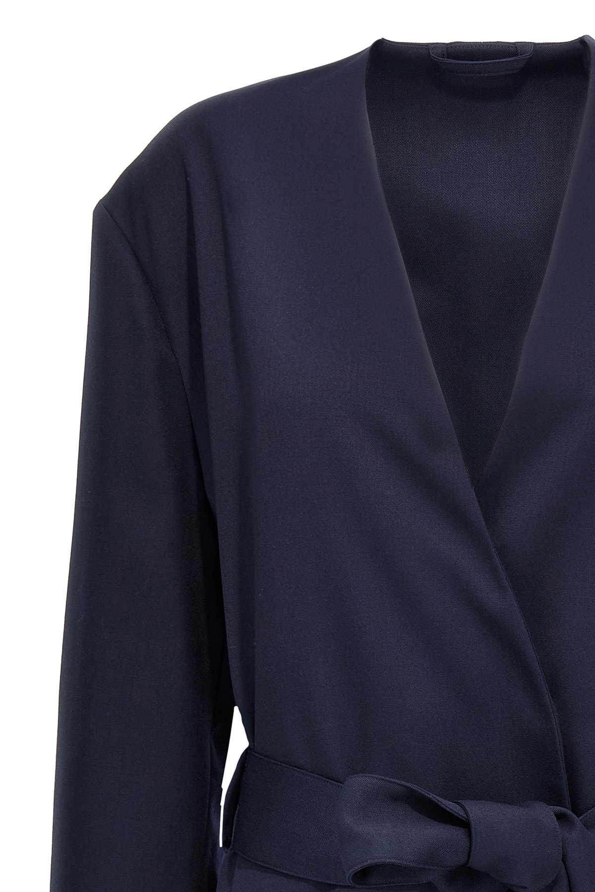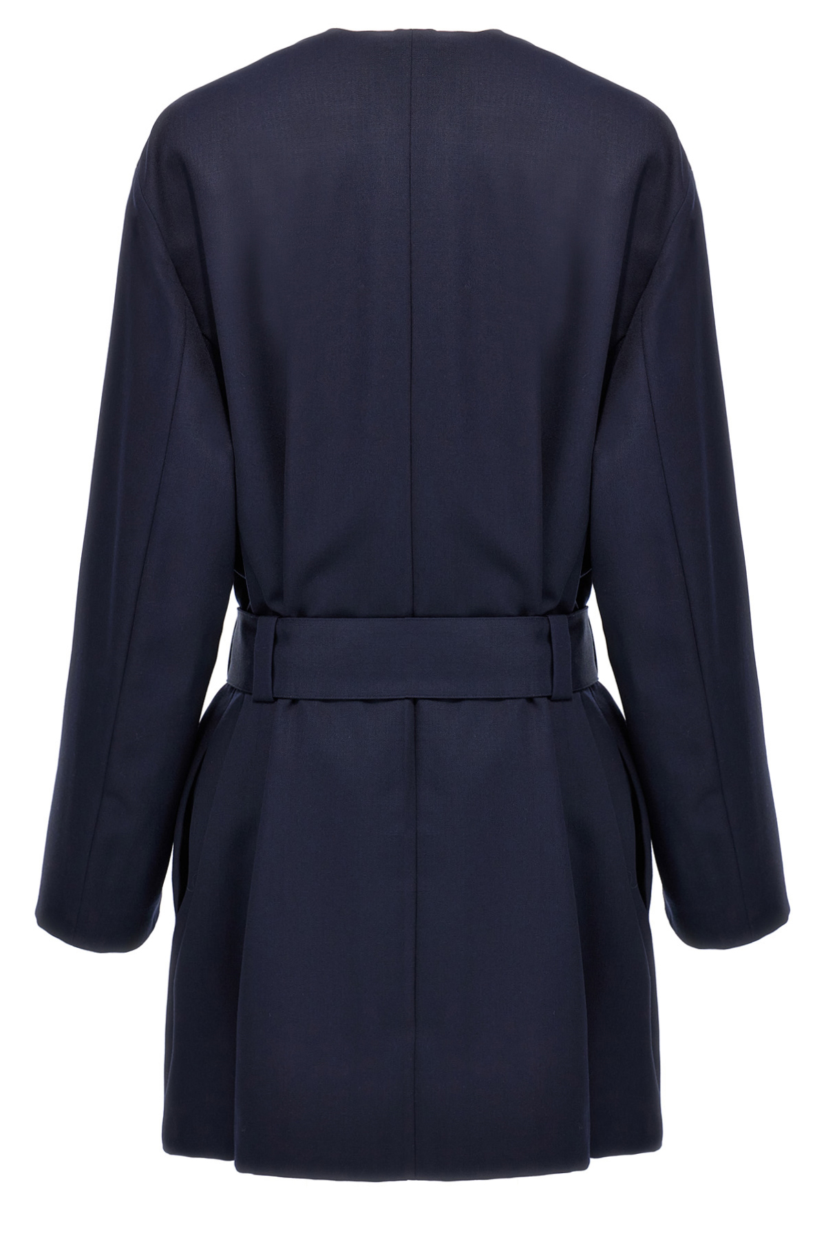 'Long' wool coat, robe style, unlined, removable belt, long sleeves, pockets, back side vents.
