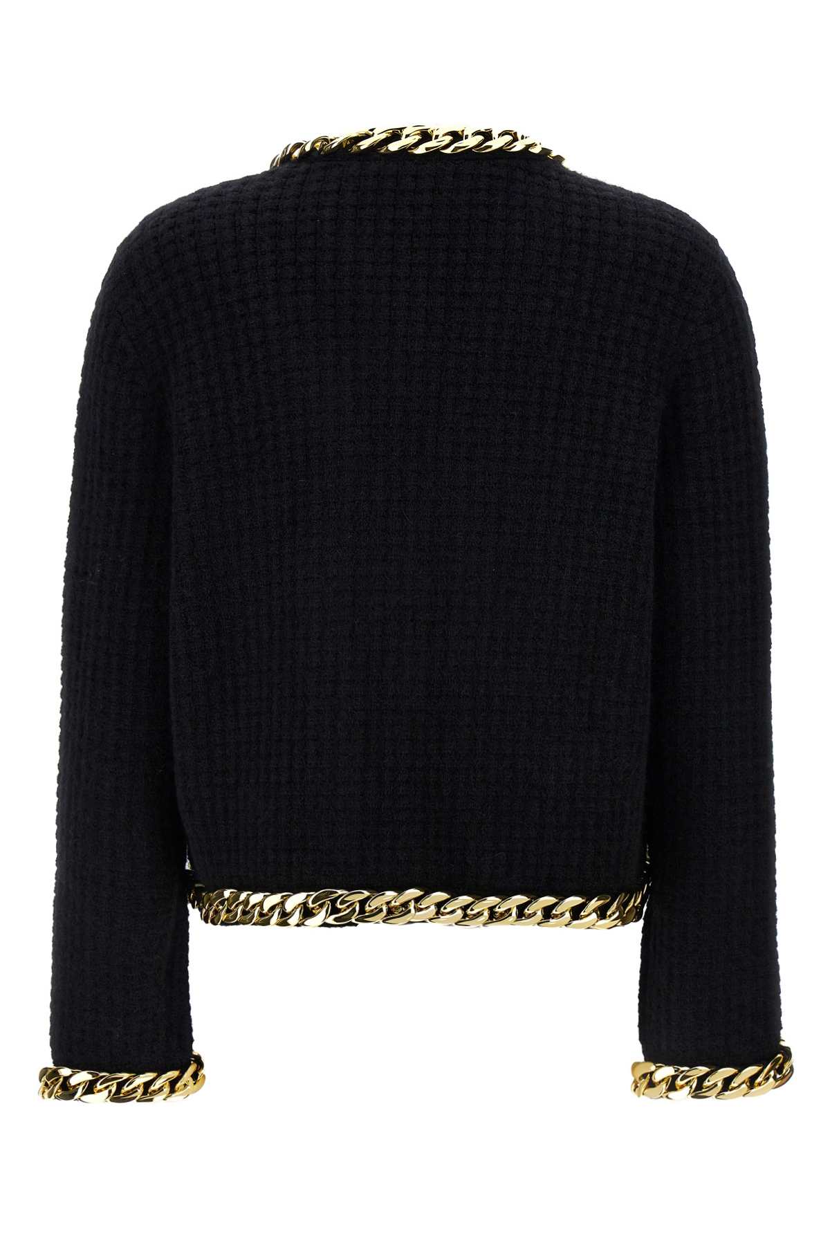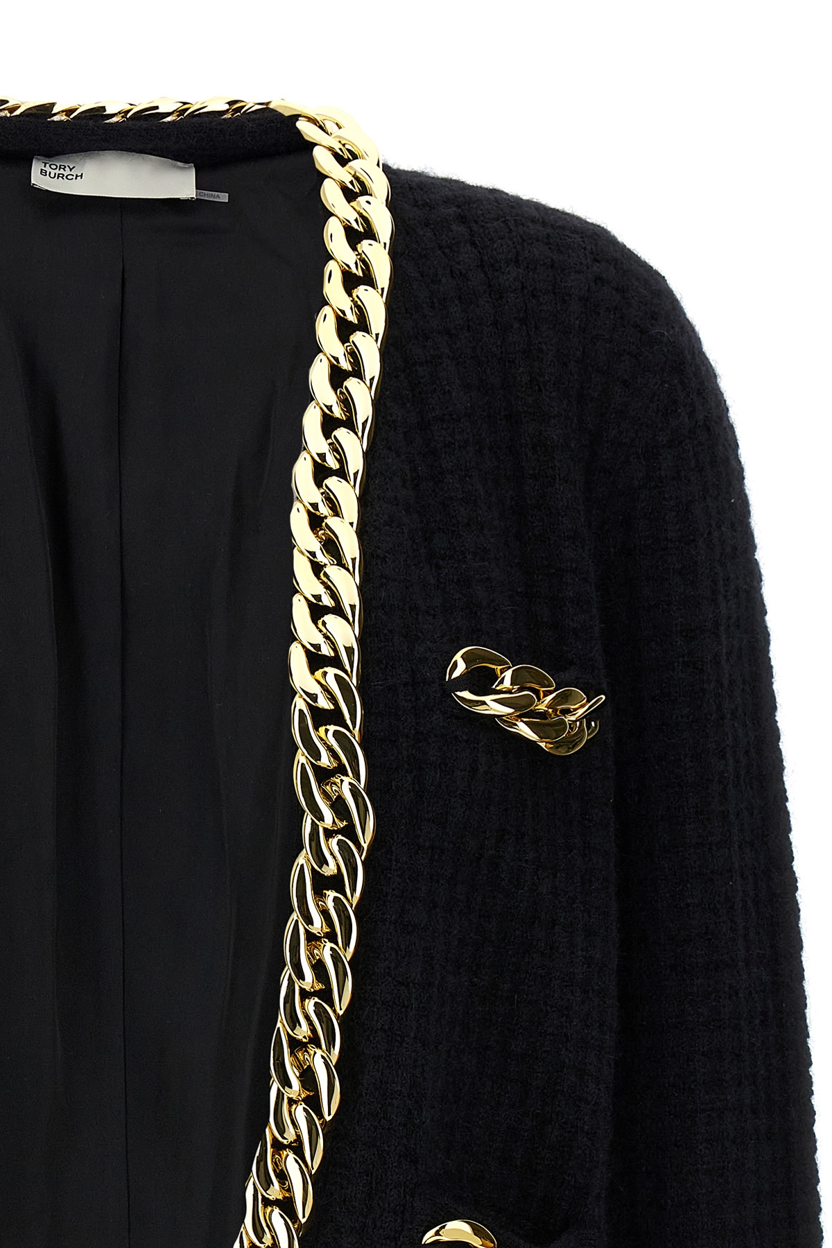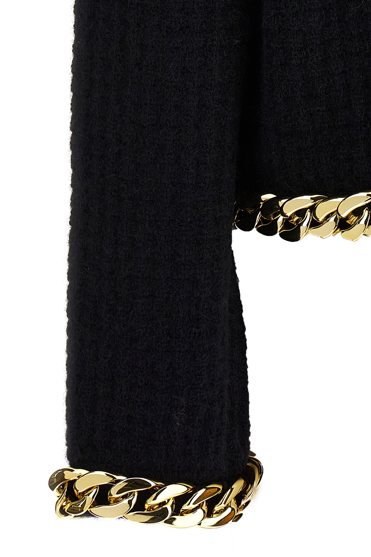 'Kendra Chain' jacket in boucle wool blend with gold chain details, front opening, pockets, long sleeves.
