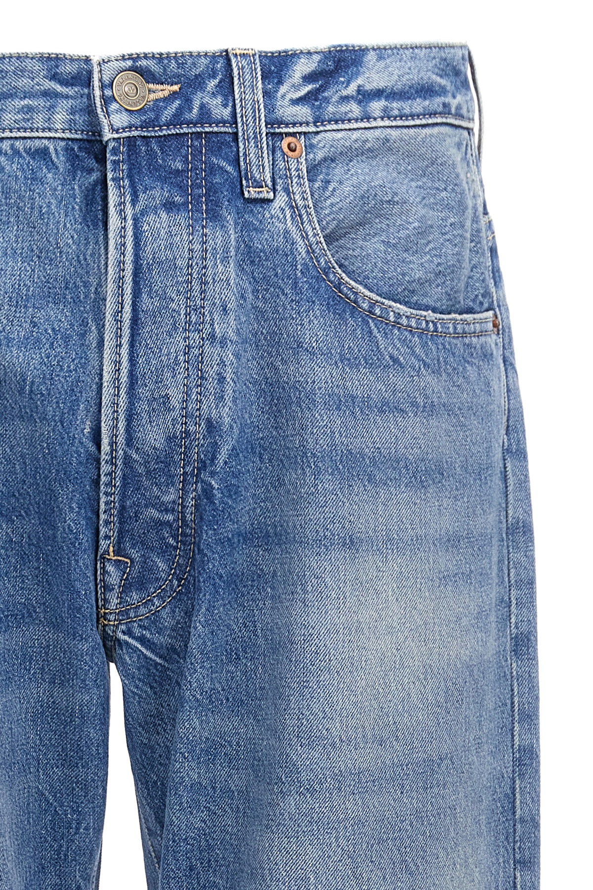 Five-pocket cotton denim jeans with high waist, straight leg, button closure, and leather 'Chez Valentino' logo label on the back.