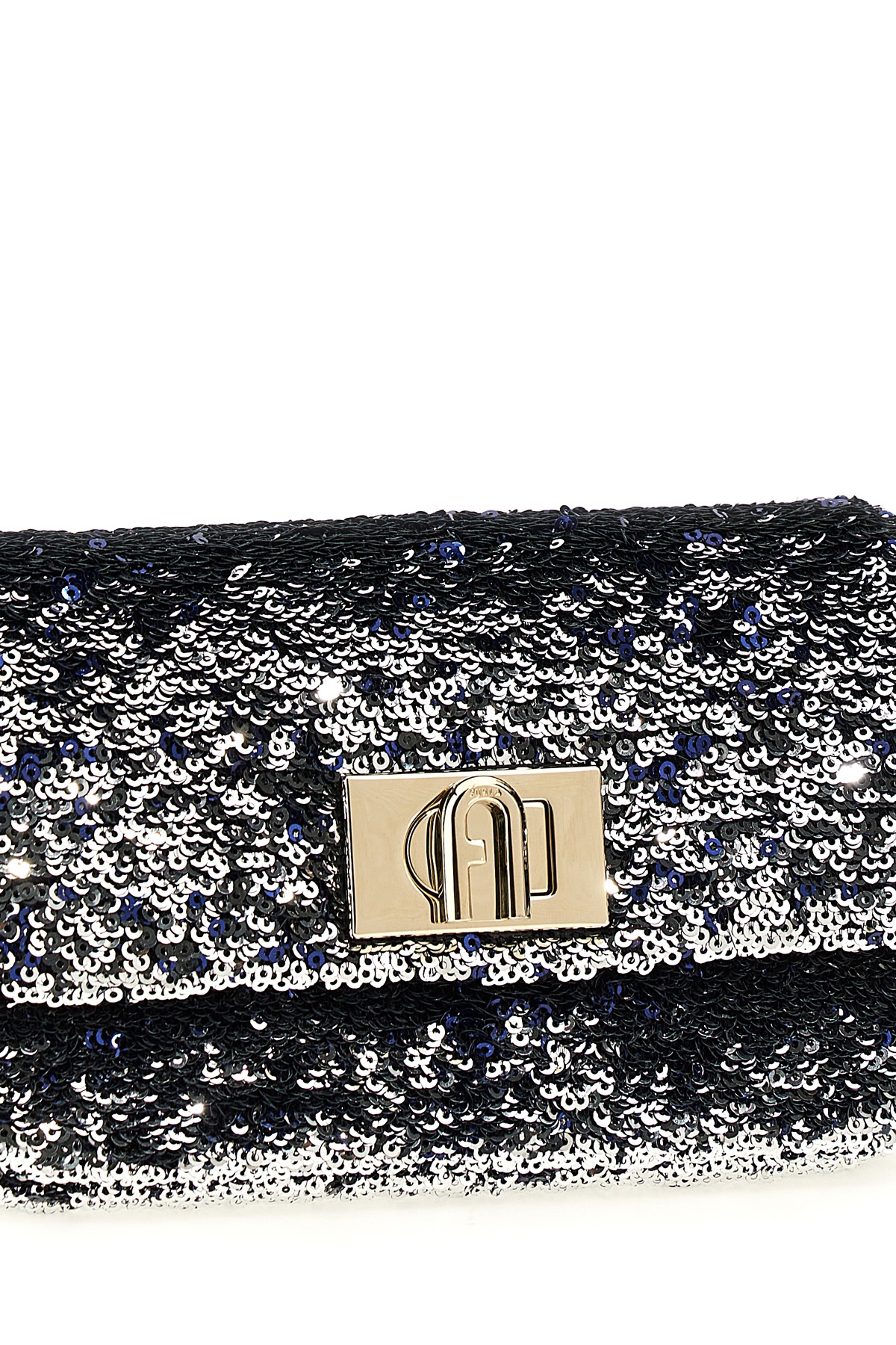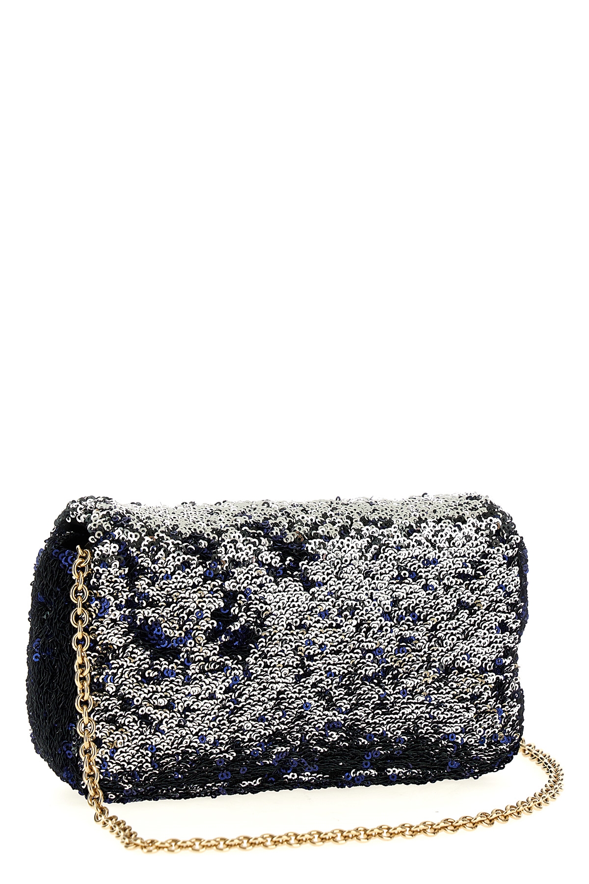 '1927 Mini' fabric shoulder strap covered with all-over sequins, chain shoulder strap, twist closure with metal logo.
