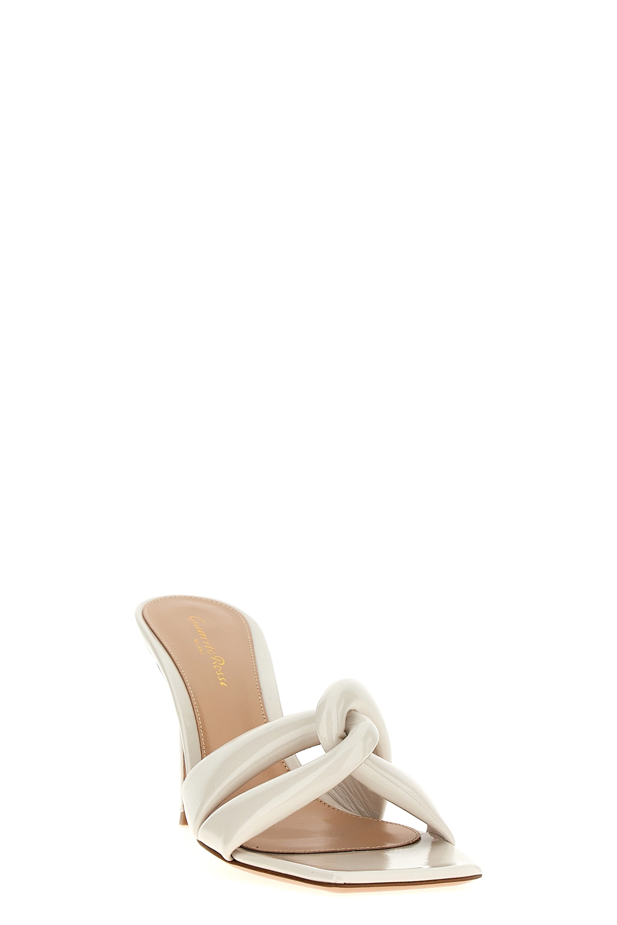 'Amour' mules in shiny leather with front weave, square toe, heel, leather sole.