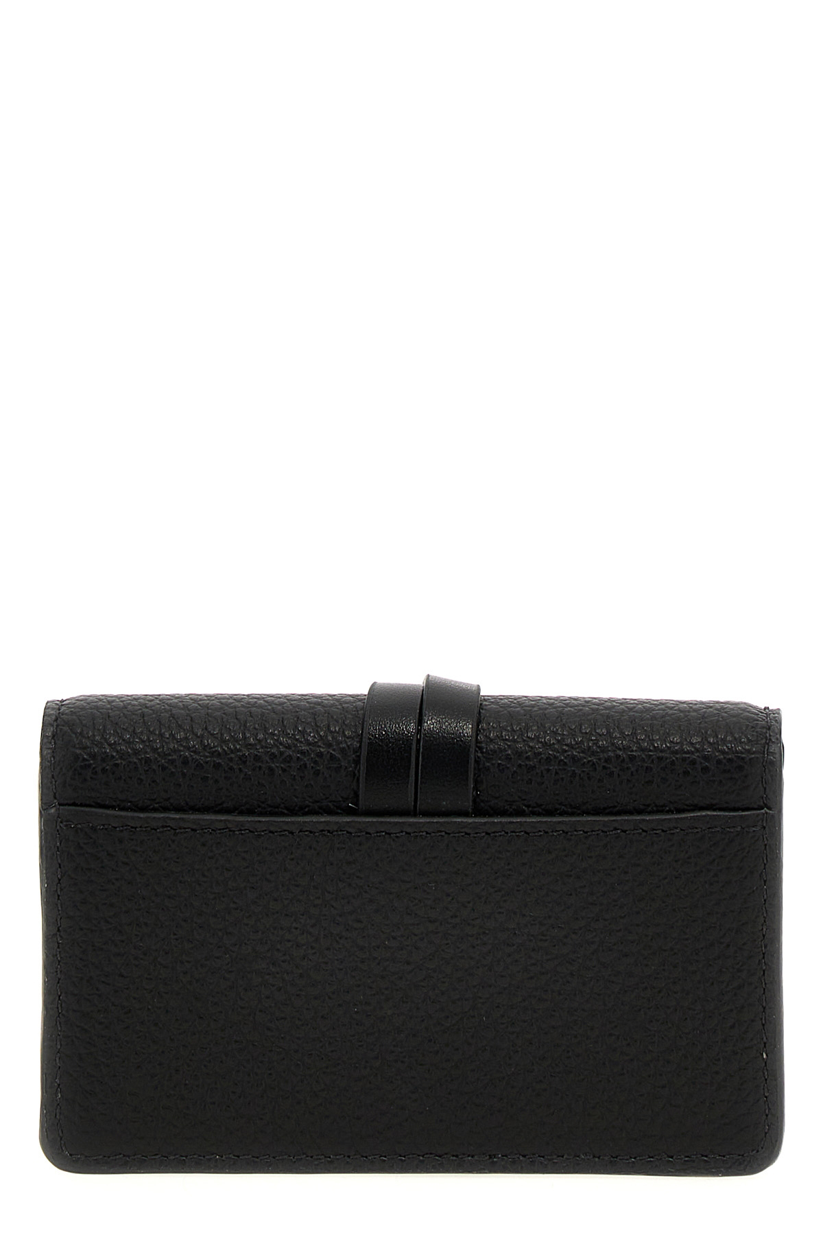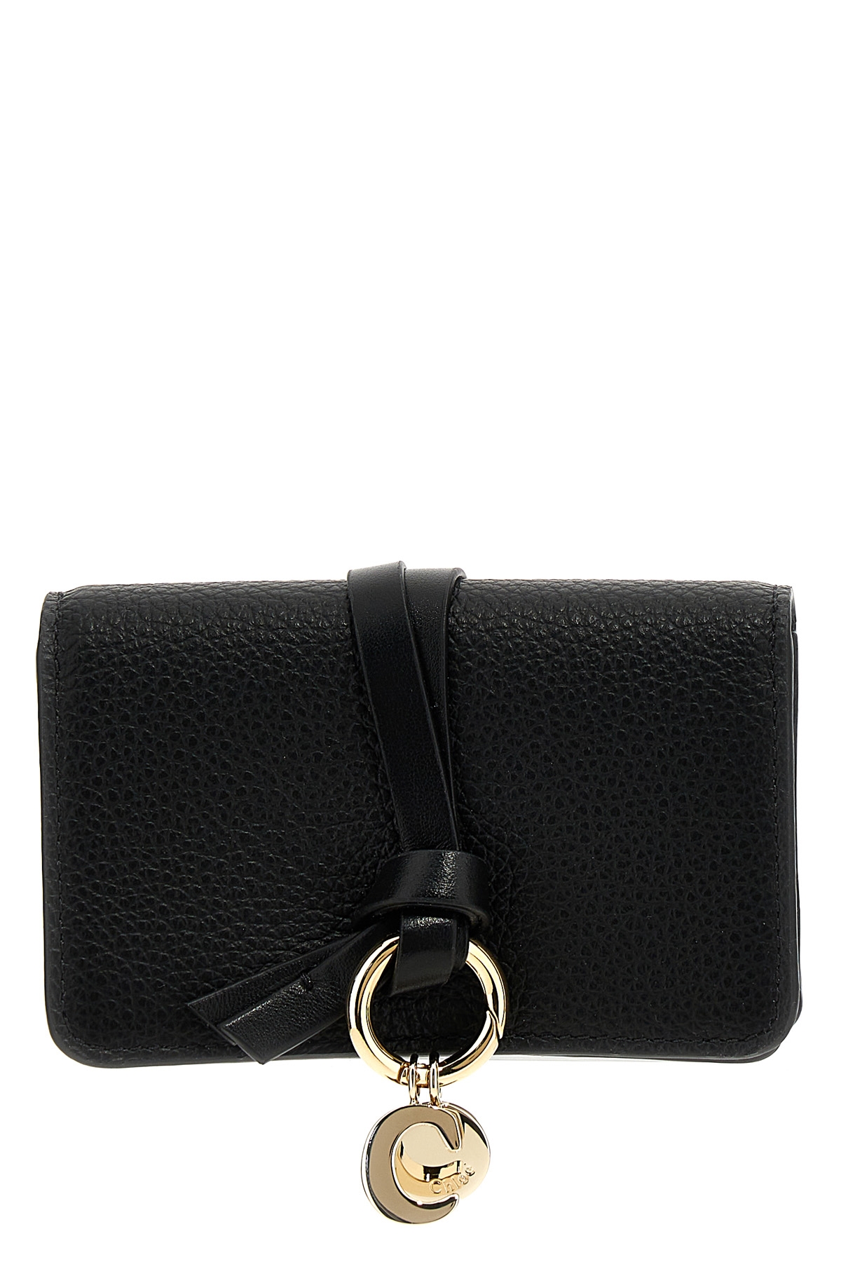 'Alphabet' garnet leather card holder, flap closure with snap button, leather bow detail and removable metal charm.