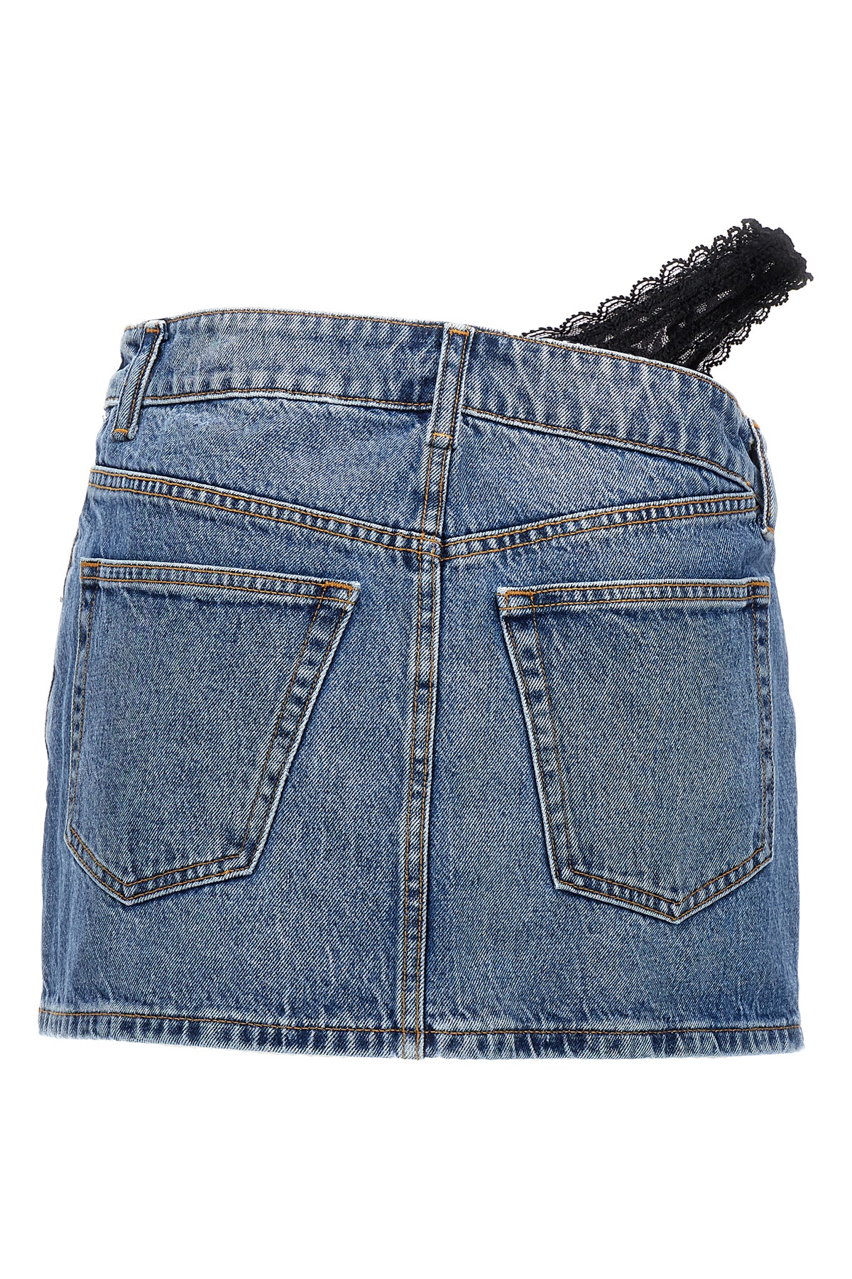 'Dip Side Lace Undie' mini skirt in indigo cotton, asymmetric waistband with integrated faux lace briefs, pockets, button closure.