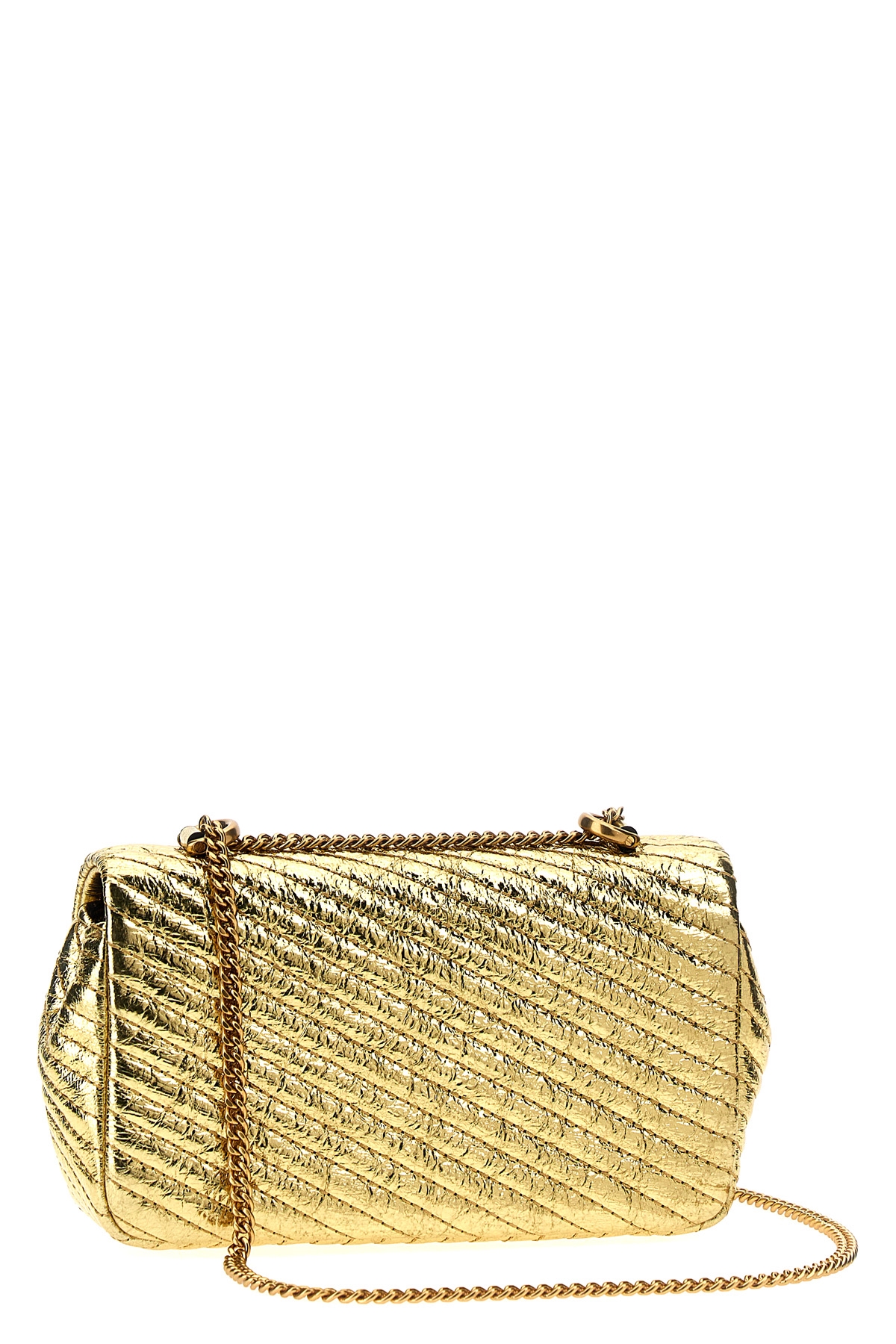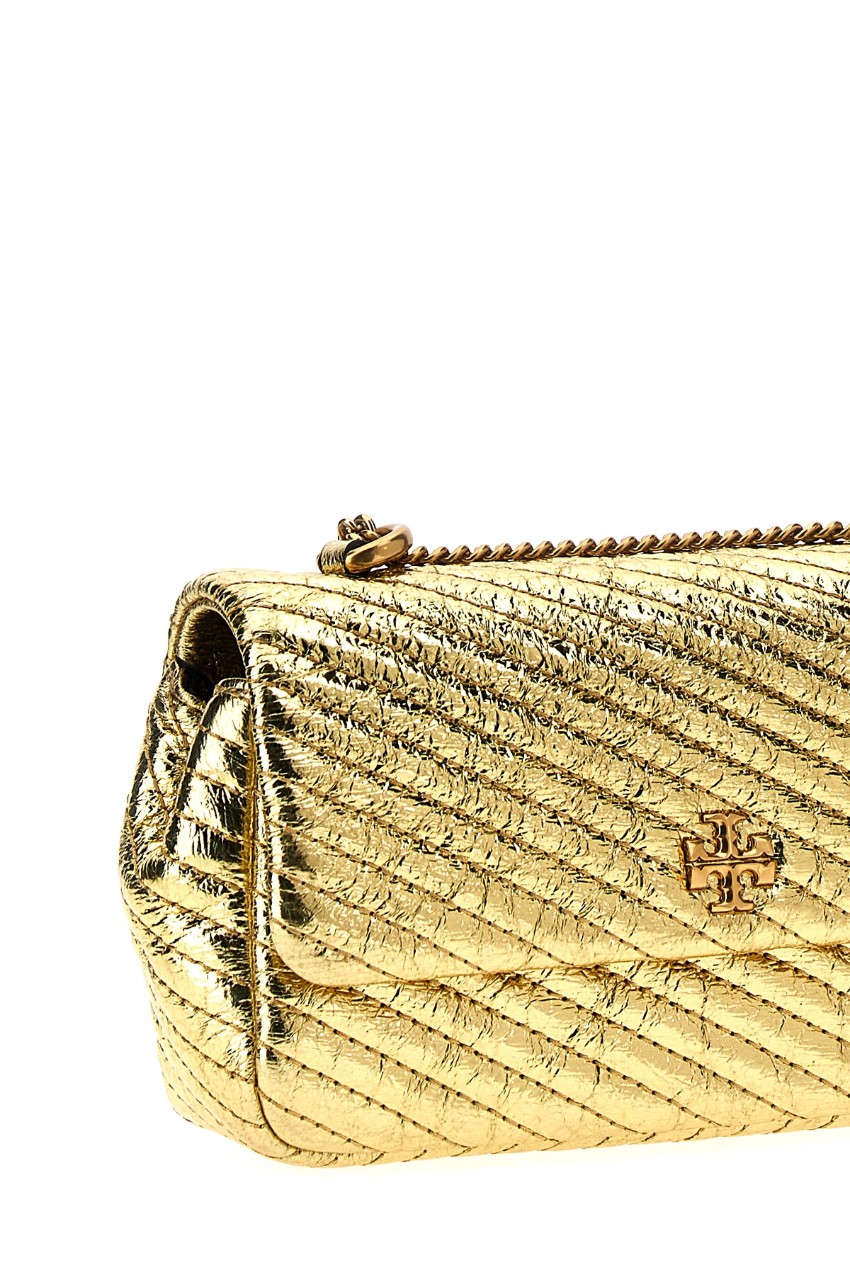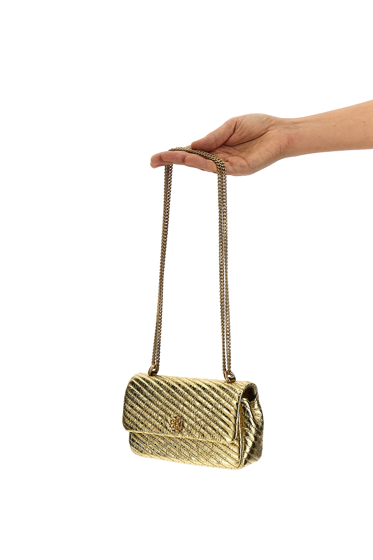'Kira Metallic Moto Quilt Mini' crossbody bag in metallic curled leather, front metal logo, magnetic flap closure, sliding chain shoulder strap.