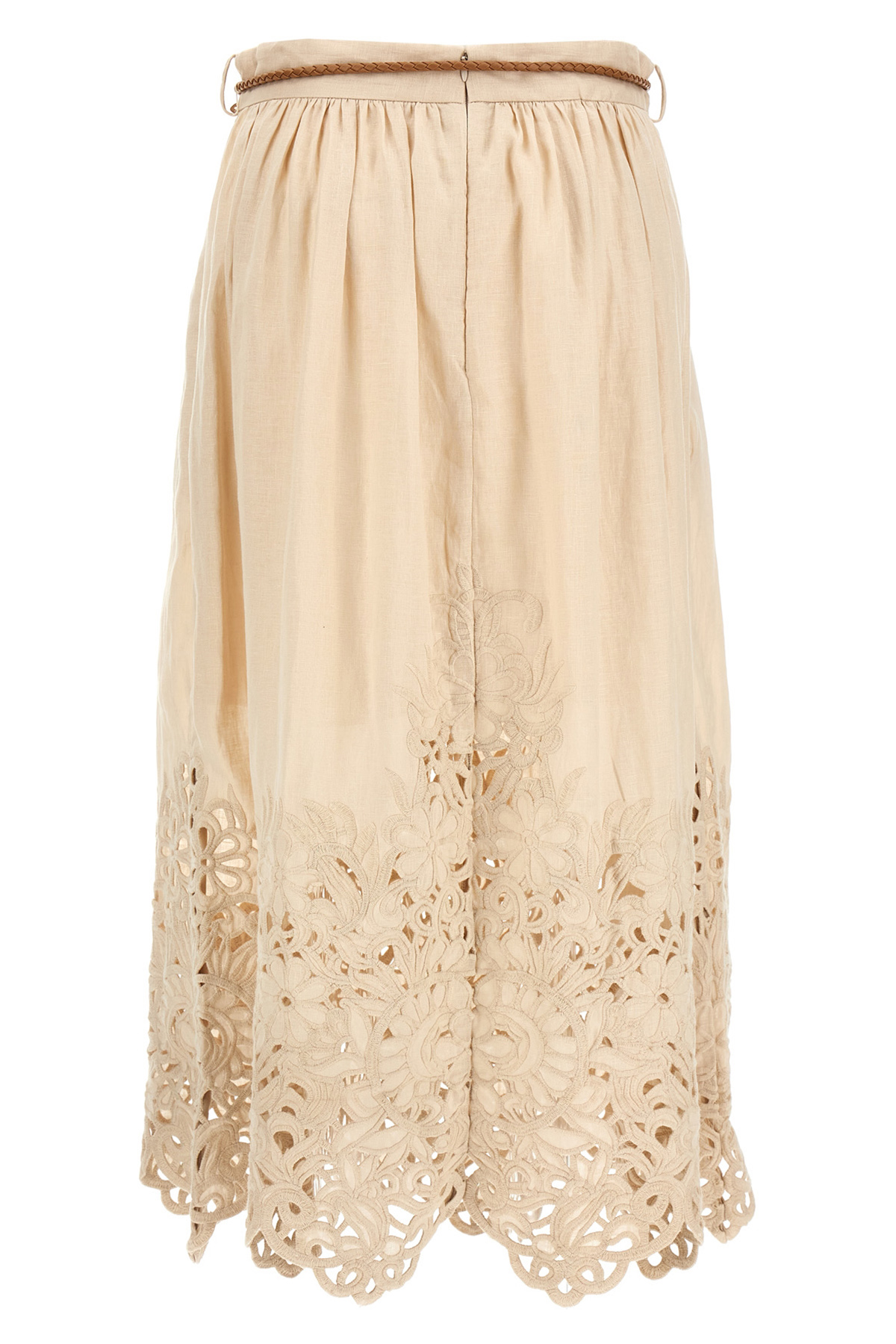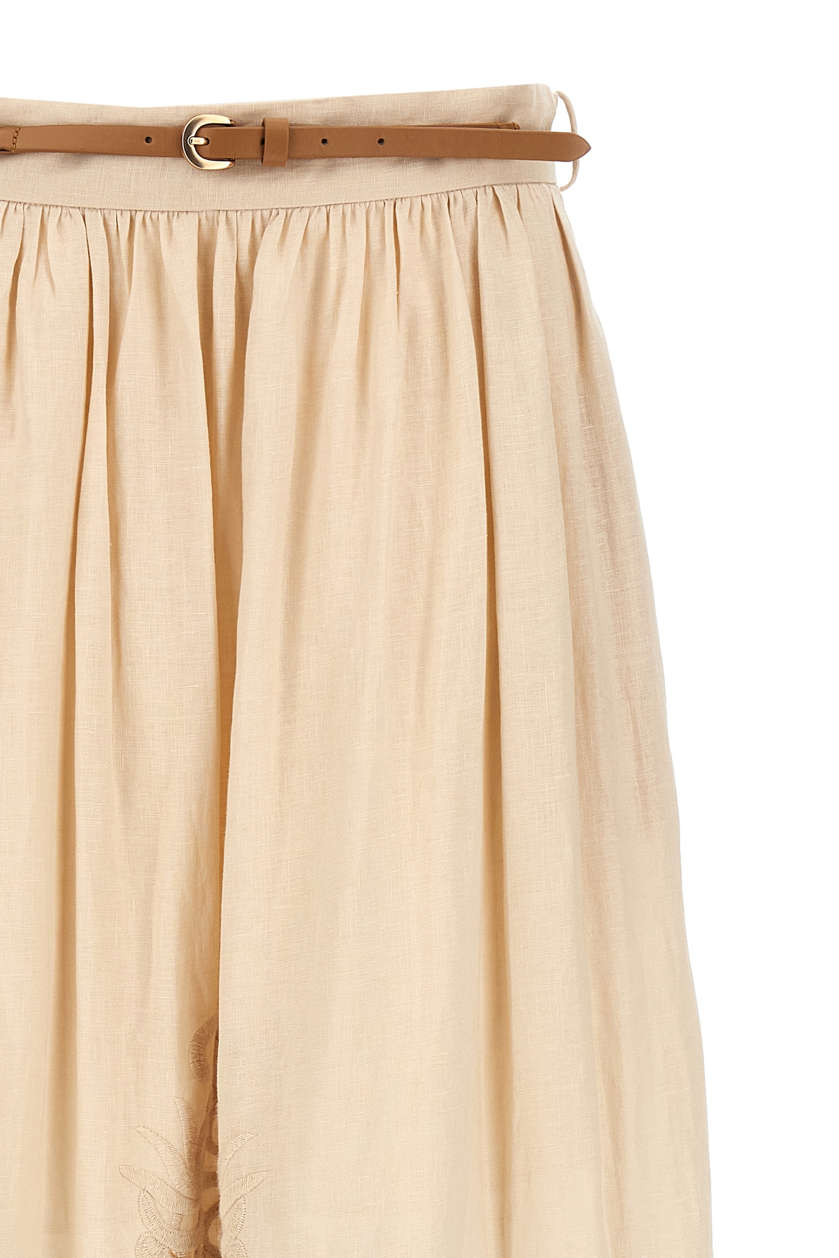 'Wylie' embroidered linen skirt, back zip, cotton underskirt, adjustable and removable waist belt.