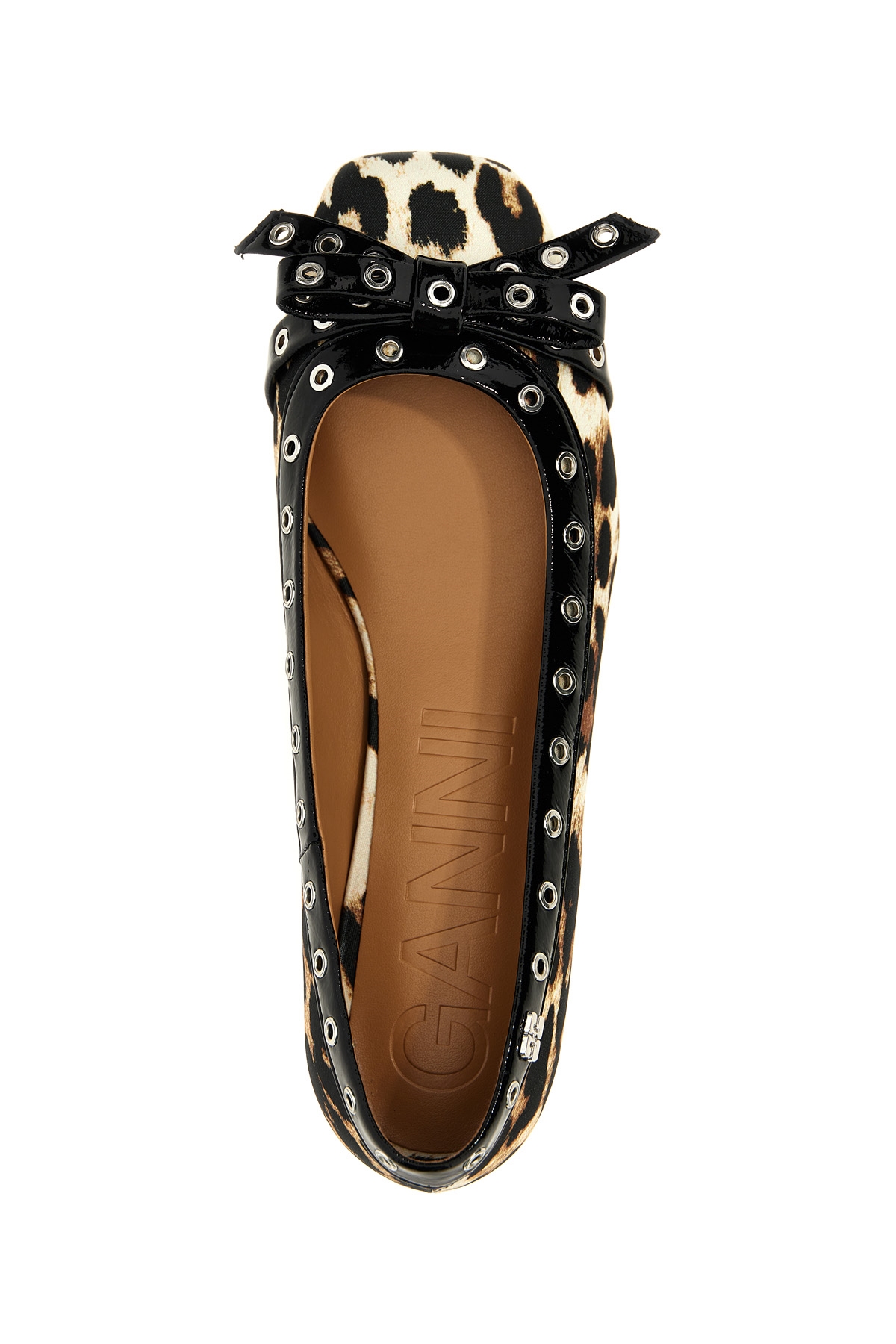 'Leopard Eyelets Bow' ballet flats in paint-effect fabric and leopard print, silver metal studs, front bow, square toe. SUSTAINABLE: Product made from recycled polyester.
