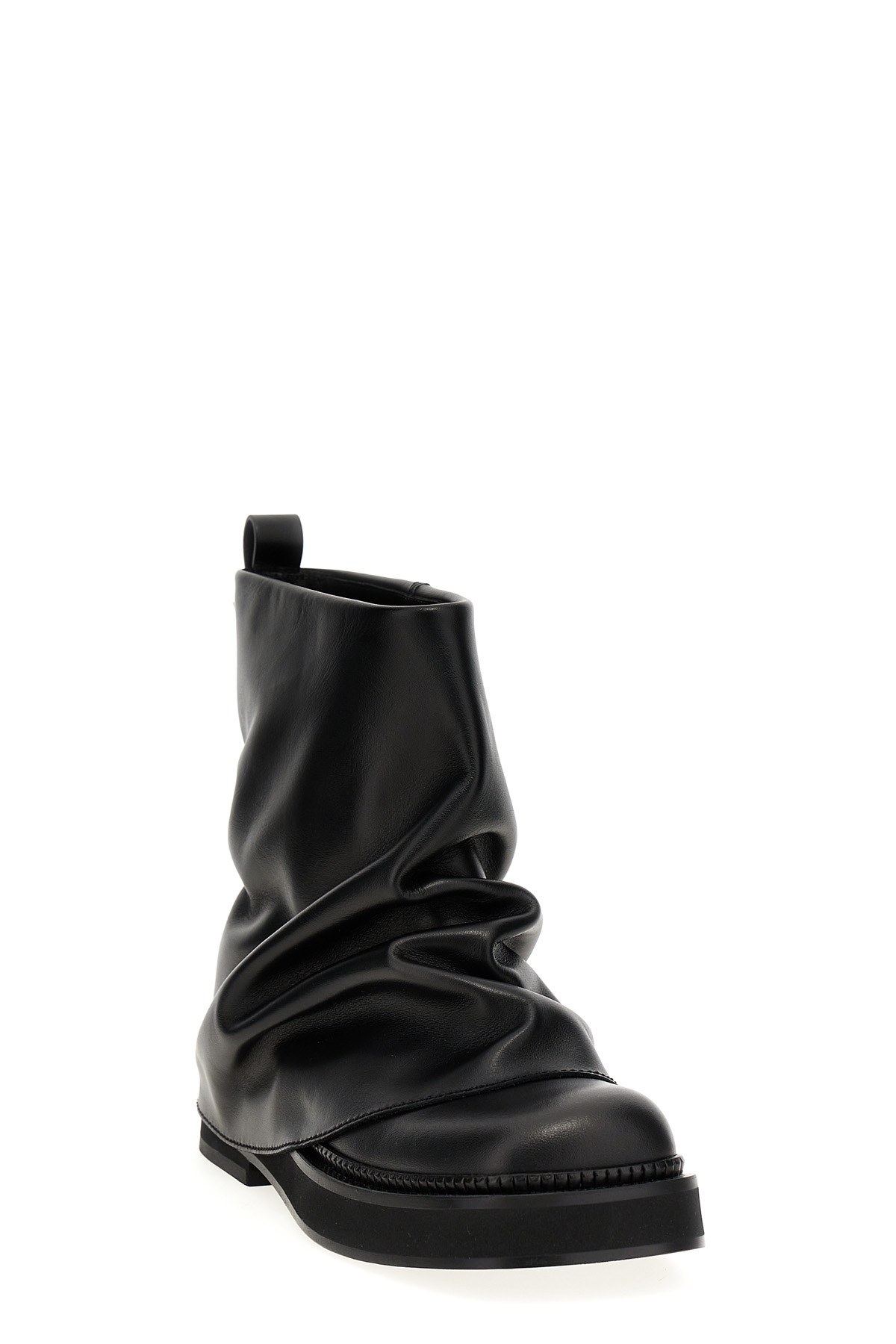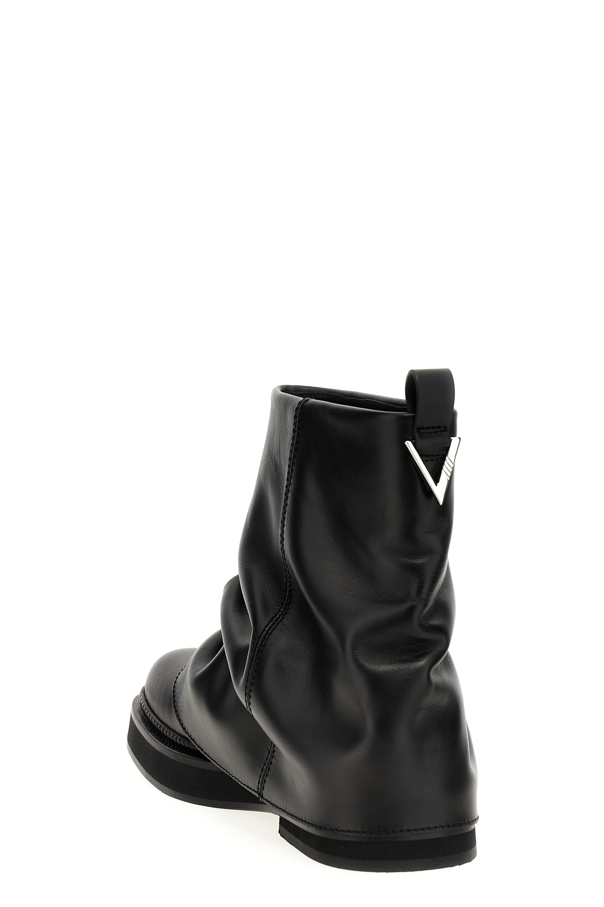 'Mini Robin Combat' crinkled leather ankle boots with rounded toe, metal logo on the back tab, leather sole.