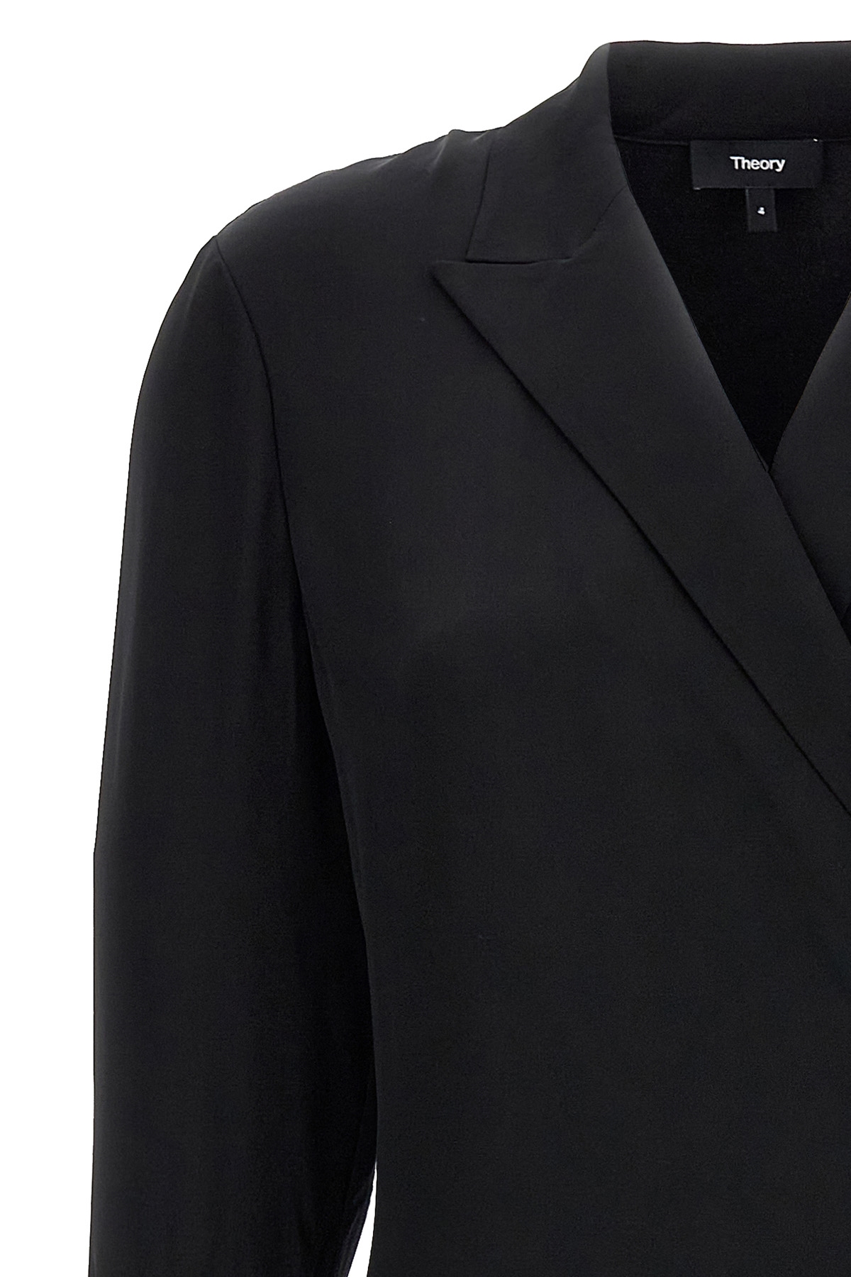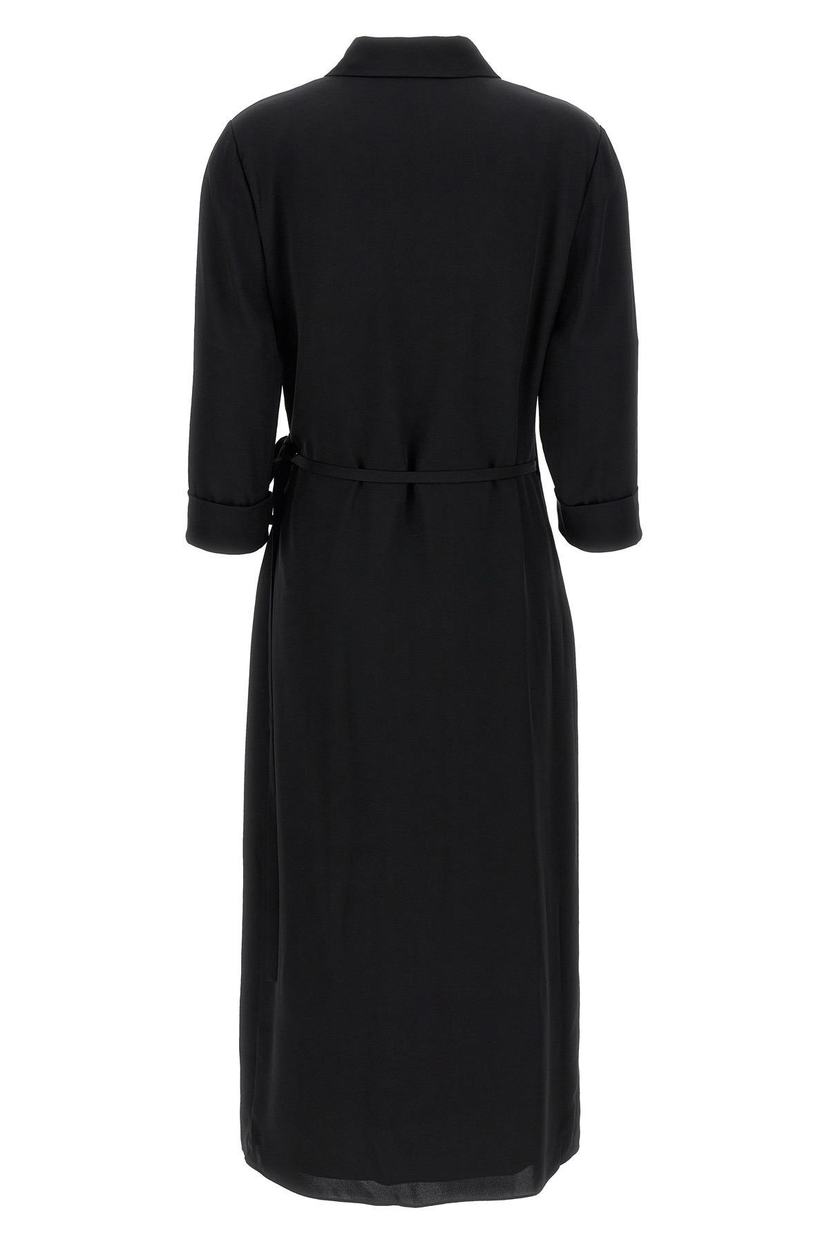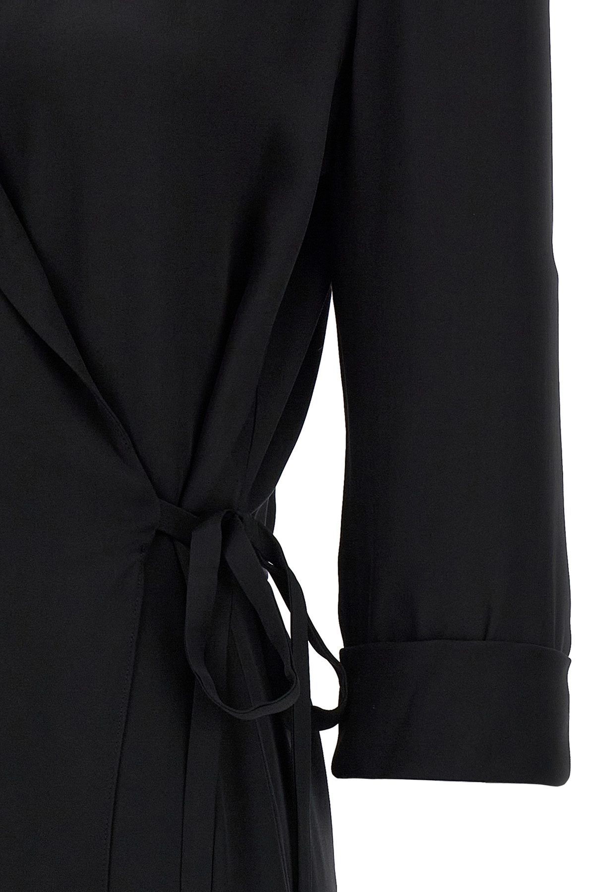 Silk shirt dress with wrap closure with ribbon at the waist, three-quarter sleeves with cuffs.