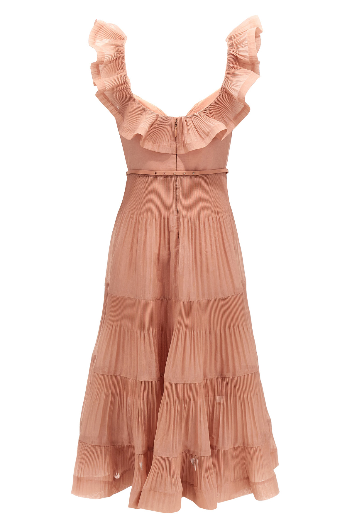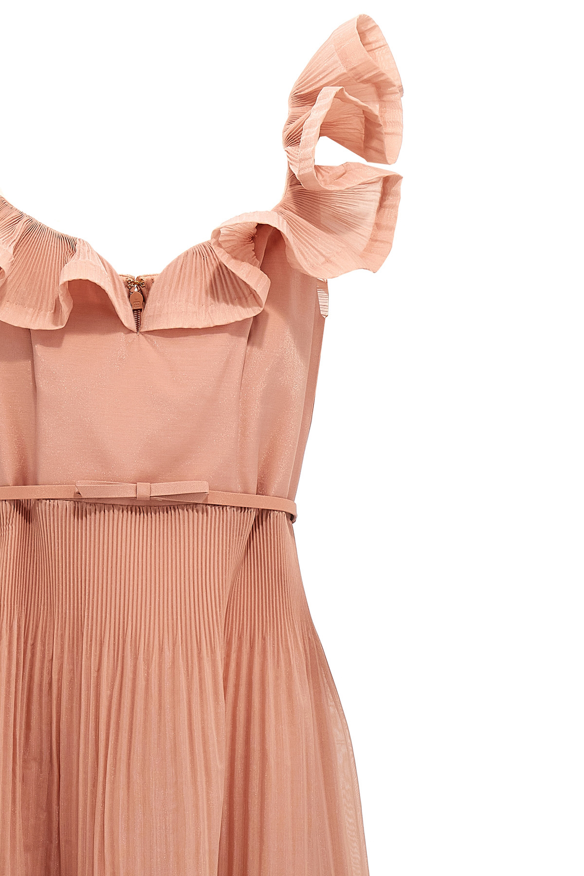 'Pleated Fill Midi' synthetic fabric dress with sweetheart neckline, armholes with ruffles, adjustable and removable tone-on-tone belt, back zip closure, pleated skirt and ruffles, cotton underskirt.