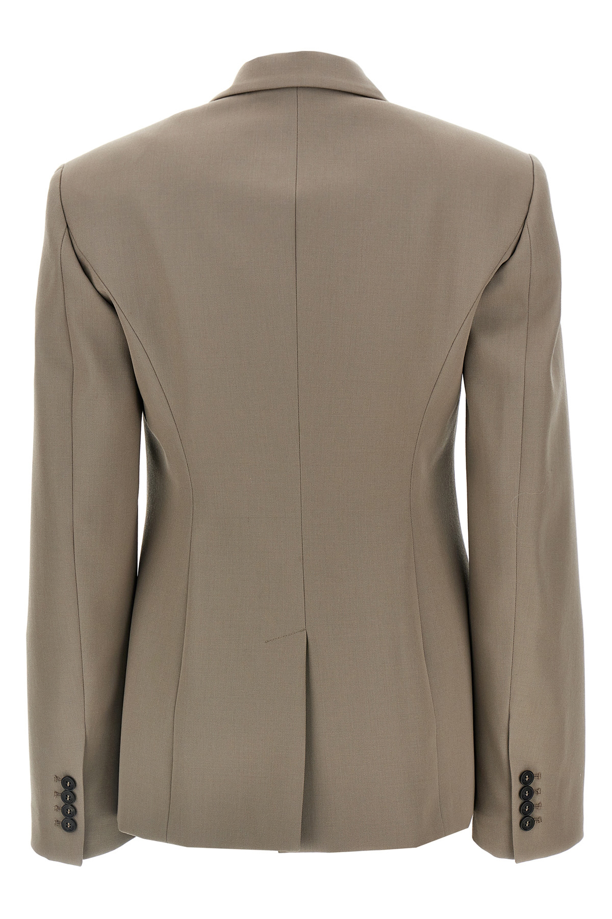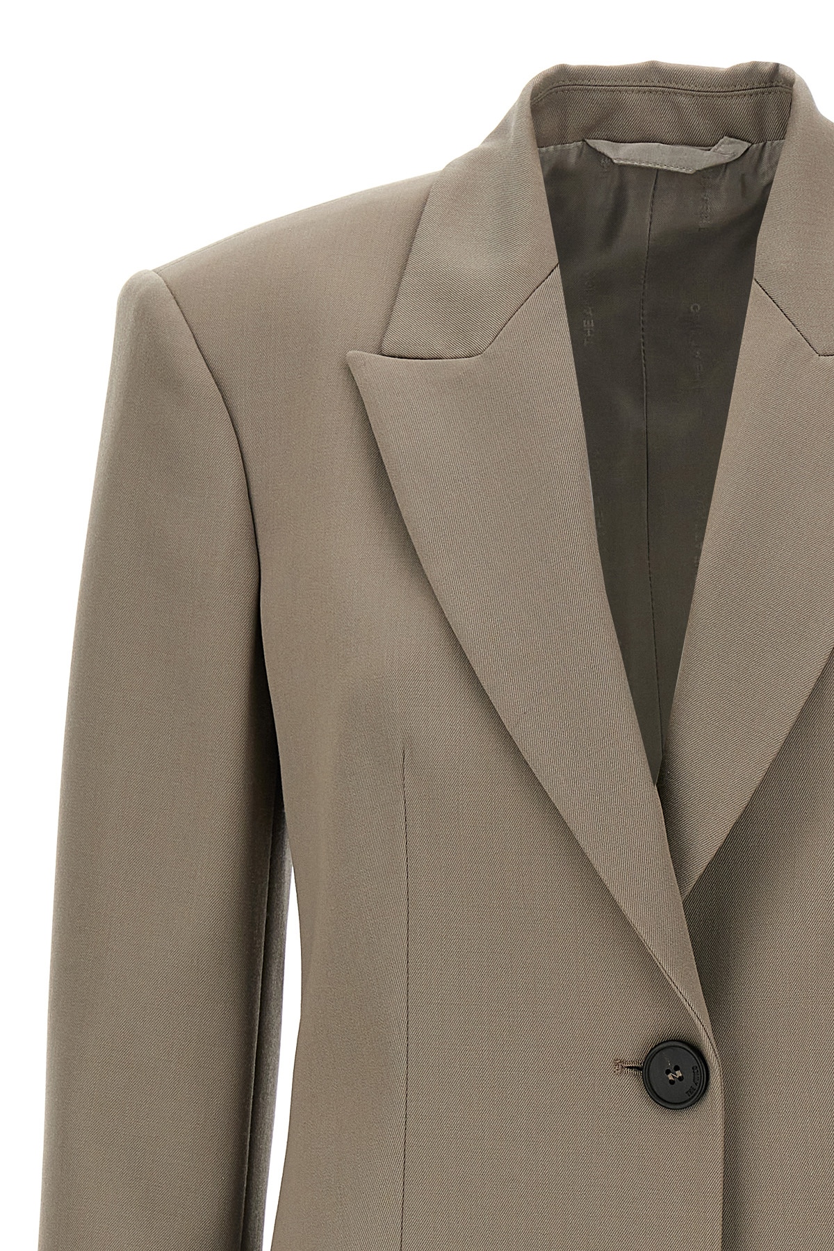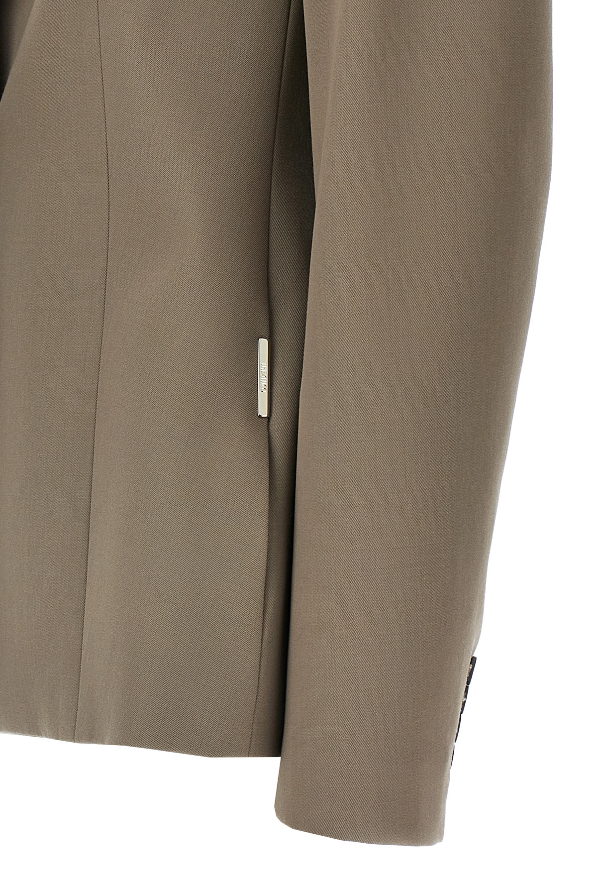 Single-breasted blazer in wool gabardine with flared design, wide long sleeves, all-over logo jacquard lining, peak lapels, button closure, padded shoulders, pockets, back vent.
