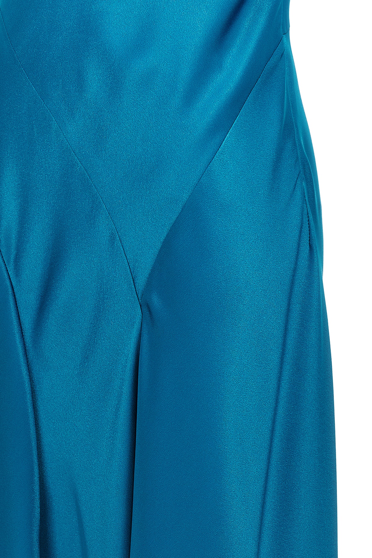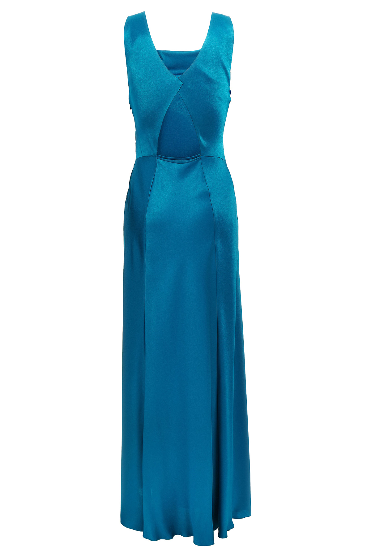 Long satin dress, back cut-out detail, draped neckline, sleeveless, side zip closure.