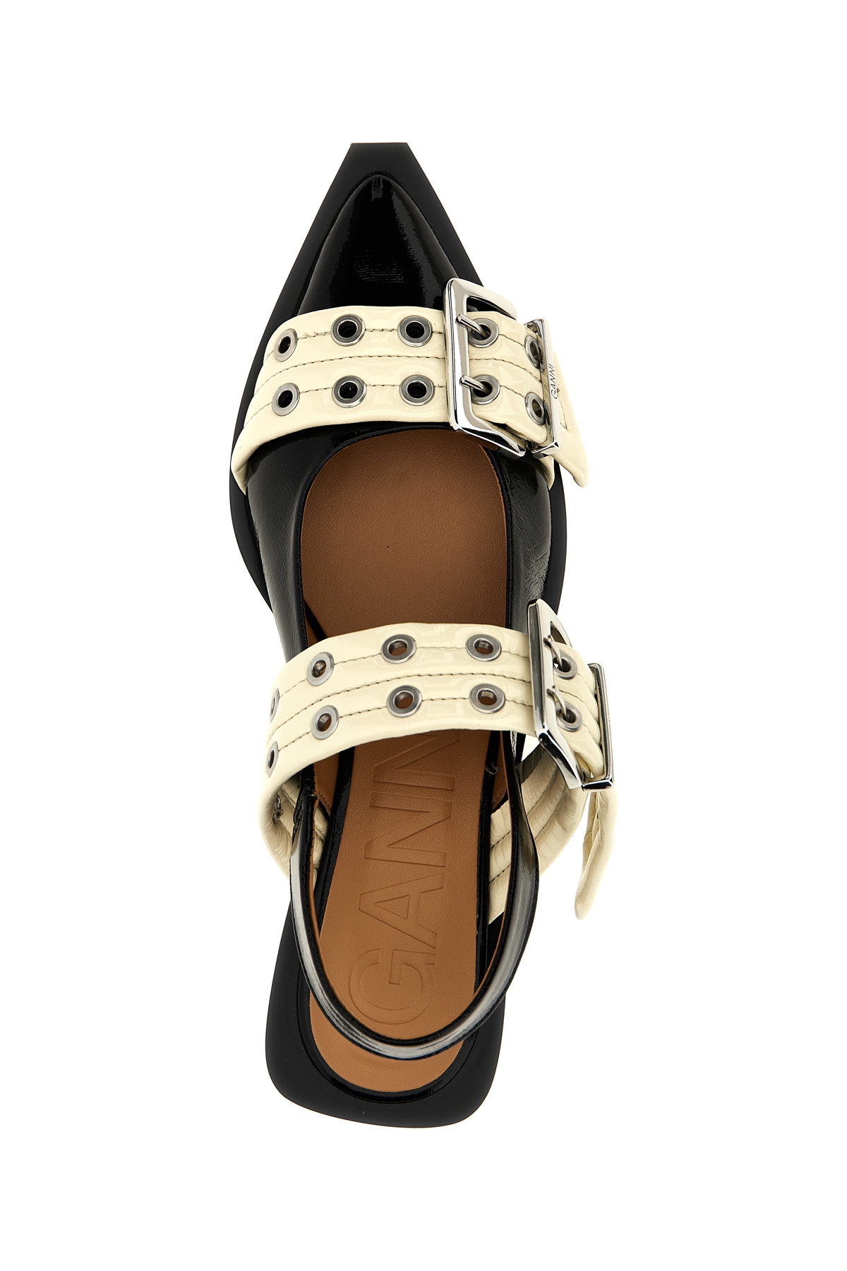 'Chunky Buckle' ballet flats in two-tone shiny leather effect fabric with adjustable belt detail, slingback style.