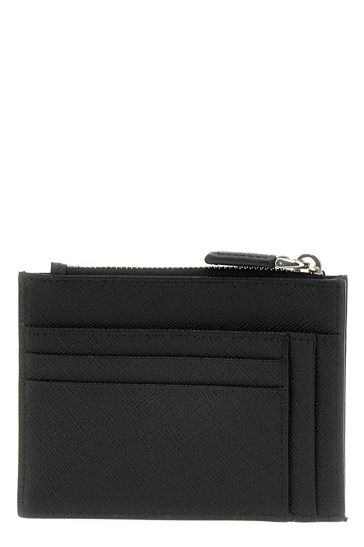 Saffiano leather card holder with triangle enameled metal logo, zip closure, slots for external cards.