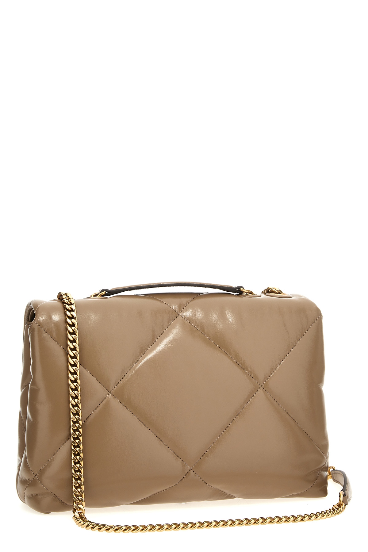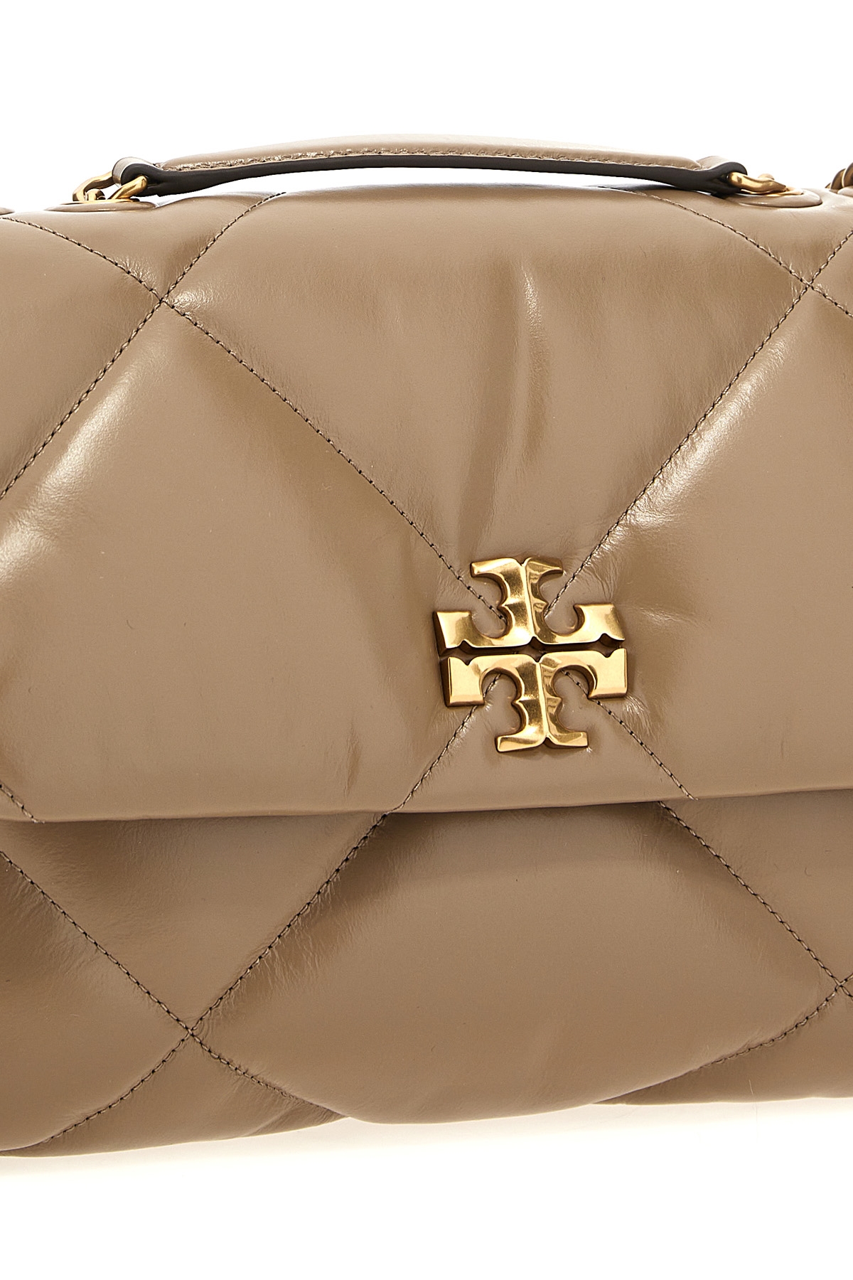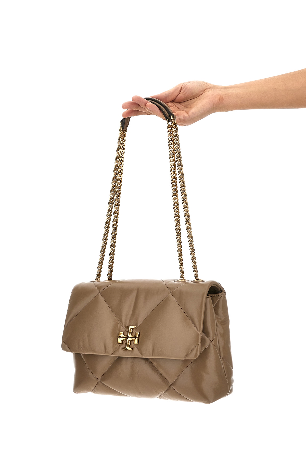 Kira Diamond Quilt Convertible' quilted leather shoulder bag, magnetic flap closure, front metal logo applique, chain and leather handle.