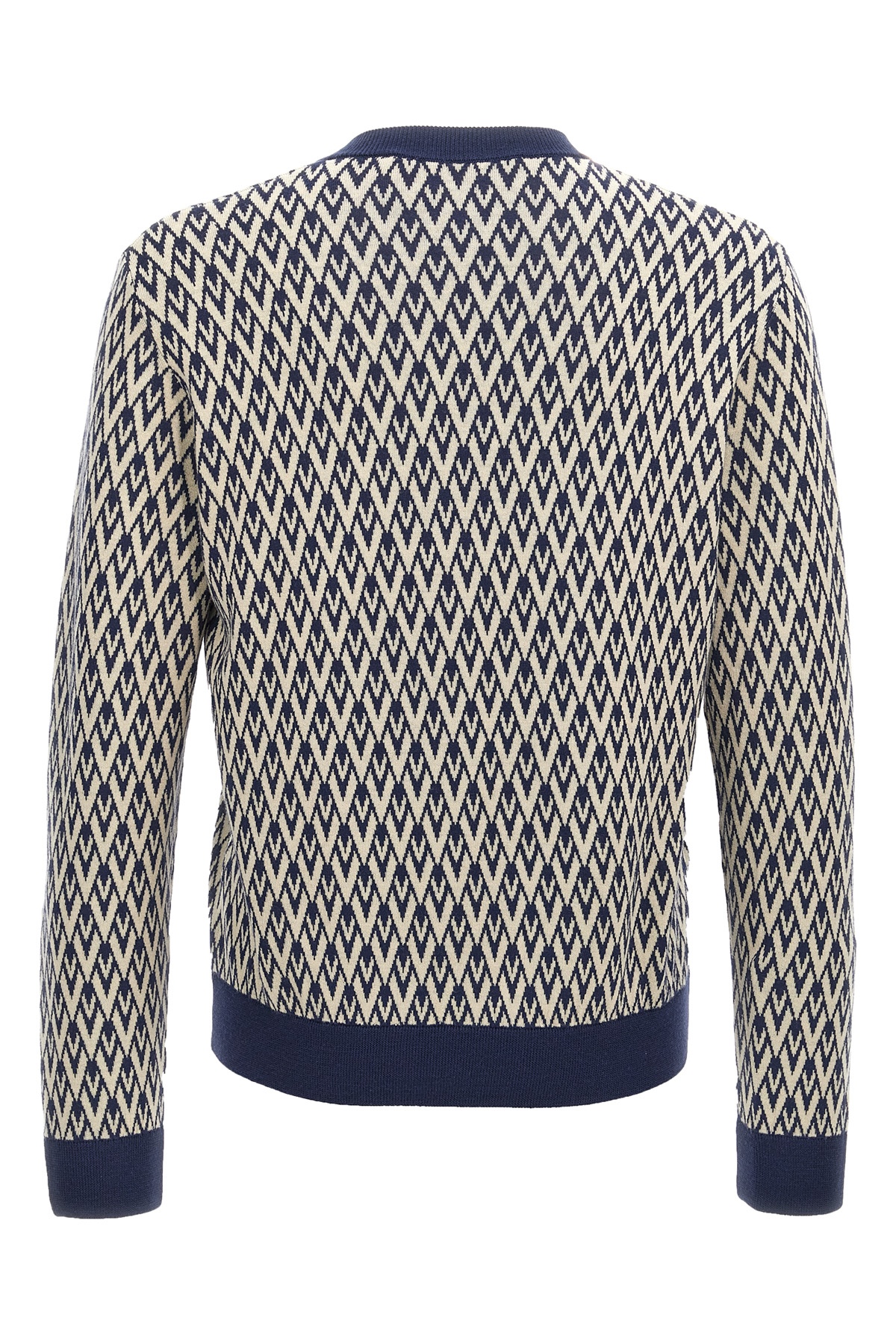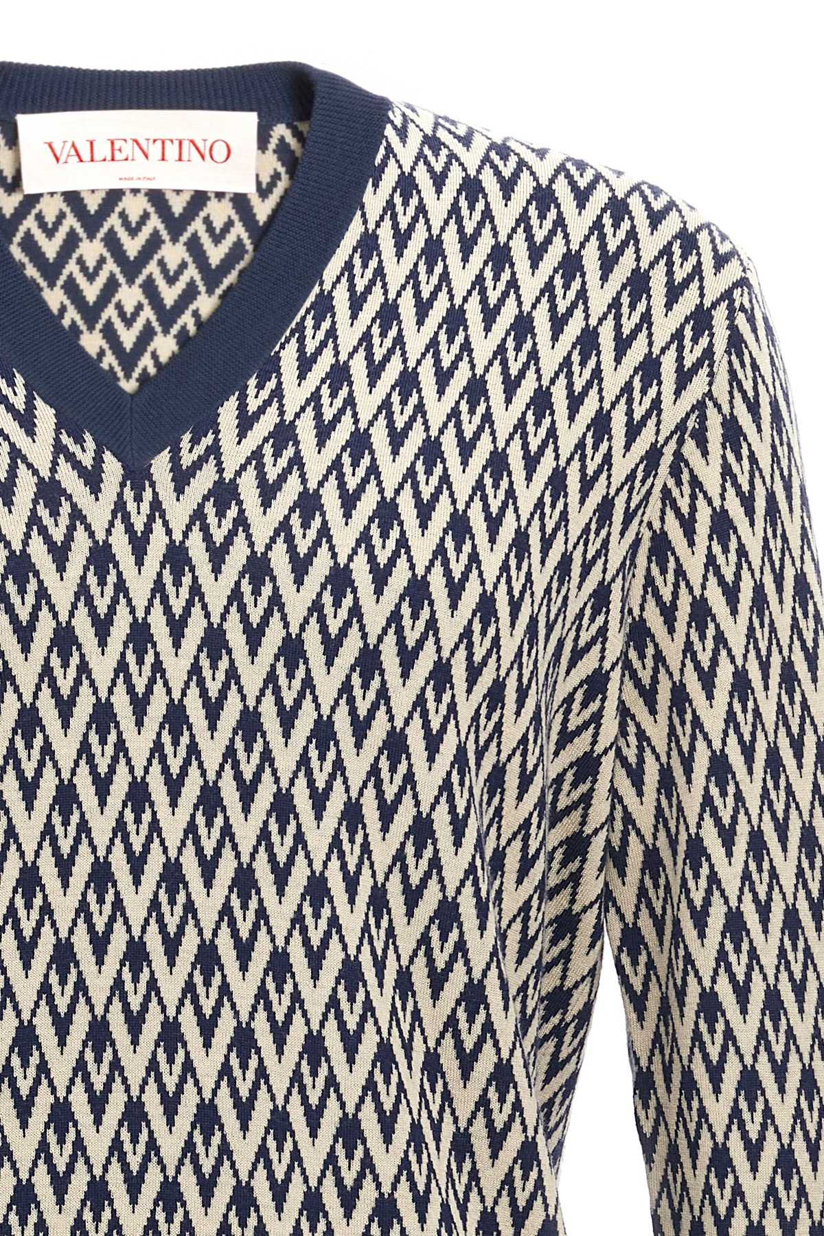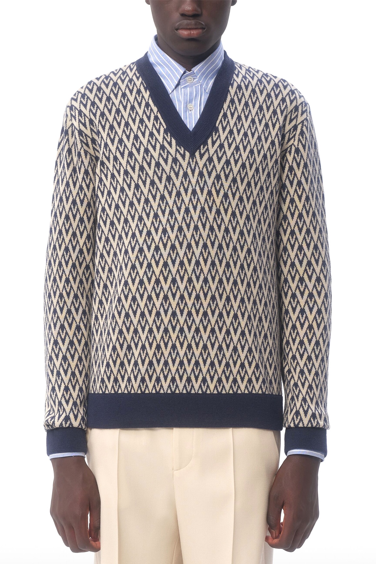 Wool sweater with all-over 'Toute La V' jacquard pattern, V-neck, long cuffed sleeves, and contrast piping.