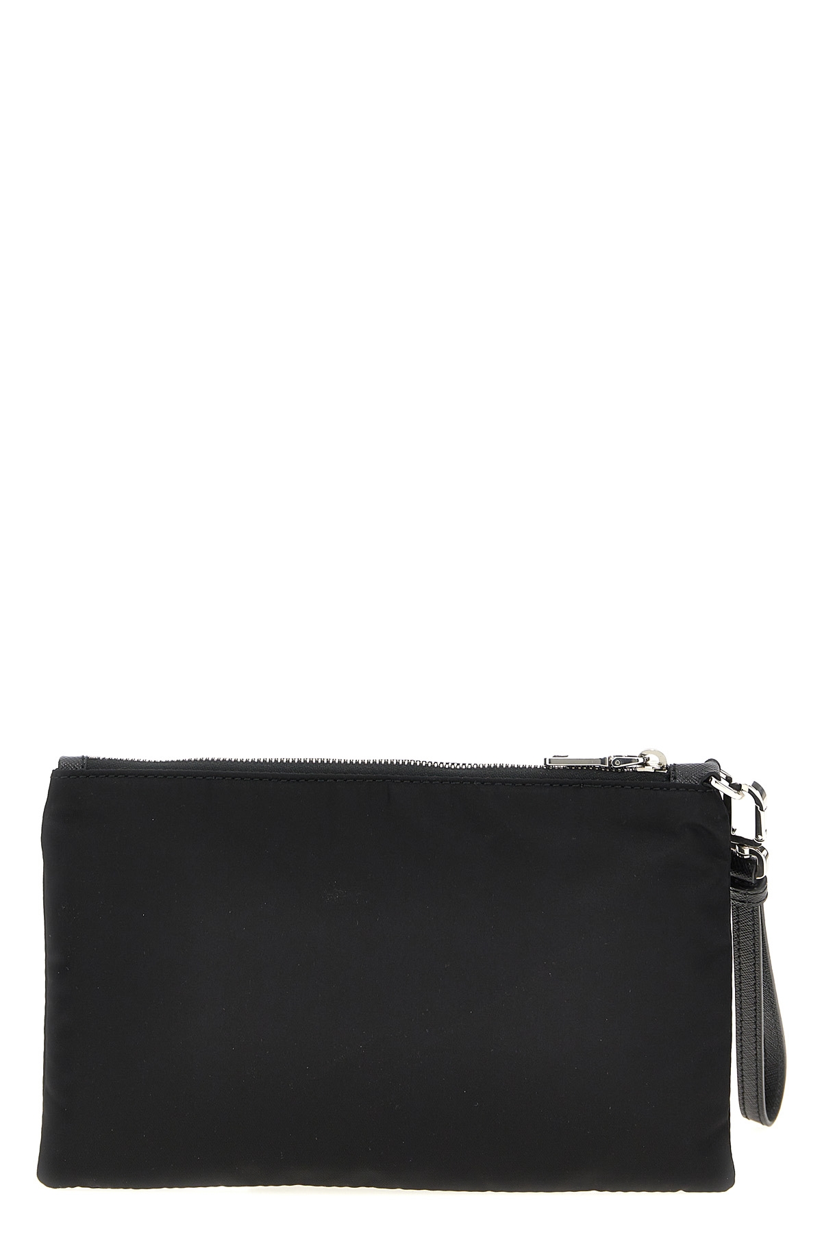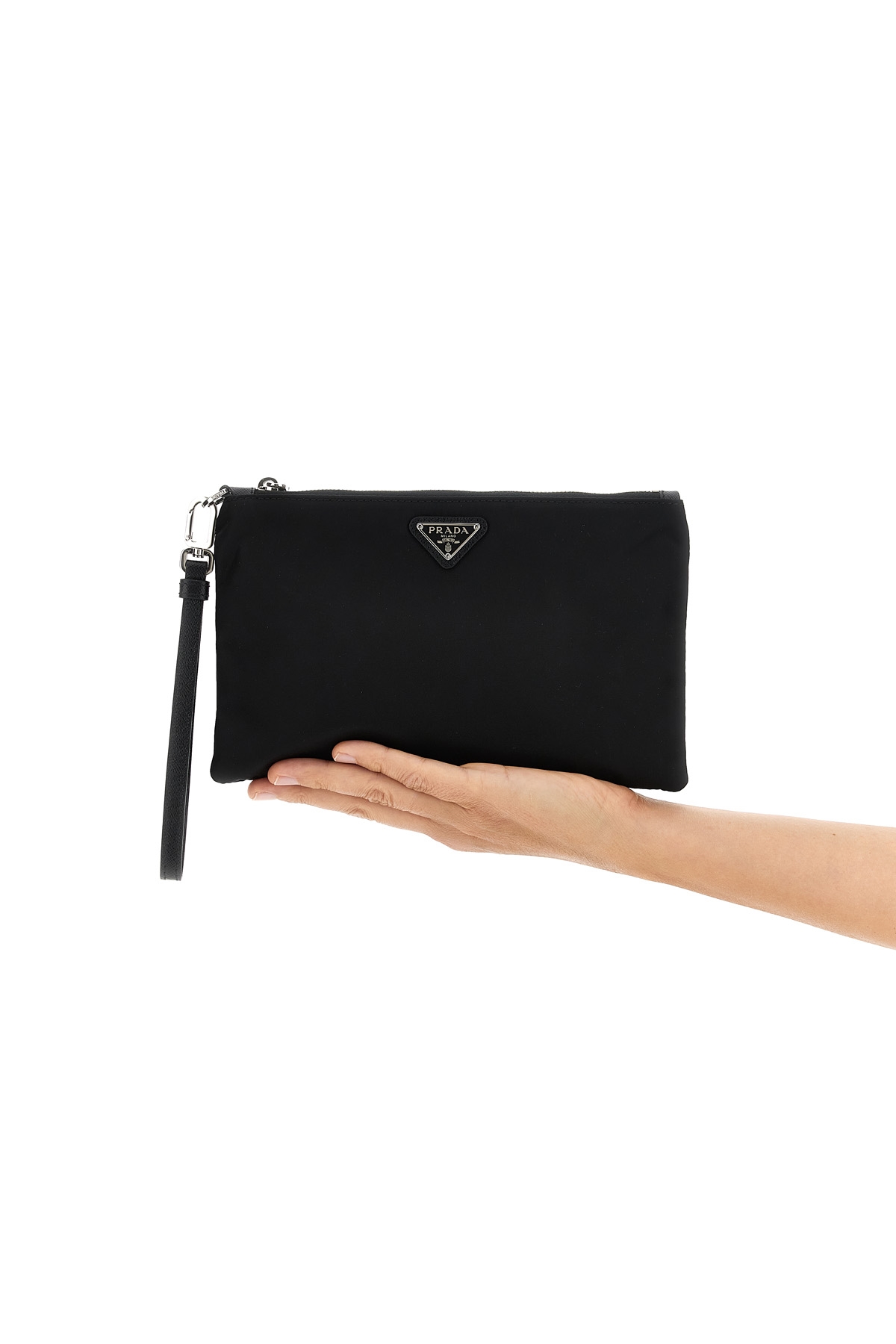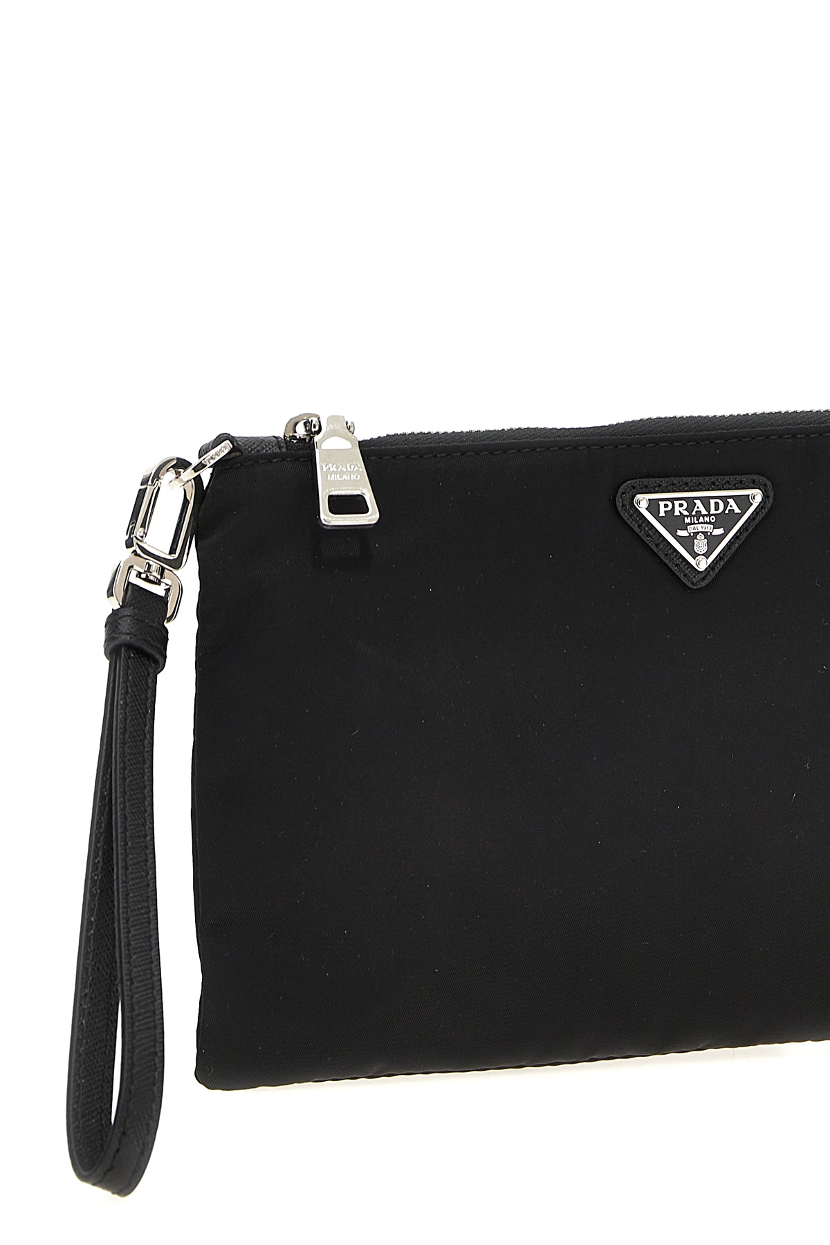 Re-Nylon clutch bag with saffiano leather details, triangle logo patch in enameled metal on the front, zip closure, removable wrist handle.