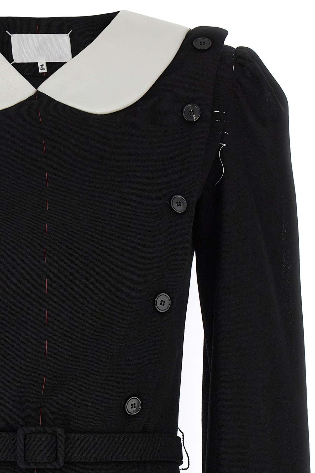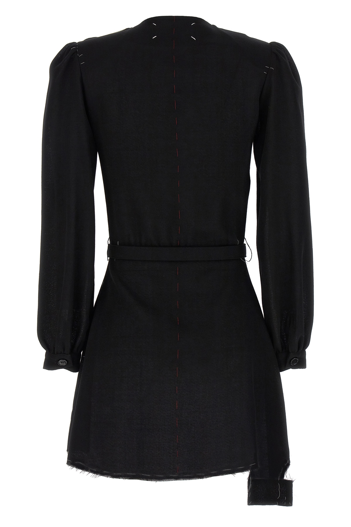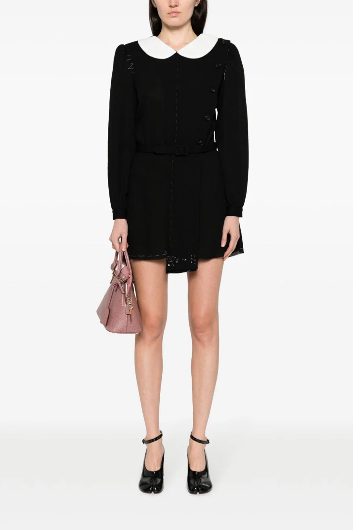Wool dress with unfinished effect stitching, contrasting collar, long cuffed sleeves, adjustable waist belt.