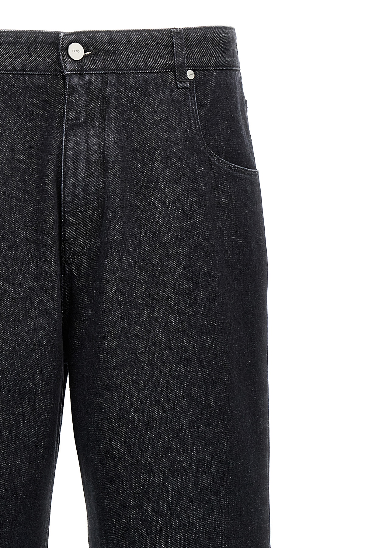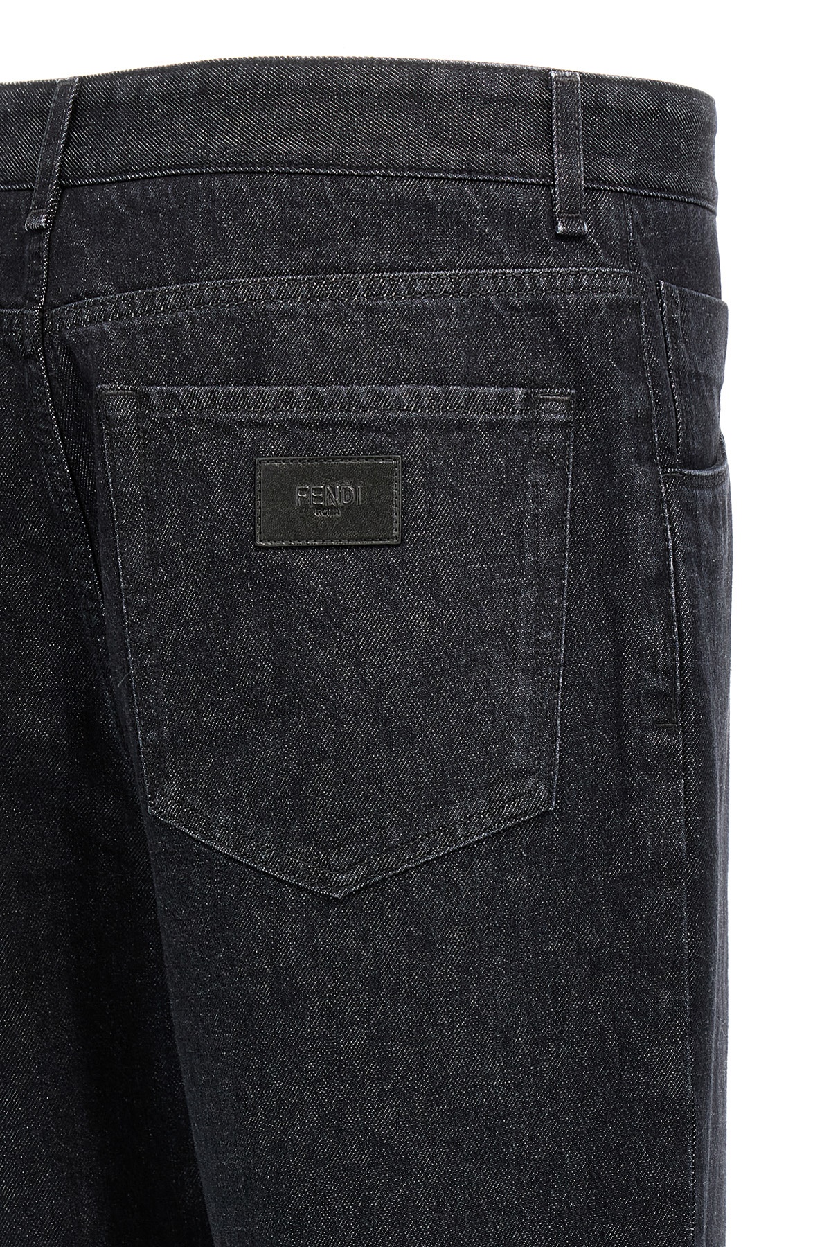 Five-pocket cotton denim jeans, straight leg, zip and button closure, FF logo interior, Fendi Roma leather patch on the back pocket.