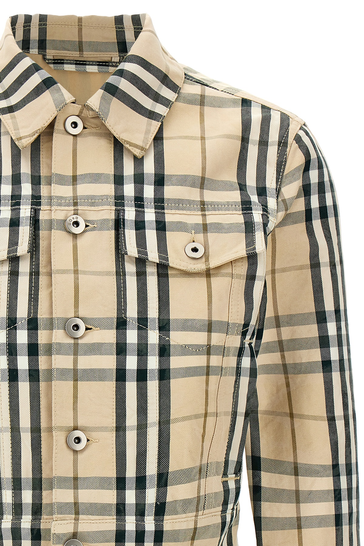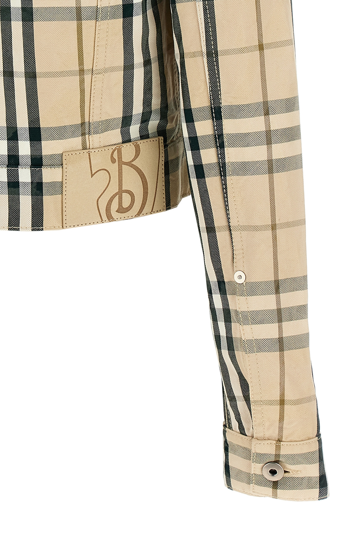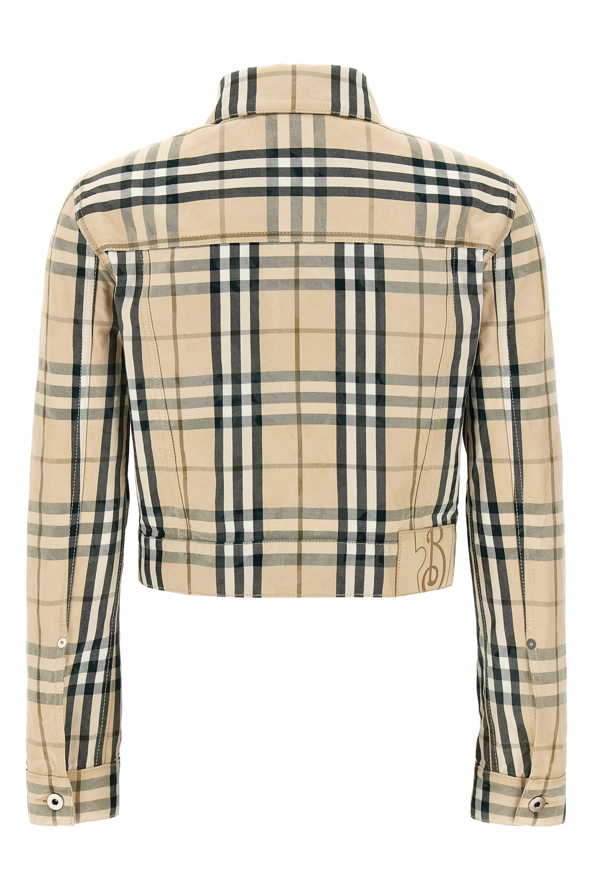 Burberry Check cotton denim jacket, cropped model, back suede logo tag, button closure, pockets, long cuffed sleeves.
