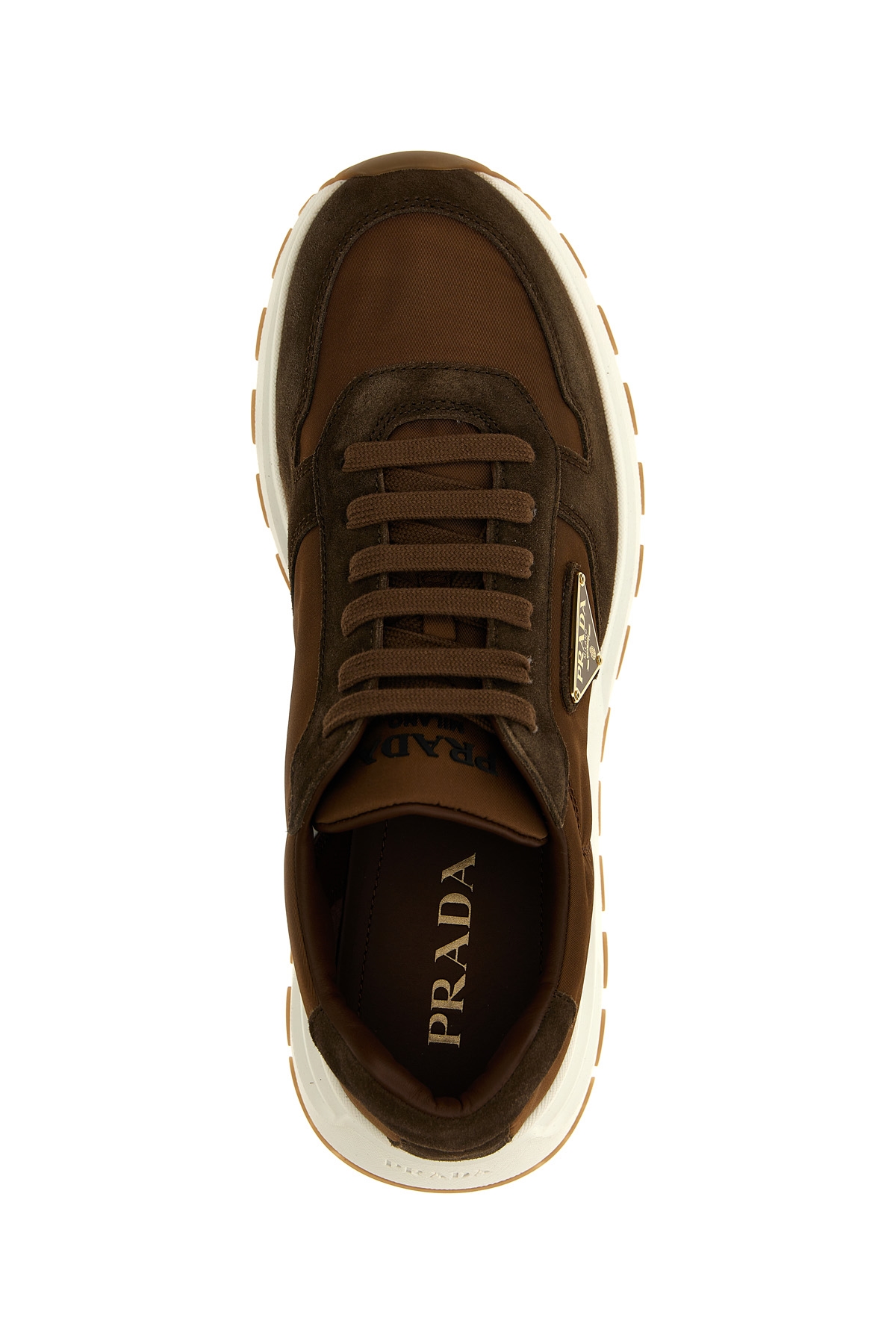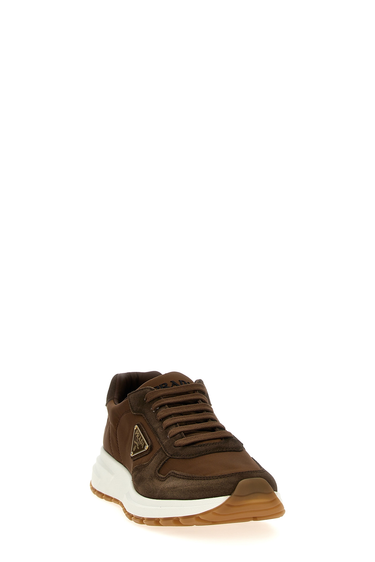 Delave suede and Re-Nylon sneakers, enameled metal logo application, lace-up closure, rubber sole.