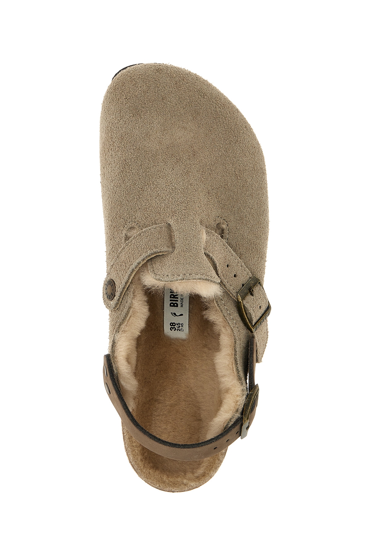'Tokio' suede mules with lamb fur lining, straps with adjustable metal pin closures, cork fussbett, EVA sole.