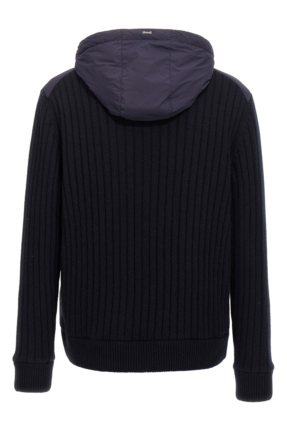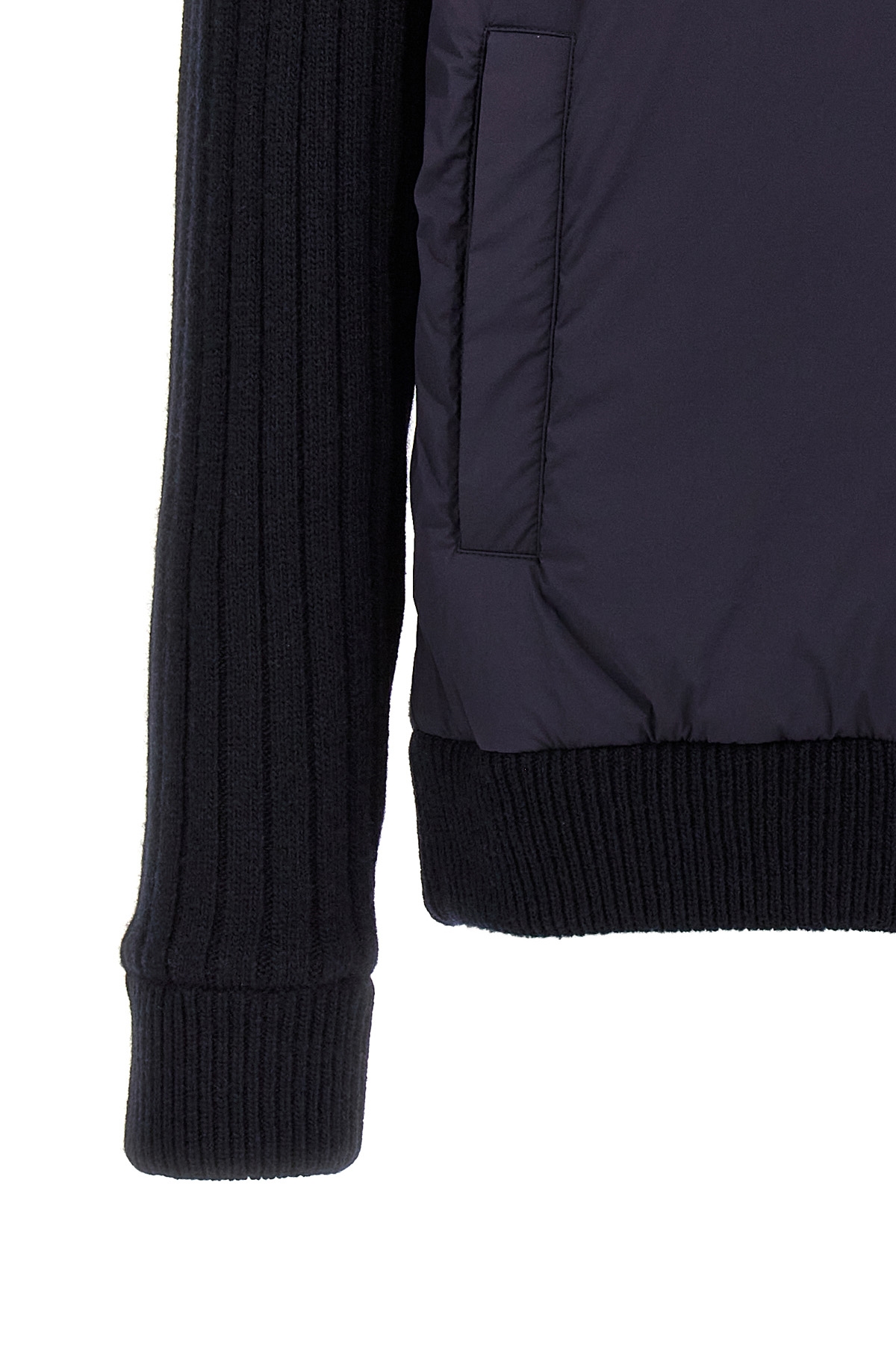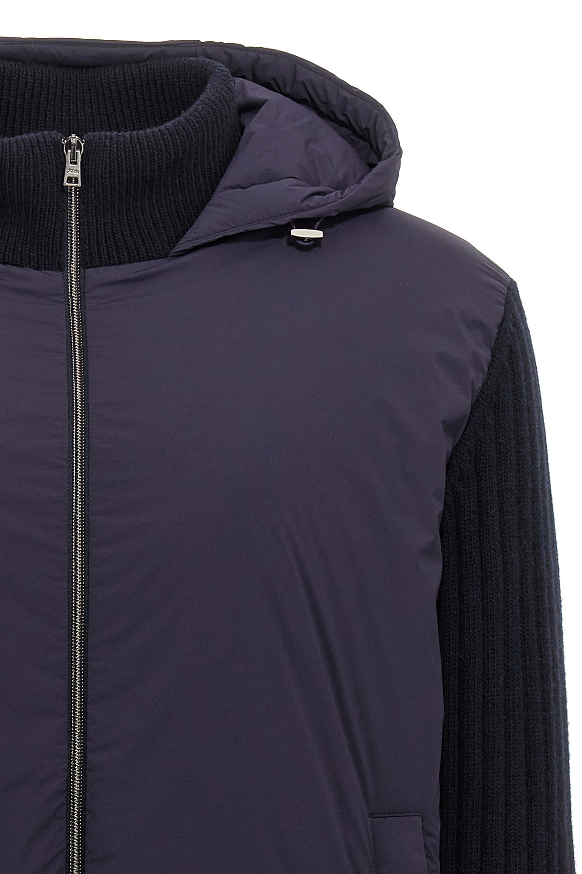 Nylon hooded jacket with knit insert, zip closure, pockets, long cuffed sleeves.