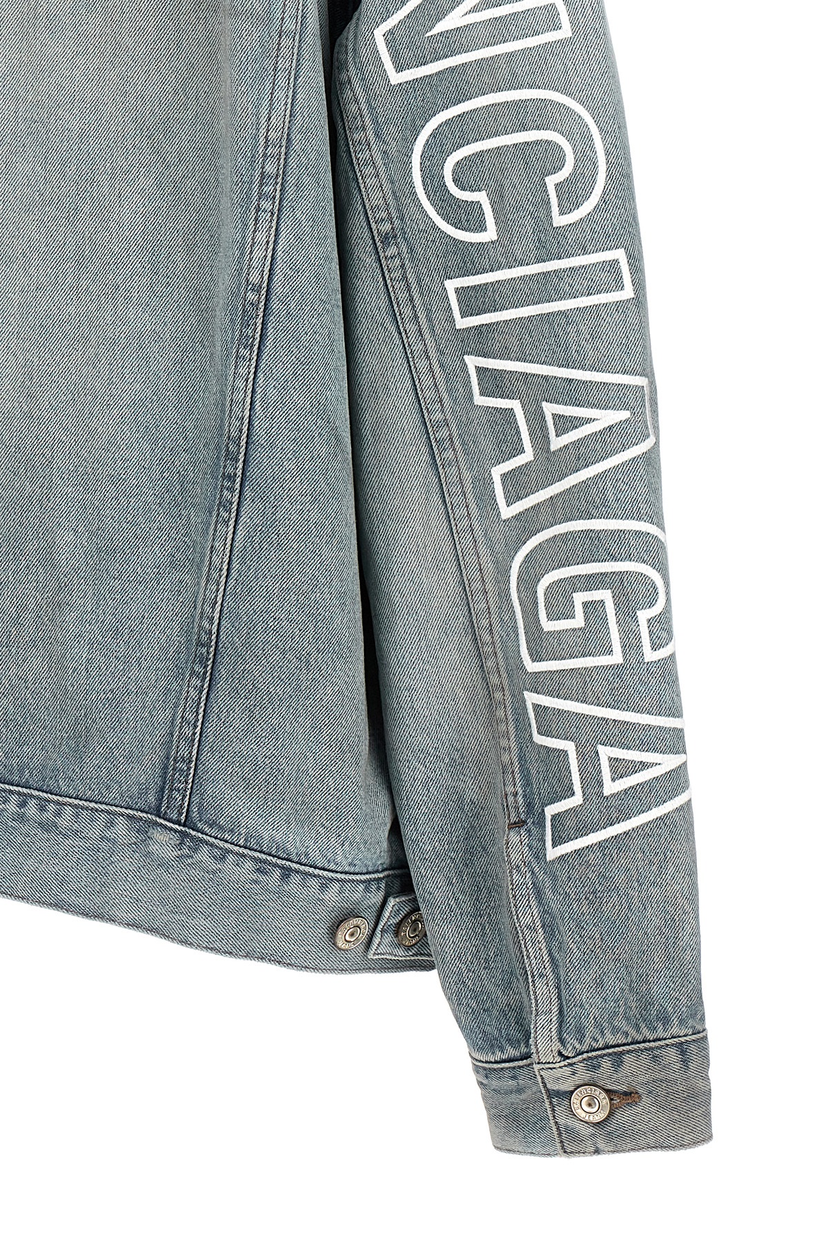 Cotton denim jacket with logo embroidery, button closure, pockets, long cuffed sleeves.