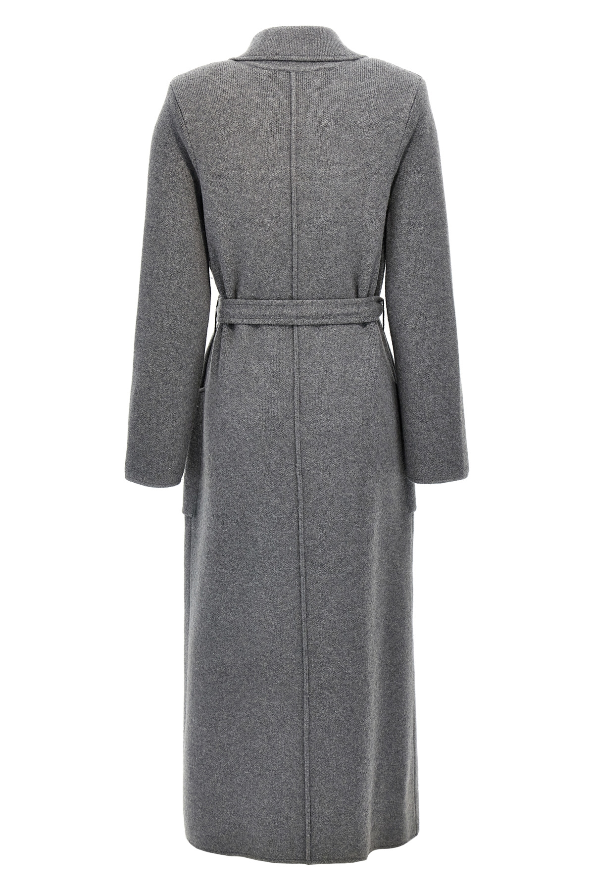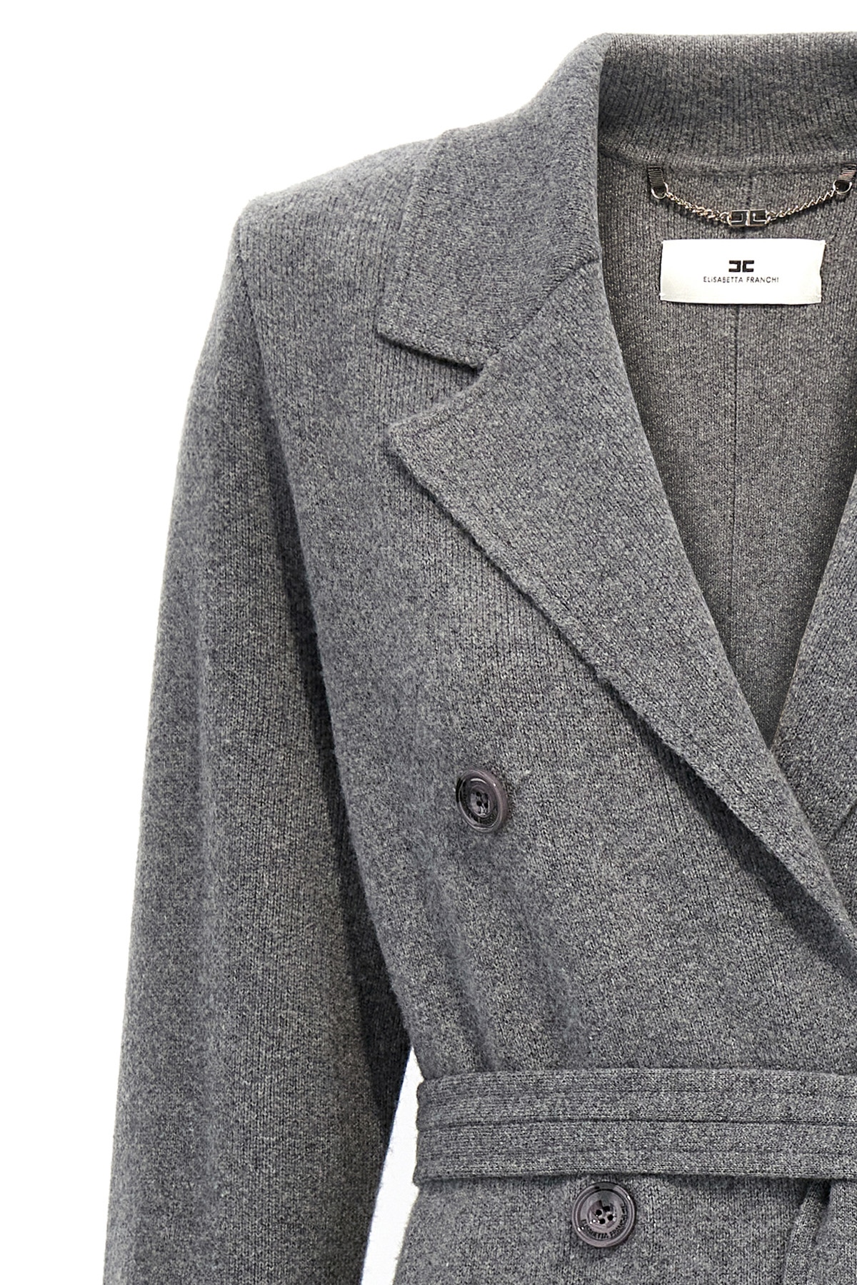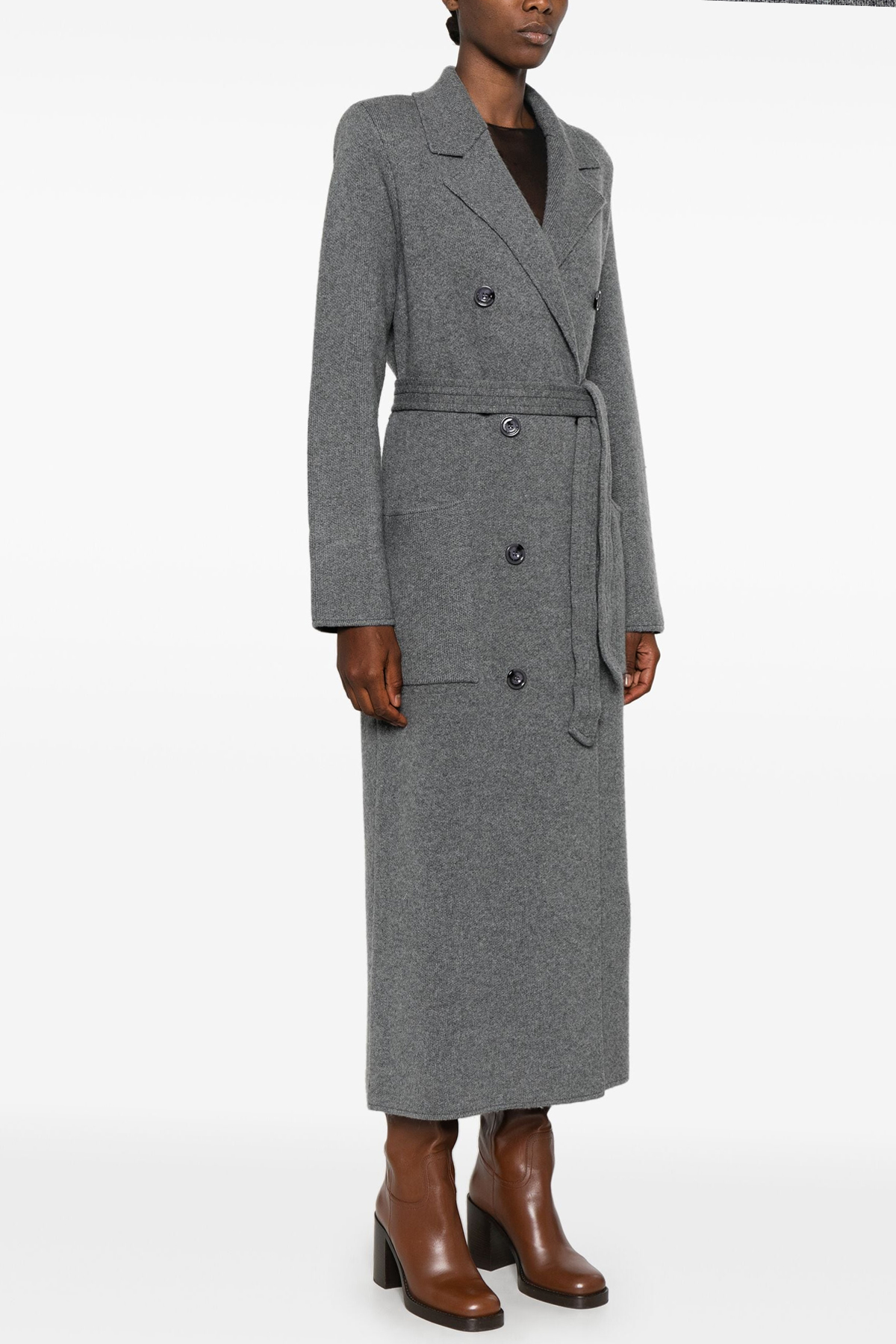 Double-breasted wool and cashmere knit coat with button closure, belt at the waist, pockets, front logo embroidery, long sleeves.