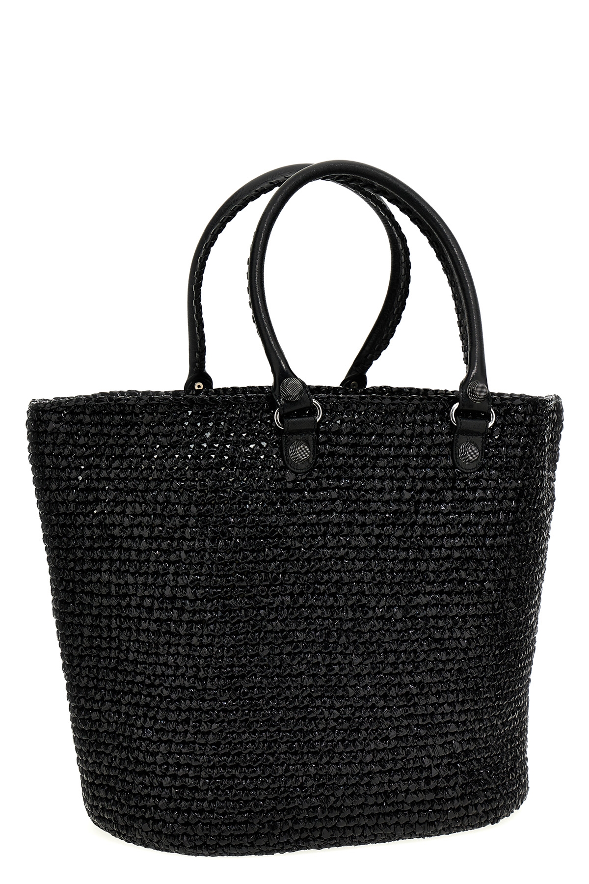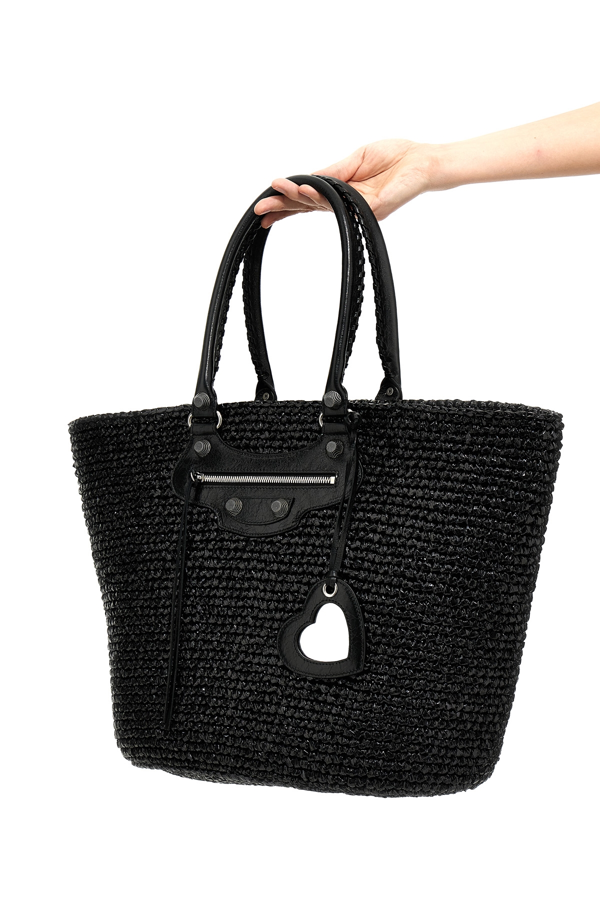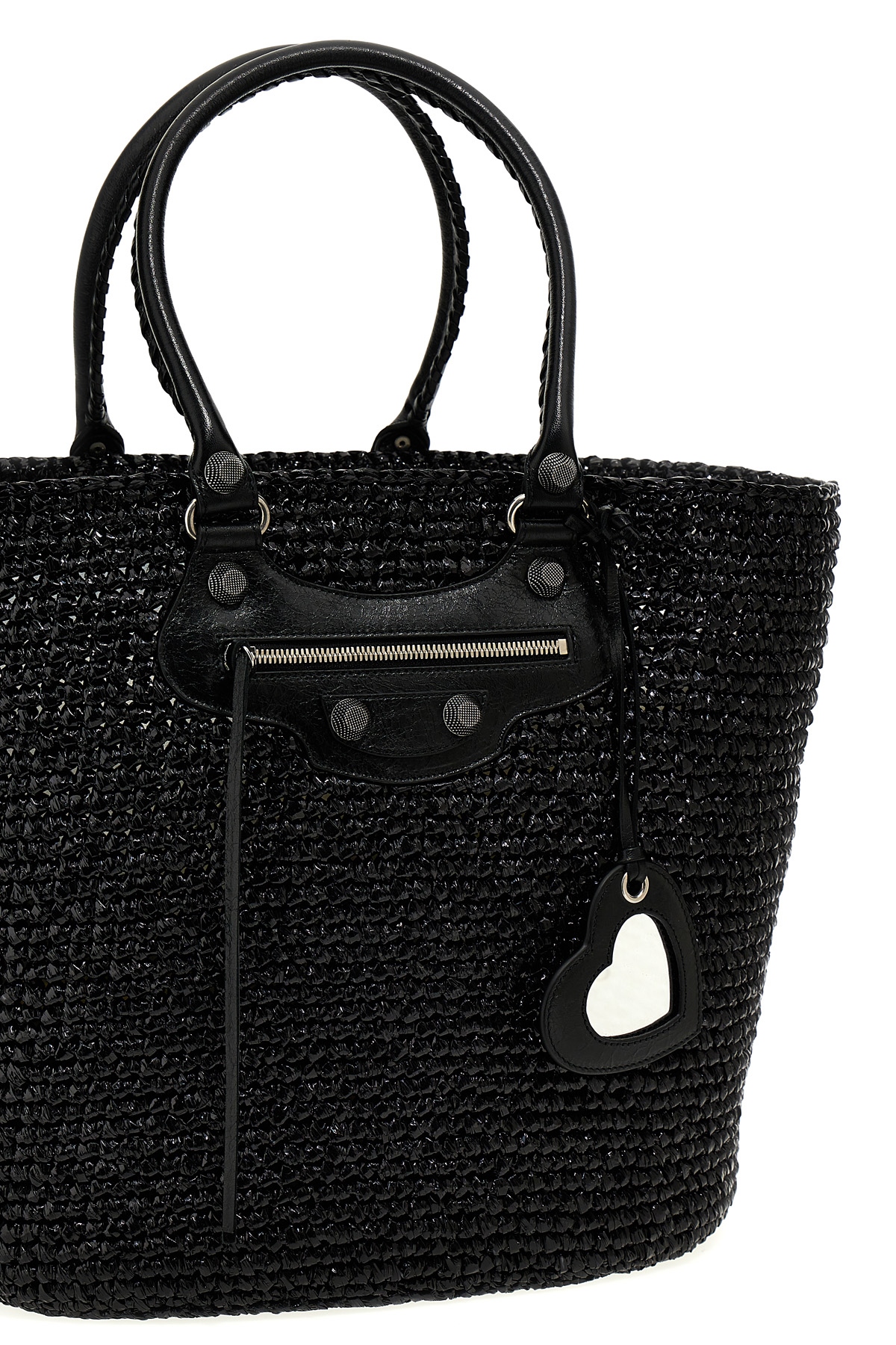 'Le Cagole Panier' raffia large shopping bag with double leather handle and stud embellishment, removable heart-shaped mirror.